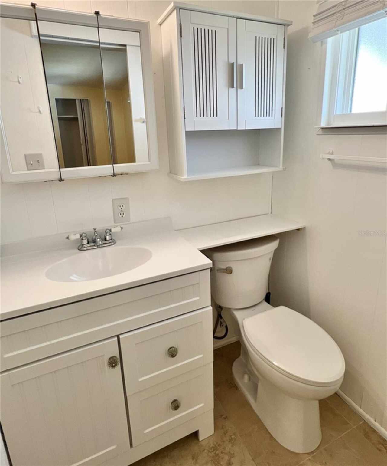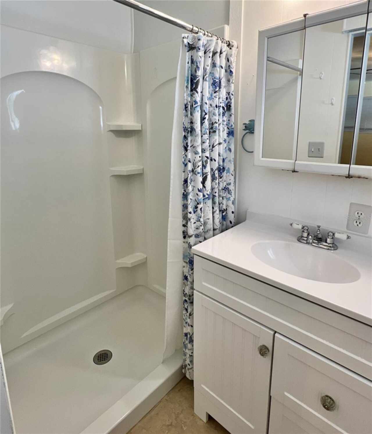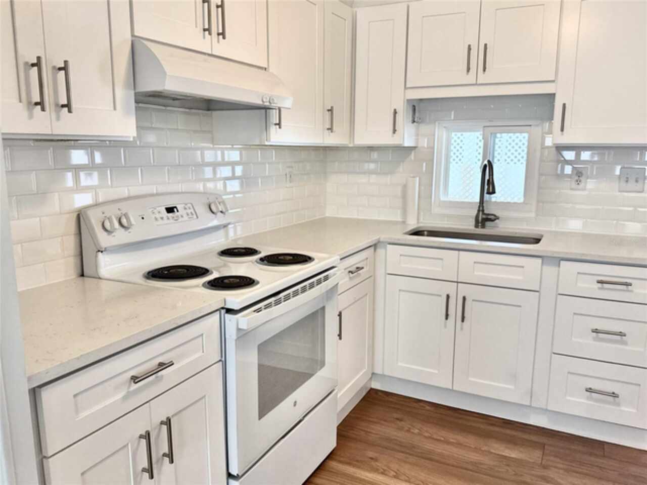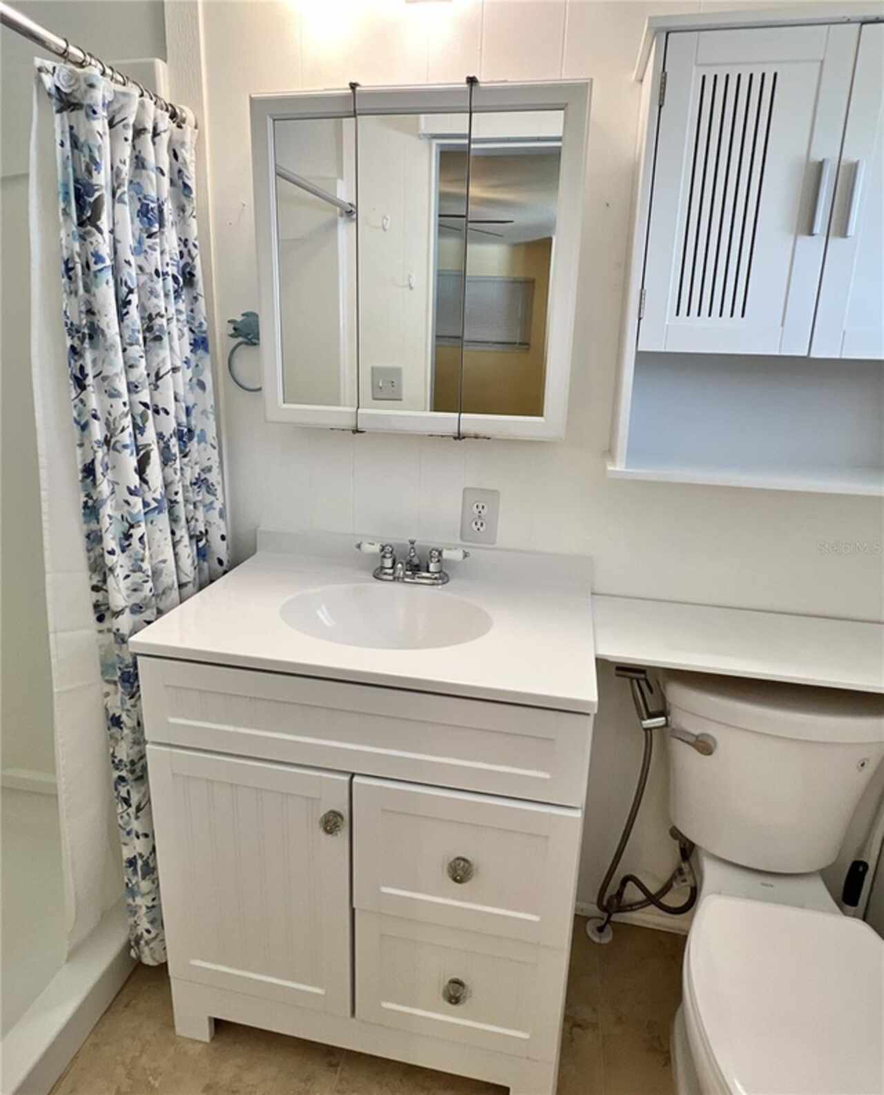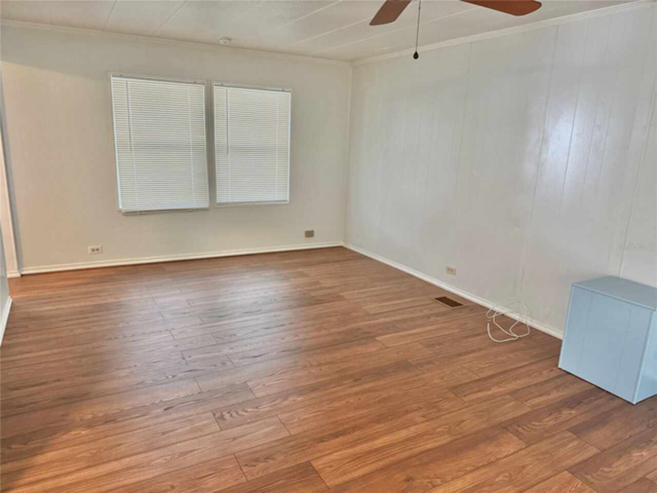 This totally updated home with more than 1, 100 sq. ft of living space includes a beautifully finished 200 sq ft Florida room with laminate flooring, drop ceiling and Bahama shutters that can be used as an office/hobby or additional living space. This appealing home is located within a short walk to the community's waterfront park with fishing dock on a saltwater canal--relax and watch the dolphins and manatee play or go fishing! The home was updated in 2022 and features a remodeled kitchen with new soft close Shaker cabinets and drawers, sparkling quartz countertops and ceramic tile backsplash; 2022 Whirlpool refrigerator and GE stove, stainless steel farmhouse sink and gooseneck spout; 2022 HVAC is high-end American Standard 2.5 ton package unit with heat and air; 2022 tilt-in double paned windows throughout for easy cleaning; updated baths in 2023 includes new cabinet and sink with quartz counter top and tub/shower combo in guest bath and new cabinets and sink with walk-in shower in master bath and tile floors in both baths. 2016 roof over has 20-year transferrable warranty. Newer water heater--about 4 years old. New plywood subfloors and waterproof wide plank laminate flooring installed in all rooms (except Florida room which has cement subfloor) in mid April 2025. New laminate flooring has Lifetime Warranty. Dining and living room area have crown molding and baseboards. Interior paint in pastel colors completed in 2023-2024. Backyard paver patio for barbecuing and relaxing. Ring door bell included. Long carport handles two cars easily and driveway has been resurfaced. Utility shed has 2025 washer and dryer with overhead fluorescent light. Clamshell awnings and Bahama shutters on windows for wind protection. Mature landscaping give finishing touches to the property, and there is a sprinkler system in place with water supplied by the Co-op. Termite treatment in 2024 with transferable warranty. Price includes share for the lot and ownership in the Co-op. Low monthly maintenance fee of $380 includes water/sewer/trash pick up/ 24 hr manned gate/lawn mowing/private streets/heated pool/fitness/billiards/clubhouse and so much more. Two dogs or cats up to 35 pounds are welcomed; two pets total each household. Americana Cove is conveniently located to downtown St. Petersburg (10 mins away), two airports (15 mins away) and beaches (25 mins away). Don't miss this move-in ready home!