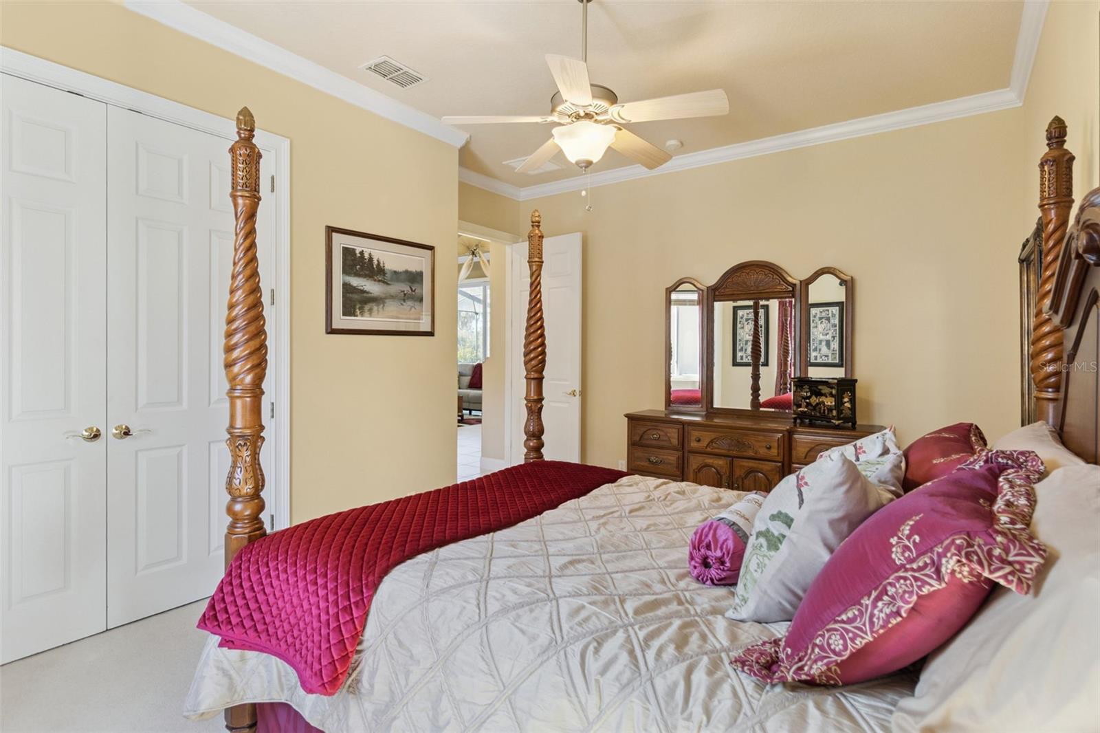 685 Whisper Woods is a carefully maintained 4 bedroom, 3.5 bath home with 4208 square feet blending thoughtful design with premium upgrades throughout. Situated on the 5th hole of the Eaglebrooke golf course, it is a private retreat in a suburban setting. When you enter through the raw iron double doors you will notice the custom tile work and crown molding that accents the open living and dining spaces. The chef's kitchen is a modern design with cherry cabinets, hosting all stainless steel appliances and a generous pantry. In close proximity a full walkup wet bar. The owner’s suite features a luxurious bath with a high-end spa shower, jetted tub, and recent granite counters. It extends through to a space perfect for an exercise retreat or nursery. Guest bedrooms provide flexibility, with one optional bay window bonus room perfect for work or relaxation. The laundry area and three full baths are modernized, while closet systems and custom cabinetry enhance storage. Light flows into the home from insulated, tinted Low-E windows and sliders, leading to an outdoor living area with an extended travertine patio, spa and pool, and a fully equipped outdoor kitchen with an infrared grill and outdoor refrigerator. The home includes a marble gas fireplace in the main living space for the perfect ambiance. Recent upgrades like a beehive smart sprinkler system, fresh paint, rain gutters, newer water heater, Ring security, epoxy garage floor, and custom media storage deliver worry-free, move-in ready comfort. With its attached 3 car garage, fresh landscaping, and premier location in Eaglebrooke—a gated semi-private golf community featuring tennis, pool, dining, and top-rated schools—this home is functional, luxurious, and distinguished, a perfect fit for those looking for a resort lifestyle in South Lakeland.