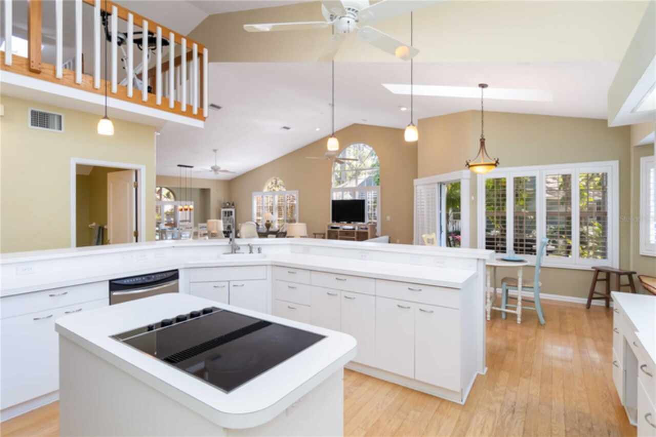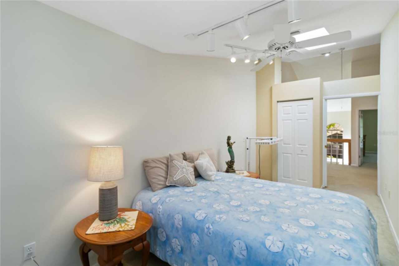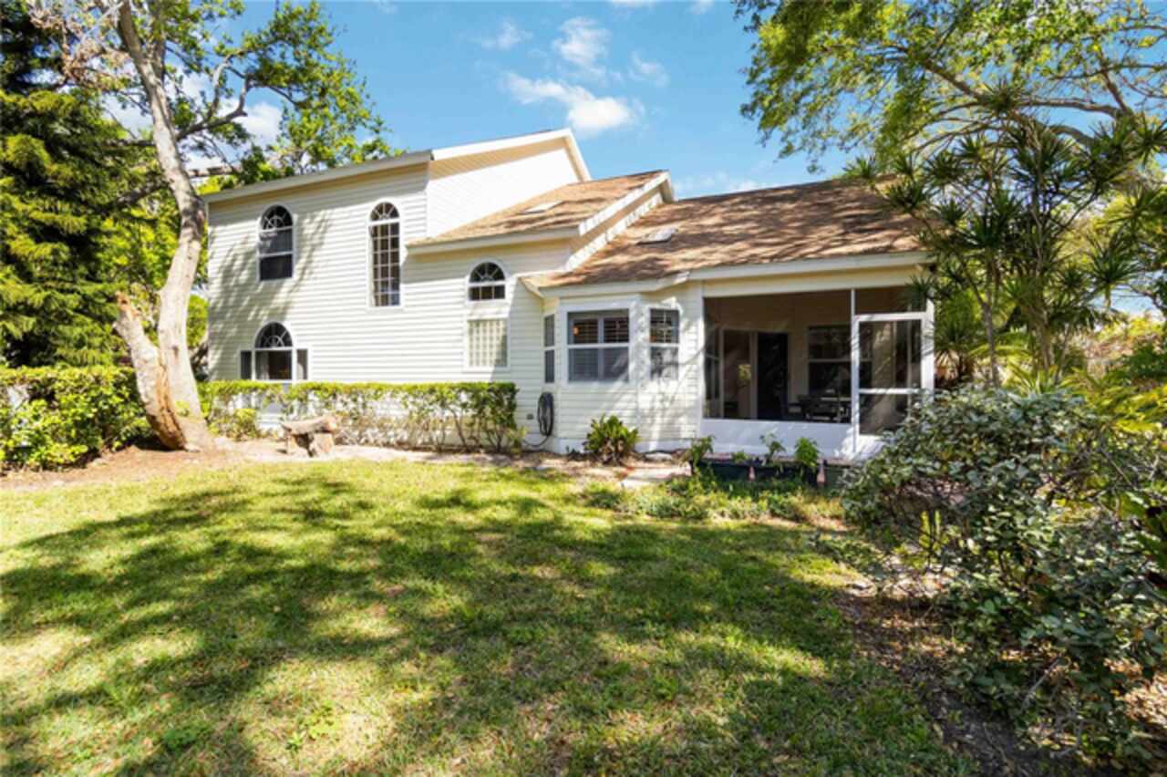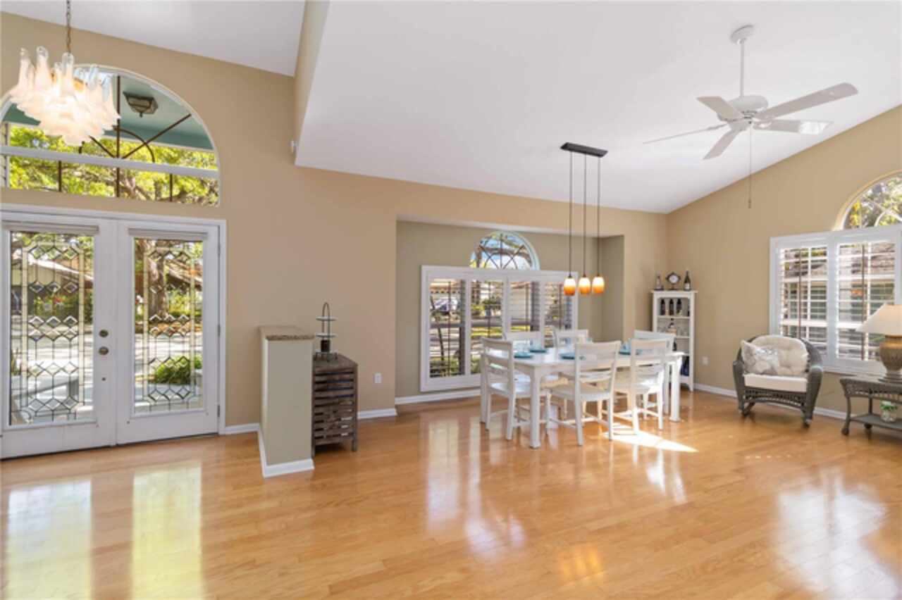 Welcome to this charming two-story home, offering over 3, 000 square feet of beautifully designed living space in the quaint, tree-lined neighborhood of Arbor Oaks. Surrounded by majestic oak trees, and nestled in a cul-de-sac, this home provides a serene and picturesque setting while still being conveniently located near shopping, dining, and minutes from the stunning beaches of Anna Maria Island. Fresh interior paint and new carpet installed in all bedrooms. Inside, you'll find a spacious and inviting floor plan featuring real wood floors throughout the large living space. With soaring cathedral ceilings, you're instantly greeted with an open and airy ambiance that beautifully showcases this one of a kind floorplan. The large kitchen boasts ample cabinetry and large island which is perfect for cooking and entertaining. The primary suite located on the main floor is a true retreat with an ensuite bath and a large walk-in closet. Other charming features include a laundry chute, central vacuum, skylights and large radius windows letting in so much light. The loft space on the second floor adds additional flex space. Enjoy relaxing evenings on the covered patio, overlooking the lush backyard shaded by beautiful oaks. Even more, the community pool is just steps away from your screened lanai, so you have the convenience of a private pool in your back yard but without the maintenance. With its charming curb appeal, ample space, and peaceful surroundings, this home is a rare find.