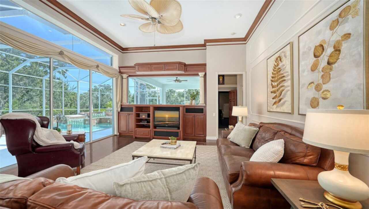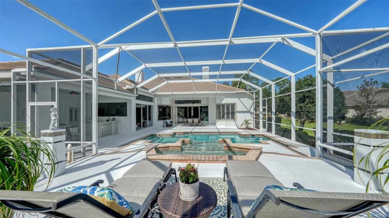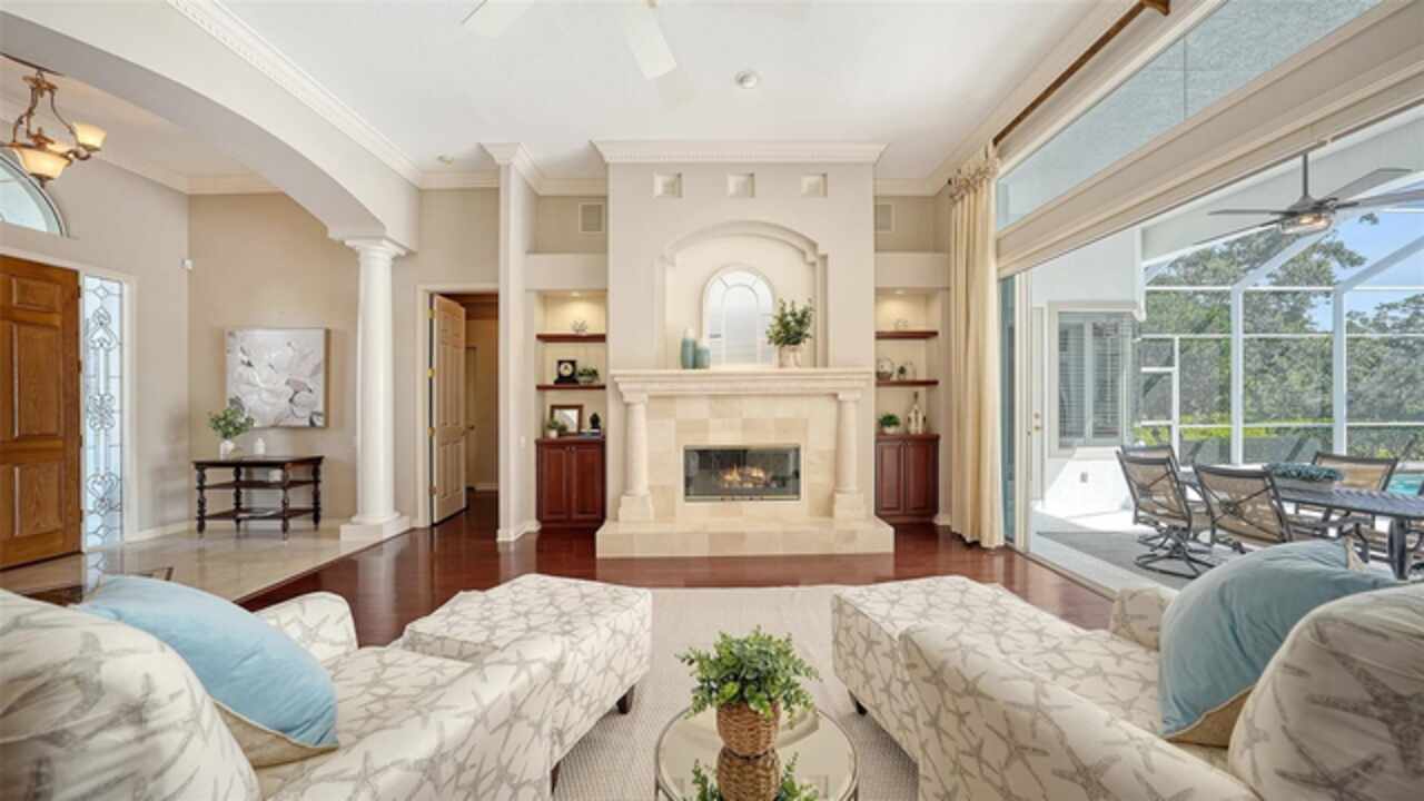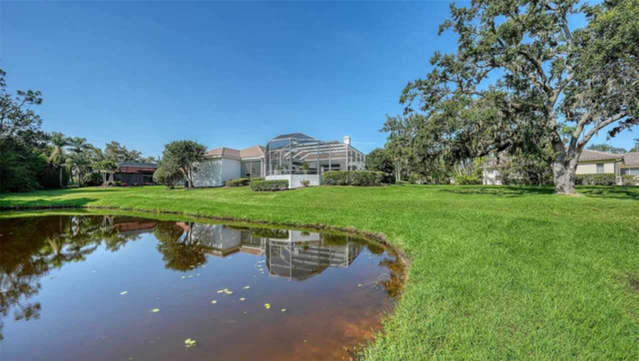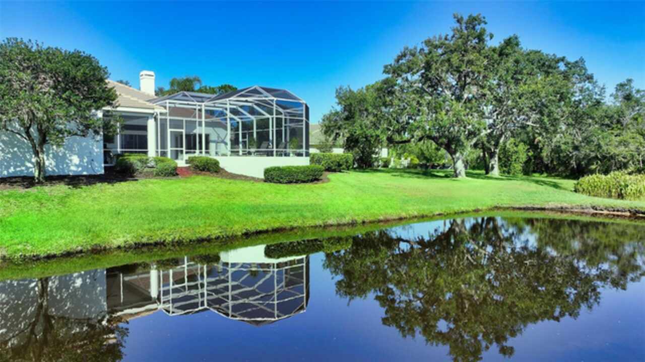 Tucked away on nearly 1.5 acres at the end of a quiet cul-de-sac, this beautifully updated River Club residence offers timeless style and classic Florida living with serene lake and preserve views. A new roof and freshly painted exterior enhance the home’s curb appeal, while a circular driveway welcomes you to a thoughtfully designed interior. The 3, 662 sq ft split-bedroom layout includes three bedrooms, three full baths, and a dedicated home theater with platform seating, 11-foot screen, and impressive surround sound. Rich wood flooring, crown molding, built-in speakers throughout, and custom built-ins add character and comfort, while the kitchen features granite countertops, a prep island with wine fridge, walk-in pantry, and a spacious dinette framed by an aquarium window. Ideal for entertaining, the living room showcases a fireplace with built-in shelving and storage, full wet bar, and flows seamlessly into the dining room. Sliding glass doors from both the living and family rooms open to a showstopping tri-level screened lanai with pool and spa, all overlooking the tranquil natural backdrop. The primary suite is a private retreat with lanai access, plantation shutters, two walk-in closets, and a luxurious bath with soaking tub, walk-in shower, dual vanities, private water closet, and linen closet. Set within the established community of River Club, this exceptional home offers easy access to the world-renowned Gulf Coast beaches, the shopping, dining, and entertainment venues of Lakewood Ranch and Sarasota, top-tier medical facilities and A-rated schools.