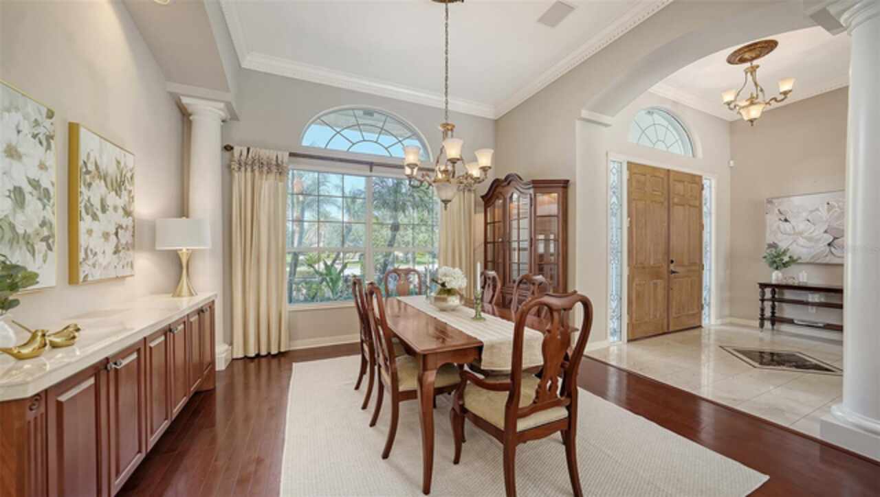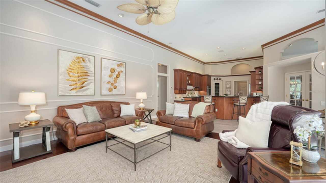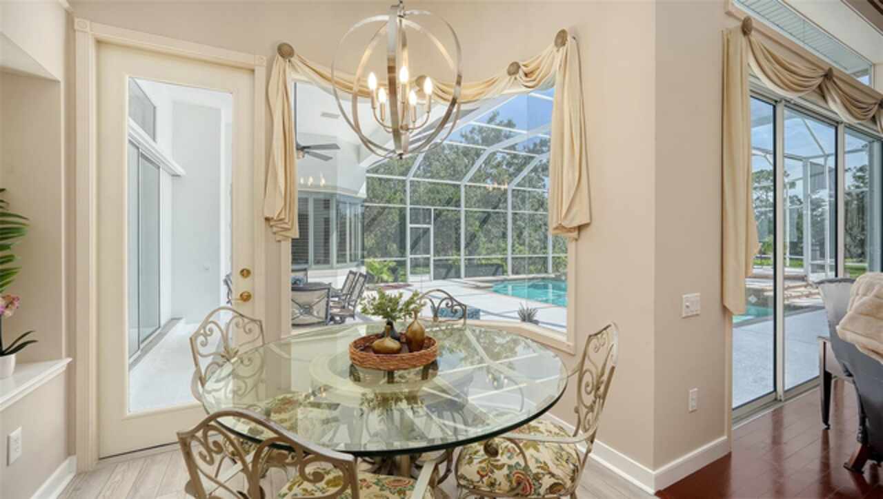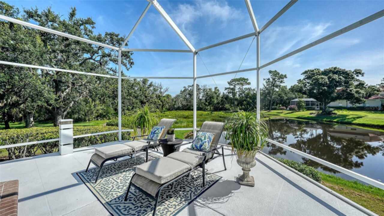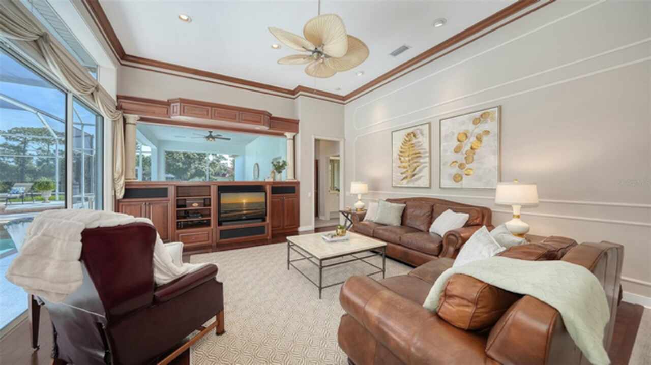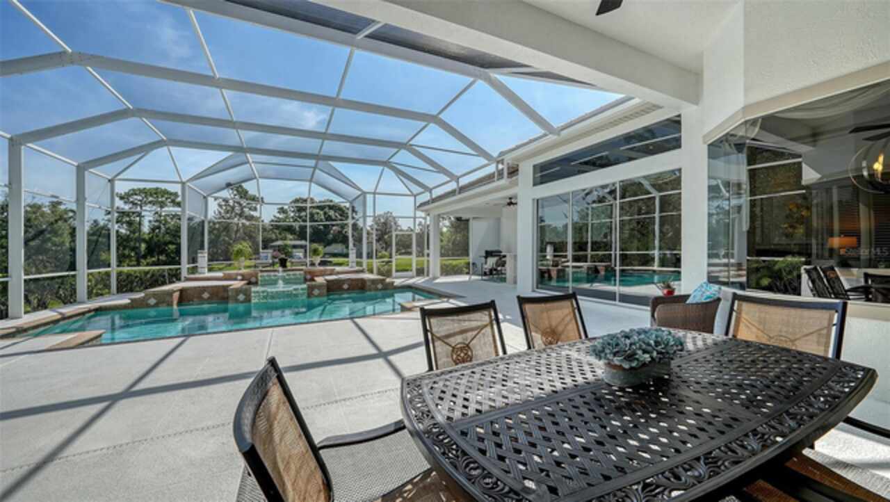 Tucked away on nearly 1.5 acres at the end of a quiet cul-de-sac, this beautifully updated River Club residence offers timeless style and classic Florida living with serene lake and preserve views. A new roof and freshly painted exterior enhance the home’s curb appeal, while a circular driveway welcomes you to a thoughtfully designed interior. The 3, 662 sq ft split-bedroom layout includes three bedrooms, three full baths, and a dedicated home theater with platform seating, 11-foot screen, and impressive surround sound. Rich wood flooring, crown molding, built-in speakers throughout, and custom built-ins add character and comfort, while the kitchen features granite countertops, a prep island with wine fridge, walk-in pantry, and a spacious dinette framed by an aquarium window. Ideal for entertaining, the living room showcases a fireplace with built-in shelving and storage, full wet bar, and flows seamlessly into the dining room. Sliding glass doors from both the living and family rooms open to a showstopping tri-level screened lanai with pool and spa, all overlooking the tranquil natural backdrop. The primary suite is a private retreat with lanai access, plantation shutters, two walk-in closets, and a luxurious bath with soaking tub, walk-in shower, dual vanities, private water closet, and linen closet. Set within the established community of River Club, this exceptional home offers easy access to the world-renowned Gulf Coast beaches, the shopping, dining, and entertainment venues of Lakewood Ranch and Sarasota, top-tier medical facilities and A-rated schools.