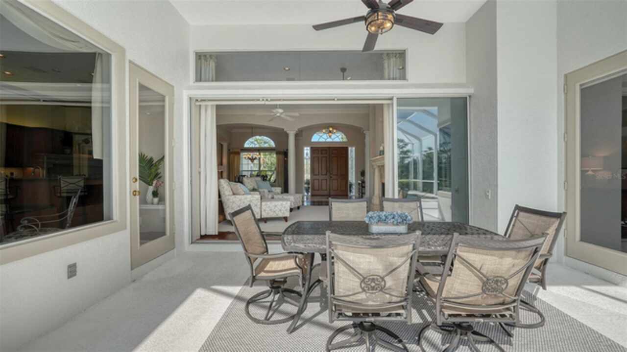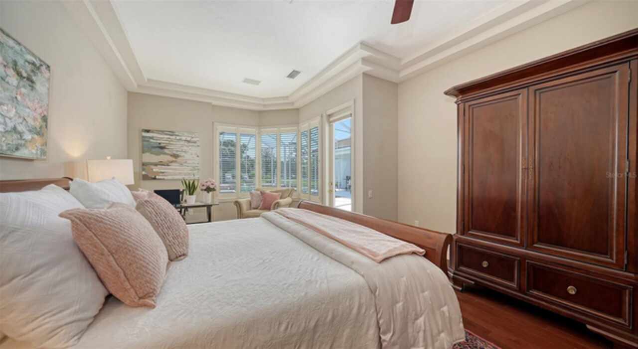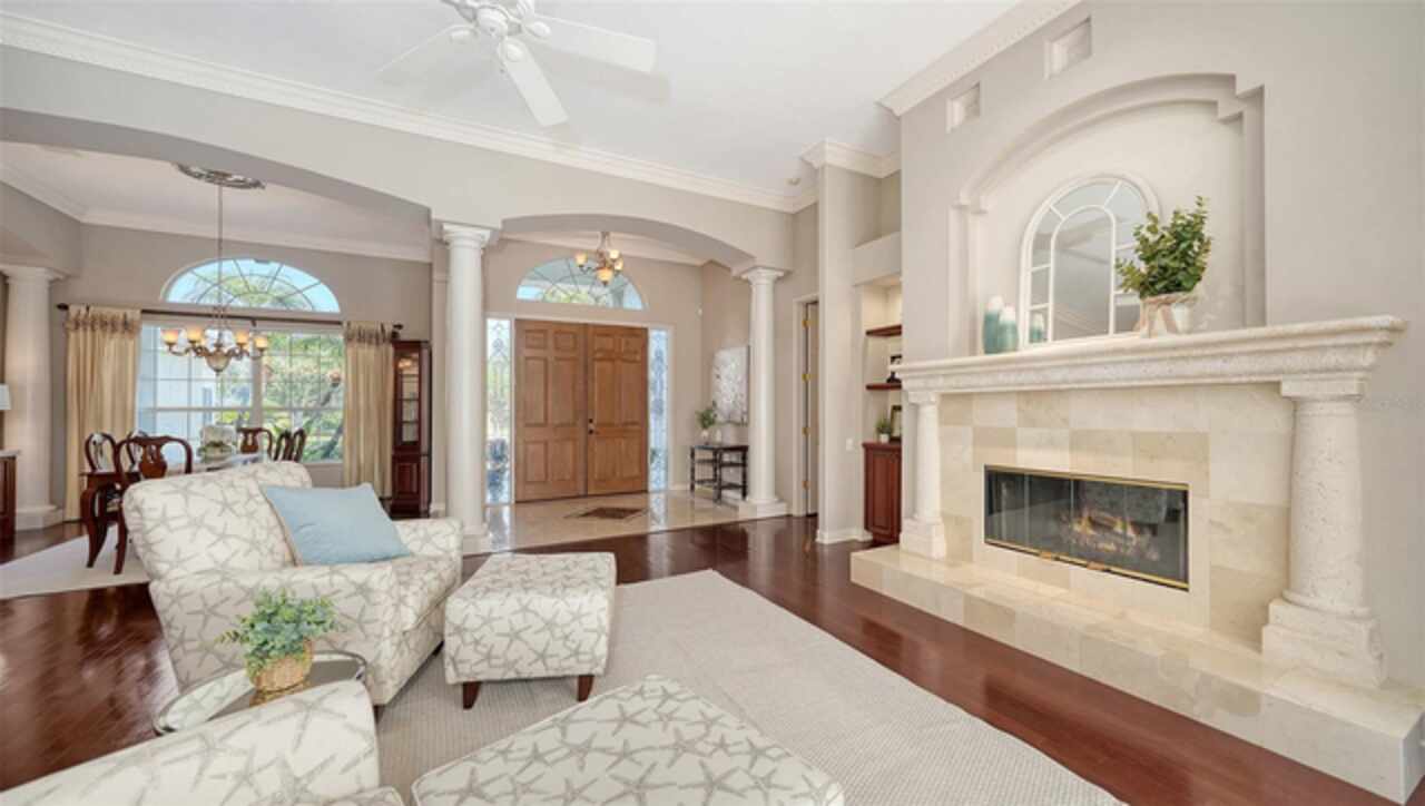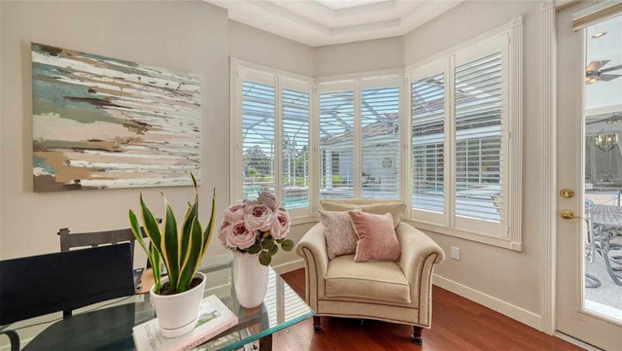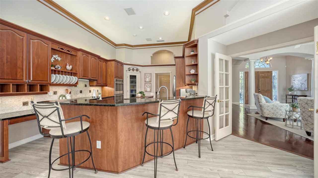 Tucked away on nearly 1.5 acres at the end of a quiet cul-de-sac, this beautifully updated River Club residence offers timeless style and classic Florida living with serene lake and preserve views. A new roof and freshly painted exterior enhance the home’s curb appeal, while a circular driveway welcomes you to a thoughtfully designed interior. The 3, 662 sq ft split-bedroom layout includes three bedrooms, three full baths, and a dedicated home theater with platform seating, 11-foot screen, and impressive surround sound. Rich wood flooring, crown molding, built-in speakers throughout, and custom built-ins add character and comfort, while the kitchen features granite countertops, a prep island with wine fridge, walk-in pantry, and a spacious dinette framed by an aquarium window. Ideal for entertaining, the living room showcases a fireplace with built-in shelving and storage, full wet bar, and flows seamlessly into the dining room. Sliding glass doors from both the living and family rooms open to a showstopping tri-level screened lanai with pool and spa, all overlooking the tranquil natural backdrop. The primary suite is a private retreat with lanai access, plantation shutters, two walk-in closets, and a luxurious bath with soaking tub, walk-in shower, dual vanities, private water closet, and linen closet. Set within the established community of River Club, this exceptional home offers easy access to the world-renowned Gulf Coast beaches, the shopping, dining, and entertainment venues of Lakewood Ranch and Sarasota, top-tier medical facilities and A-rated schools.