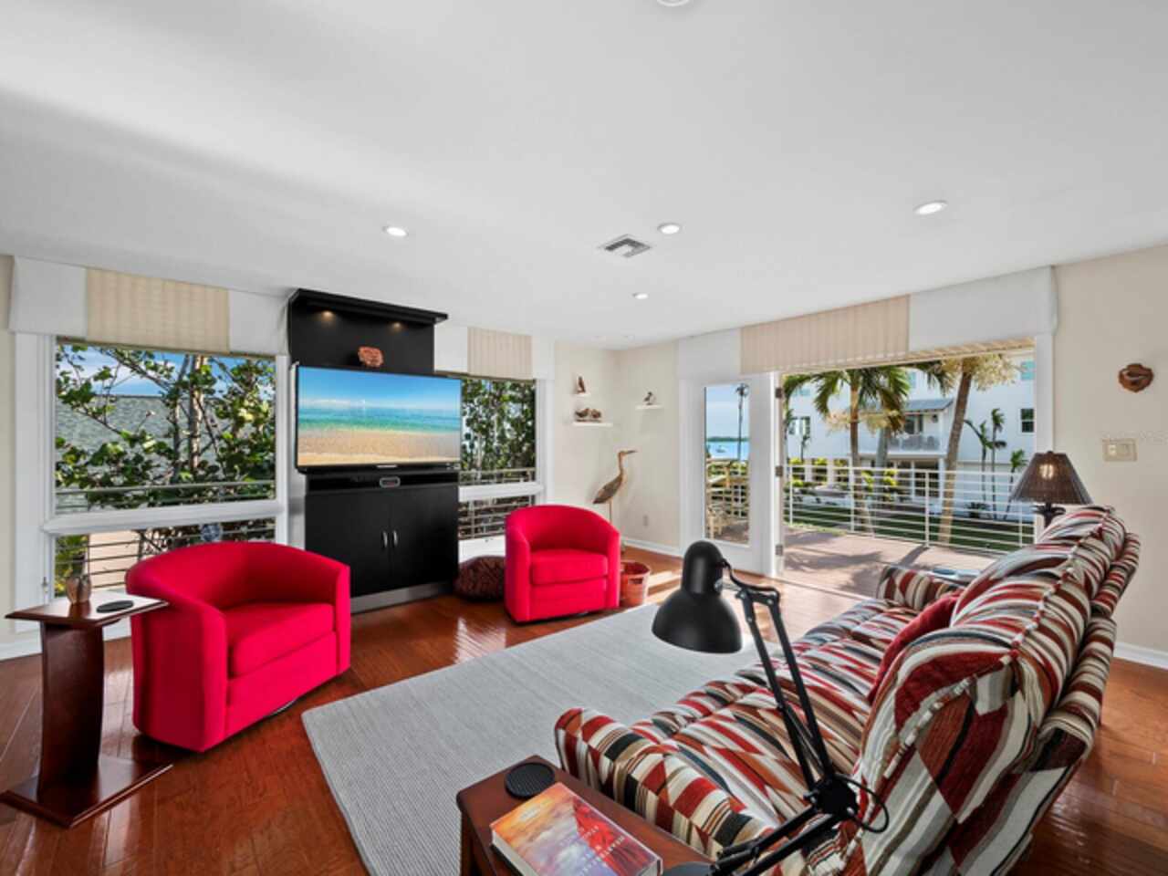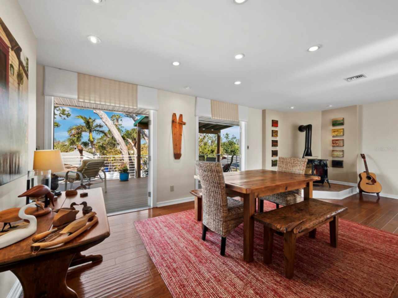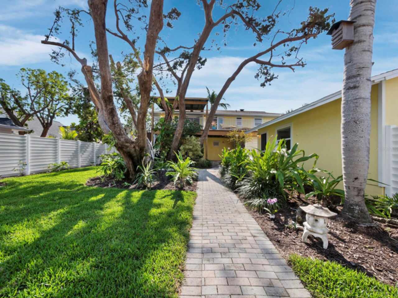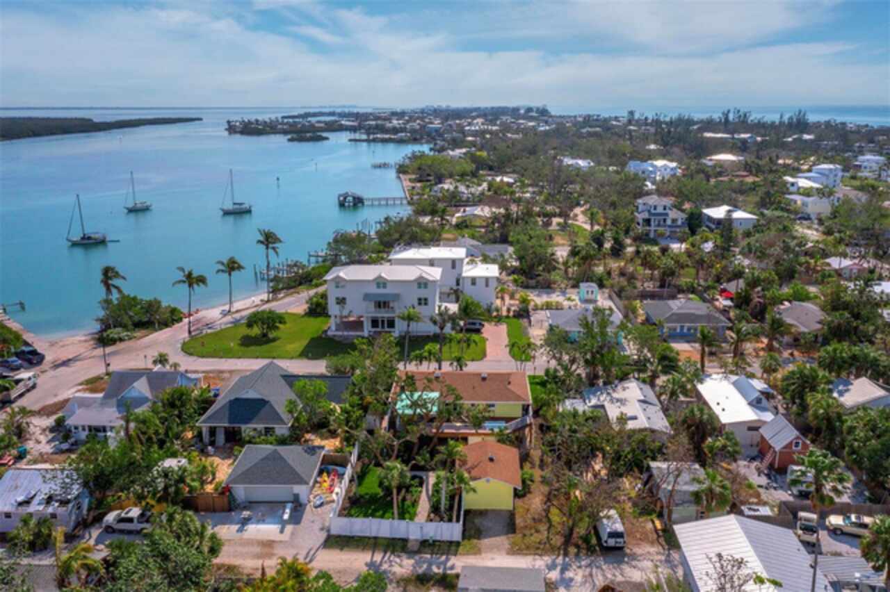 HUGH PRICE REDUCTION!!!Welcome to historic Longbeach Village, the first neighborhood, established on Longboat Key in 1885. As you enter The Village you will notice a variety of architectural home styles from the 1930s to the present day reflecting the diversity of the folks who live here. This wonderful home has stunning water views of Sarasota Bay, The Village harbor with its small public beach, the town dock, and the boat ramp all of which serve as community gathering spots to launch your boat, kayaks, canoes, and view sunrises, sunsets, dolphins, manatees, and aquatic birds. Pelicans love this placid harbor. Capture and immerse yourself in these magical surroundings from the spacious elevated second level front deck. The open concept great room with the three sets of French doors and seven windows is flooded with natural light. The kitchen offers bay views and will be the envy of amateur as well as gourmet cooks. Here you will enjoy a Sub-Zero refrigerator, two drawer Sub Zero freezer, Wolf 5 burner range, large Wolf oven, Miele steam oven, Tanzanian granite counter tops, custom German cabinets, large and deep storage drawers, workstation, and travertine floors. The great room includes an abundance of recessed lighting and a free-standing wood burning fireplace on a raised hearth as well as a dining area with a distinctive wood table, benches, and chairs. The primary bedroom has water views, access to the wrap around deck through sliding glass doors, and a large walk-in closet, en-suite bathroom with striking wood vanity and marble-like glass sink and dual rainfall shower heads. The powder room off the great room has high end fixtures. The guest bedroom has twin beds, a ceiling fan and rolling shades to keep the light out. The adjoining room could function as an office, art studio, or an extra bedroom. The bathroom has a shower stall and a walk-in closet. The oversized two car garage has hurricane reinforced doors, windows, a work bench, ample shelving throughout and peg boards for tools. A composite “wood” deck that is impervious to rot and insects, surrounds the entire house creating massive outdoor living space. The back deck, overlooking a beautifully landscaped yard, has a heated hot tub, a dining area which has a new awning, and a staircase leading to the backyard, guest house/studio, and new two-person barrel sauna in 2023. The guest house/studio was totally renovated by current owners in 2015 with new Hardi Board siding and insulation. It could also serve as a recreation room with pool table etc. All windows throughout the structures are hurricane compliant. Meticulous and impeccable pride in ownership can be found in every detail throughout! From this lovely home you can walk to the beach, five restaurants, and Whitney Beach shopping center. The Centre Shops with dining, boutiques, hair salon, UPS store are about three miles south. Bradenton Beach, with its multiple attractions, is less than 1 mile north. Famous St. Armands Circle is eleven miles south. The Villagers meet once a month from October to April for socializing and gathering updates on LBK activities. Offered furnished, completely outfitted, and move in ready excluding original artwork and some personal items.