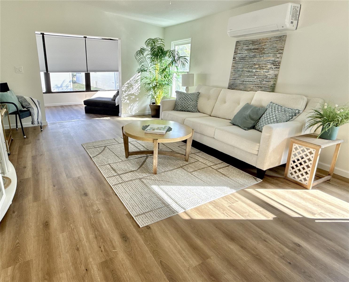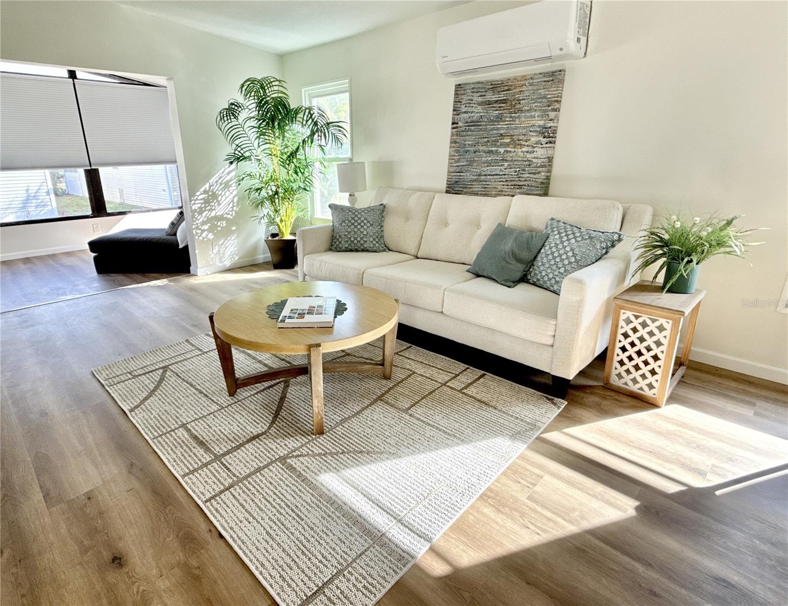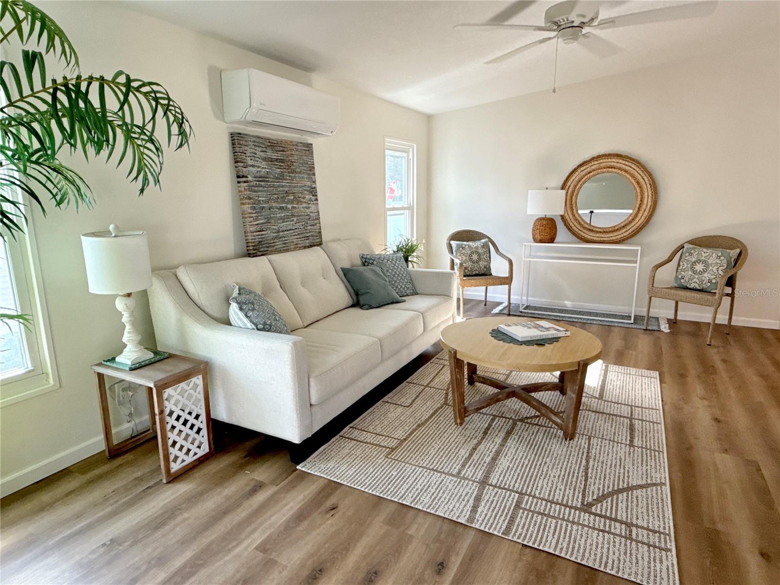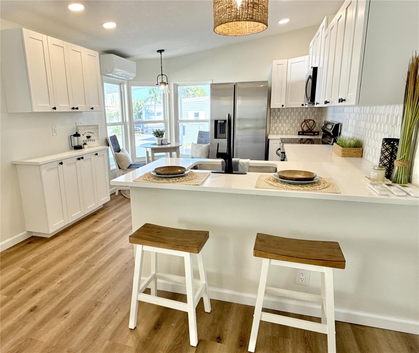 Total transformation! With 1, 340 sq. ft. of living space, this 2 bed/2 bath 1989 home has been expertly remodeled into a stunning home that you would be proud to own! Located on a large lot with long driveway for extra parking, the home features a beautiful large kitchen with room for breakfast table with stainless appliances, quartz countertops and custom wood cabinets; primary bedroom suite has walk-in closet and large all new bathroom with double sinks, step in shower and closet; large guest bedroom has walk-in closet and new bathroom across the hall with walk-in shower and separate utility area with washer and dryer; separate dining area and large living space that opens into a 200 sq. ft enclosed Florida room for additional enjoyment. This home does not disappoint! Important 2025 highlights: Five 20 seer rated high-efficiency mini splits throughout keeps the home efficiently cooled/heated; luxury vinyl waterproof flooring throughout--no carpet; drywall throughout with decorator paint in neutral colors; new 2025 windows in kitchen and newer windows throughout home have been inspected and revived to ensure easy opening; vapor barrier under home to protect the subflooring; new plumbing and electrical replaced in kitchen and bathrooms. Home has shingled roof that has been inspected. Fenced area is great when small grandchildren visit. Large utility shed with shelving for extra storage. Price includes share for the lot and ownership in the co-op. Home is located in popular Americana Cove, a 55 and older community with lots of amenities and only 10 mins from downtown St Petersburg and 20 mins to two airports. Low monthly maintenance fee of $380 covers water/sewer, trash pick up, lawn mowing, 24 hr manned gate, private streets and all amenities including heated pool, clubhouse, fitness center, billiards, bocce and so much more! This home does not disappoint!