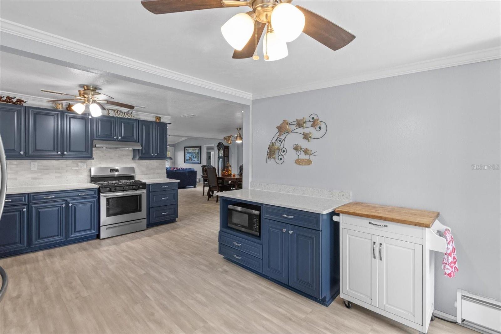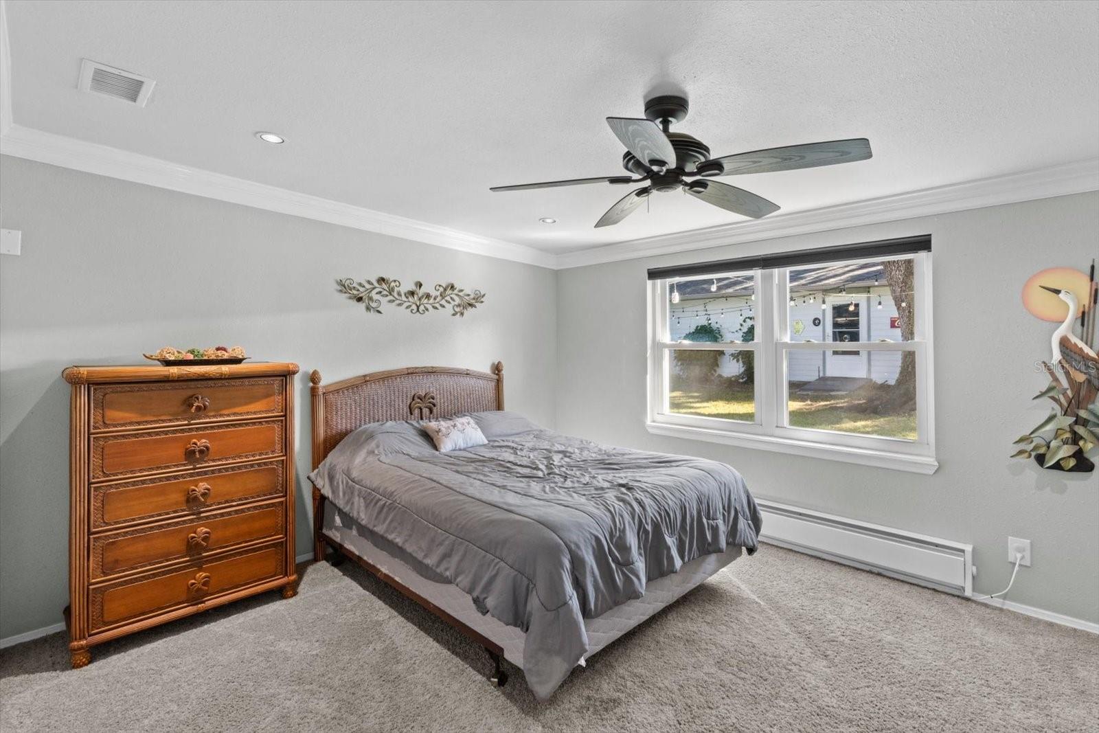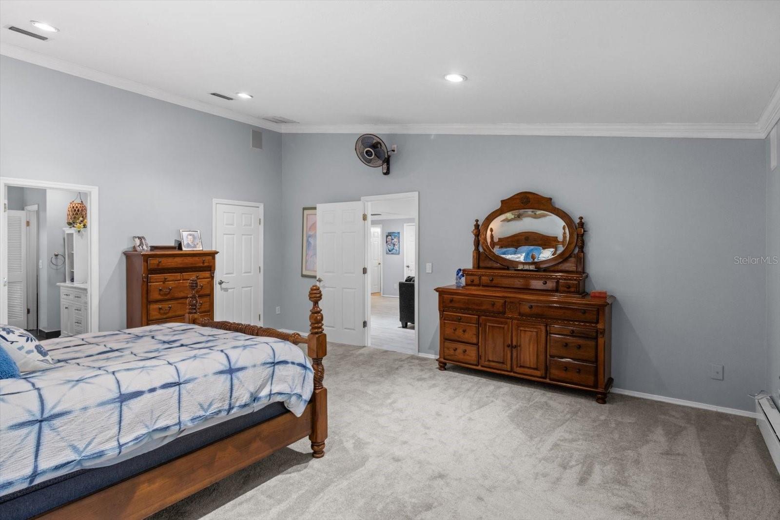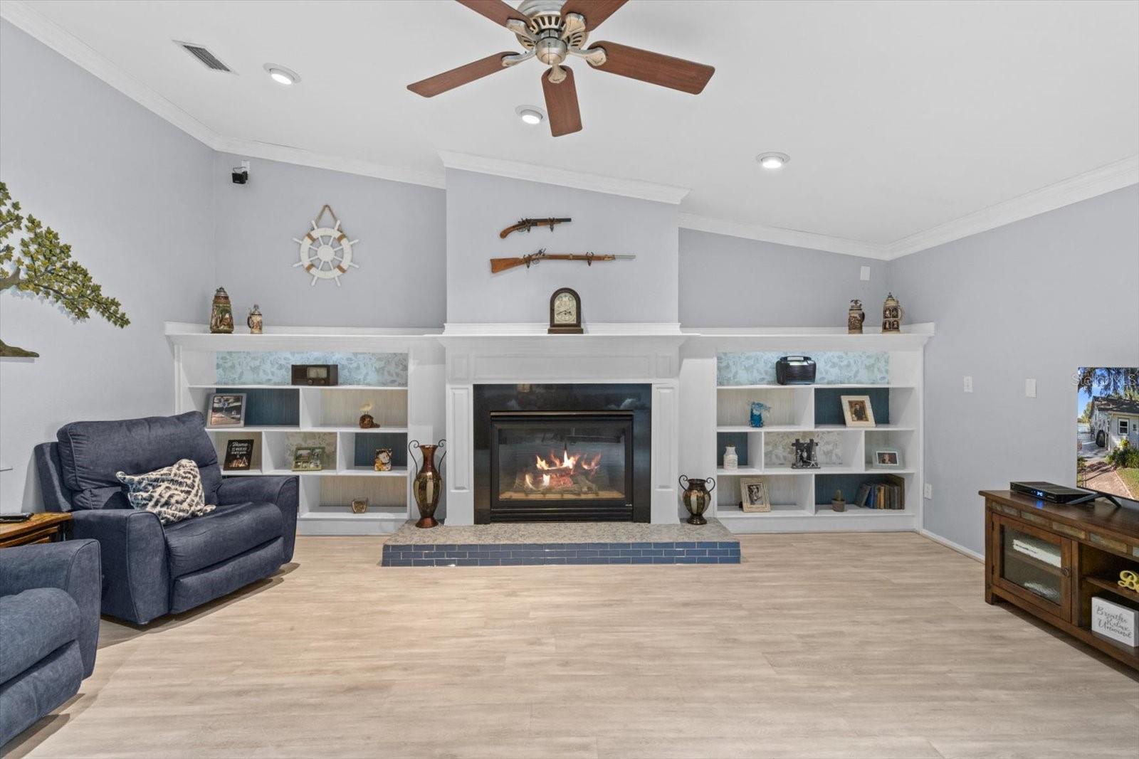 Built-in Features, Ceiling Fans(s), Crown Molding, Primary Bedroom Main Floor, Solid Surface Counters, Solid Wood Cabinets, Stone Counters, Thermostat, Vaulted Ceiling(s), Walk-In Closet(s)
