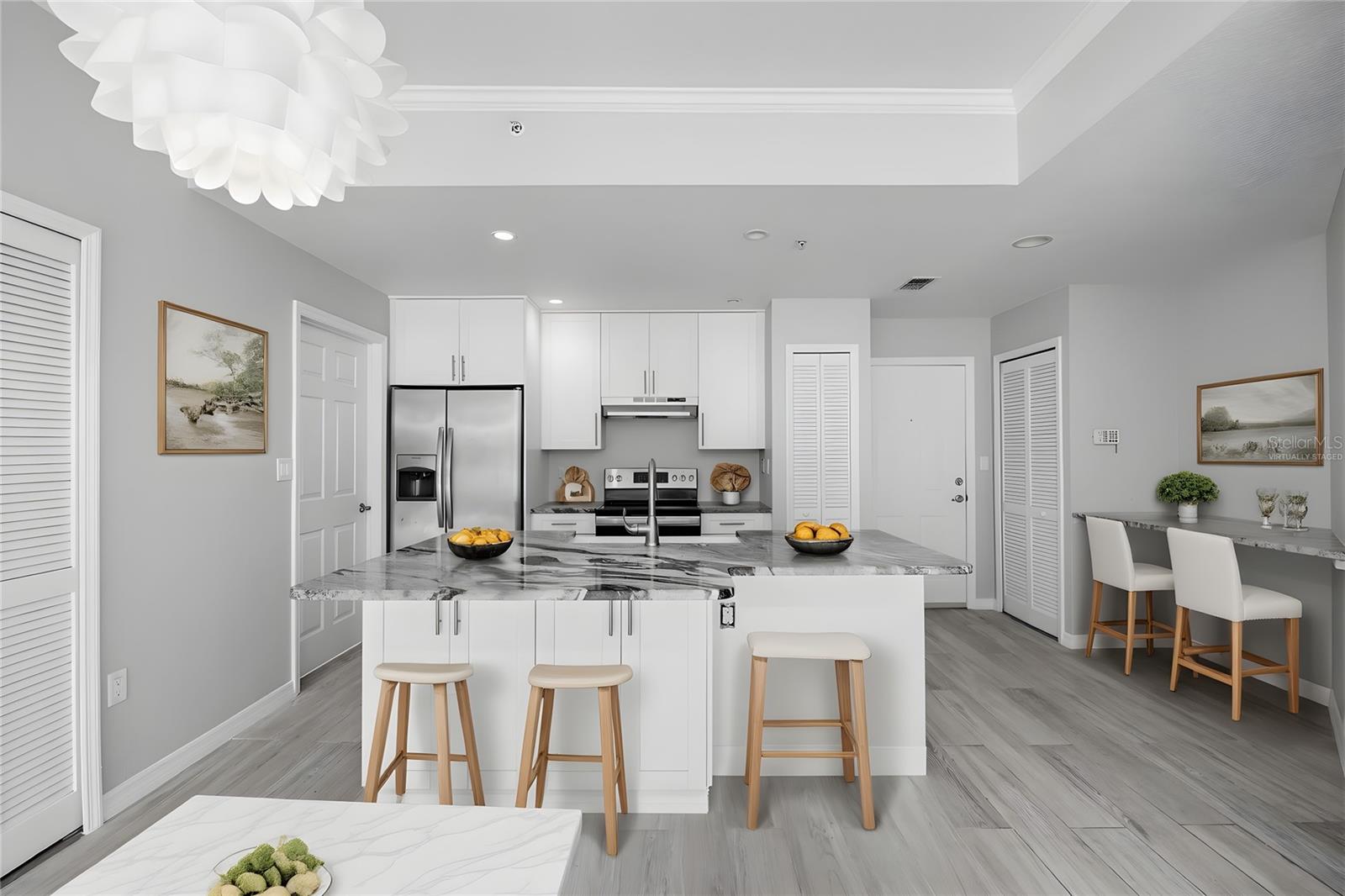 One or more photo(s) has been virtually staged. Experience resort-style living at Parkcrest on Harbour Island in this beautifully updated 2-bedroom, 2-bath condo offering just under 1, 200 sq. ft. of thoughtfully designed space. The open floor plan showcases stylish wood-look tile flooring throughout and a stunning chef’s kitchen with a massive island, soft-close cabinetry, and ample storage. The spacious primary suite features two closets for added convenience, while the second bedroom boasts a generous walk-in closet—perfect for guests or a home office. Set within one of Tampa’s most sought-after waterfront communities, Parkcrest provides 24/7 security, a resort-style pool and spa, fitness center, clubroom, and access to the vibrant Harbour Island lifestyle. Just steps from Tampa’s Riverwalk, Benchmark International Arena, and the best dining and entertainment downtown has to offer, this condo perfectly blends modern comfort with urban convenience.