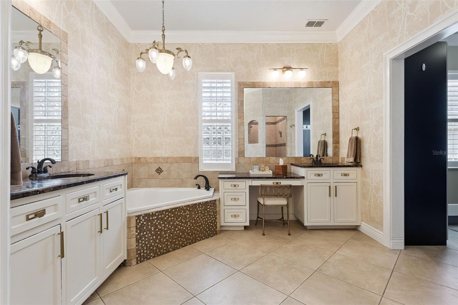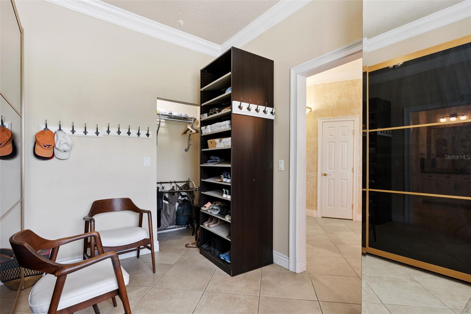 Ceiling Fans(s), Crown Molding, Dry Bar, Eat-in Kitchen, High Ceilings, Kitchen/Family Room Combo, Open Floorplan, Primary Bedroom Main Floor, Solid Surface Counters, Split Bedroom, Stone Counters, Thermostat, Walk-In Closet(s), Window Treatments