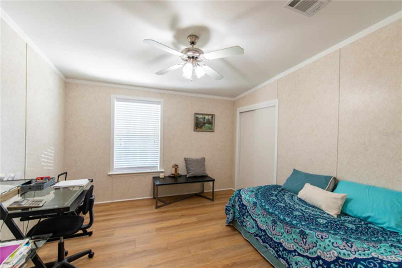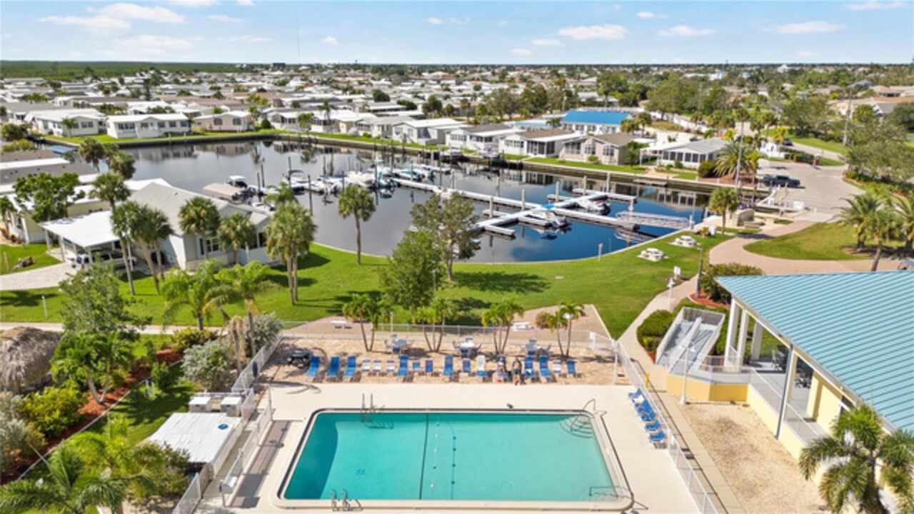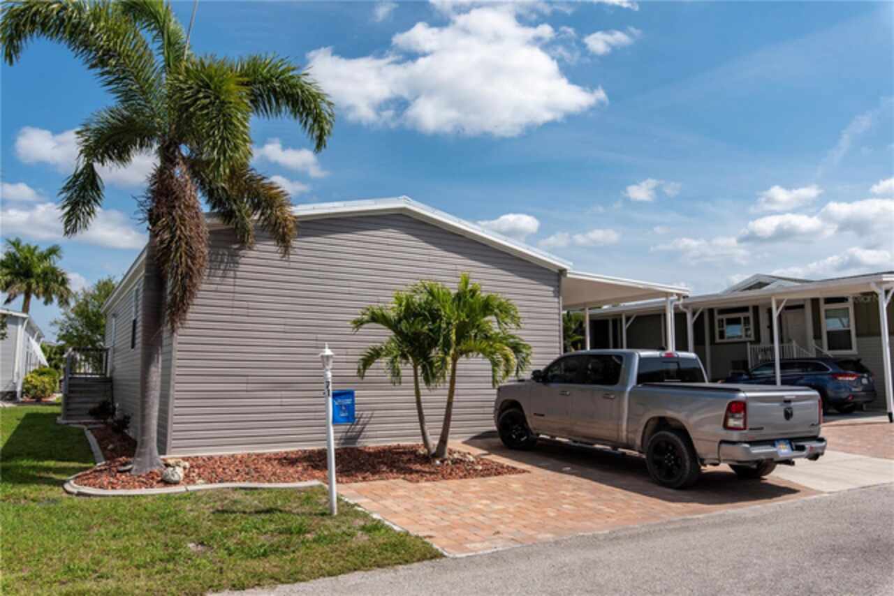 Welcome to the friendly neighborhood of Windmill Village, a resident owned 55+ gated community located in Punta Gorda. This 1, 512 square foot, 2010 Palm Harbor, offers an open floor plan with drywall in the main living area, crown molding and a split floor plan offers two additional bedrooms on the opposite end of the home with a nicely detailed guest bath. The kitchen has a center island with a breakfast bar and GE appliances. The great room includes a dining area and is a bright and light living space. The master suite includes a deluxe master bath with dual vanity sink, soaking tub and shower. In 2023 a new metal roof and all new siding was installed, there is newer vinyl flooring throughout the home. You can access the 15 x 12 screened in porch through the master bedroom or a door at the front of the home. This home features an extra long driveway 40’Long x 12’ Wide x 11’ High (dimensions for buyer to verify) which is ideal for boat storage. New pavers have been put in front and to the right of the home expanding the parking space for cars, boats, camper and golf cart. This active lifestyle community features two private marinas, boat ramp, trailer storage yard, horseshoe pits, shuffleboard, bocce ball, billiards, indoor pickleball, a large community center and many clubs catering to your hobby interests. The Pavilion by the heated pool offers an area for holding gatherings. Punta Gorda was voted “#1 Best Small Place to Live” by Money Magazine and Forbes. Purchase price does not include $18, 285 for Buy-In Share and Bond, which is refunded when you sell. Schedule your showing today to see this beautiful home! This is your paradise!
