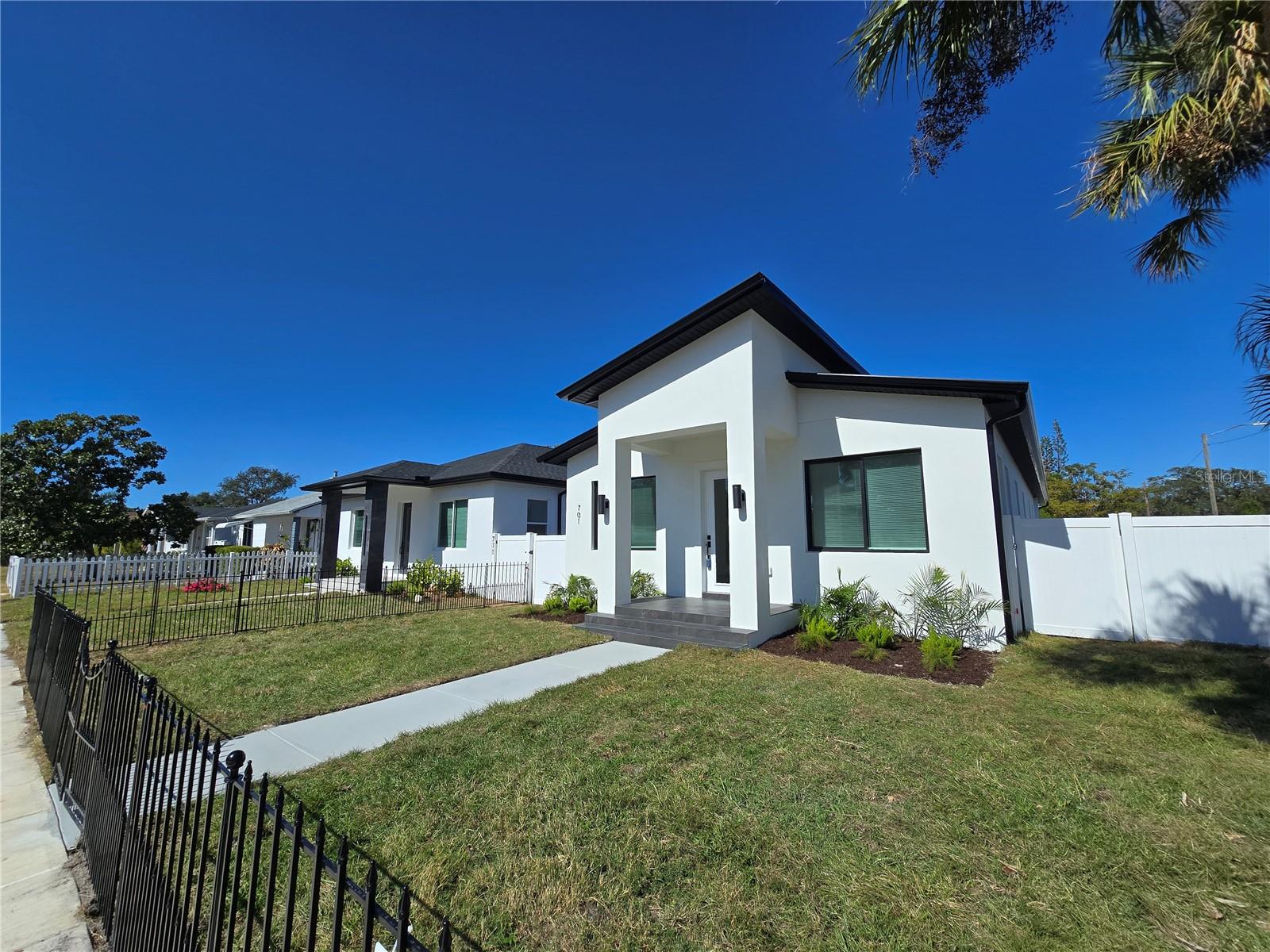 Under contract-accepting backup offers. This Cozy modern home is Built 2025!! AND YES…No FLOOD insurance required & NO HOA. This home has a spacious front yard & walkway leading you to a contemporary style home featuring modern touches of lighting, custom roof lines above the foyer entry, tiled front porch, vinyl fence & landscaping provide plenty of curb appeal. As you enter through a stylish glass door you will discover an open bright floor plan featuring beautiful luxury vinyl wood style floors, a modern kitchen with oversized island and waterfall stone countertop, stainless steel matching appliances, a closet pantry for additional storage, recess lighting, & vent hood. Imagine the gatherings & meals that can be prepared here. The open living room has high 10-foot ceilings with oversized fan. Plenty of natural light enters the home through all the impact windows. Enjoy a private back porch and fenced in yard the perfect place to relax and unwind. The rooms including the separate office have power & cable outlets on the walls ready for the T.V s to be hung. Additionally, the master suite has an oversized walk-in closet and an on-suite bathroom with tiled shower and stylish tub, glass doors and double sink vanity. Located a stone throw from Downtown St Pete offering many patio restaurants, shopping, Marina, Dali Museum, Rowdies soccer, St Pete Pier, USF college, Mahaffey Theater and more!!So much to do, so much to see…Don’t miss out on the St. Pete / Florida lifestyle. See all the pics to pick what to do first.