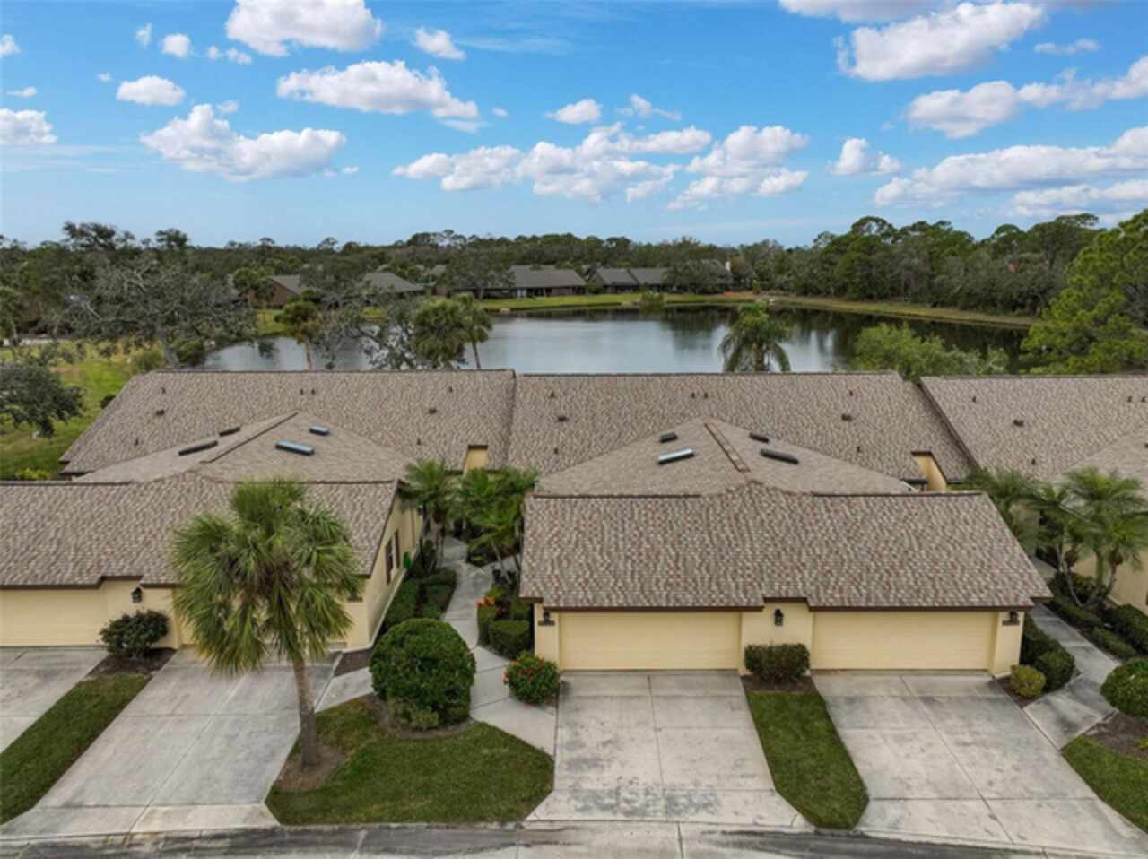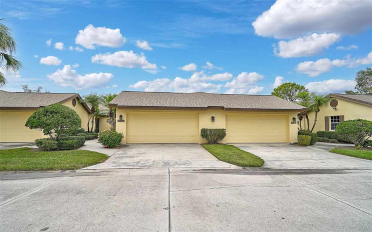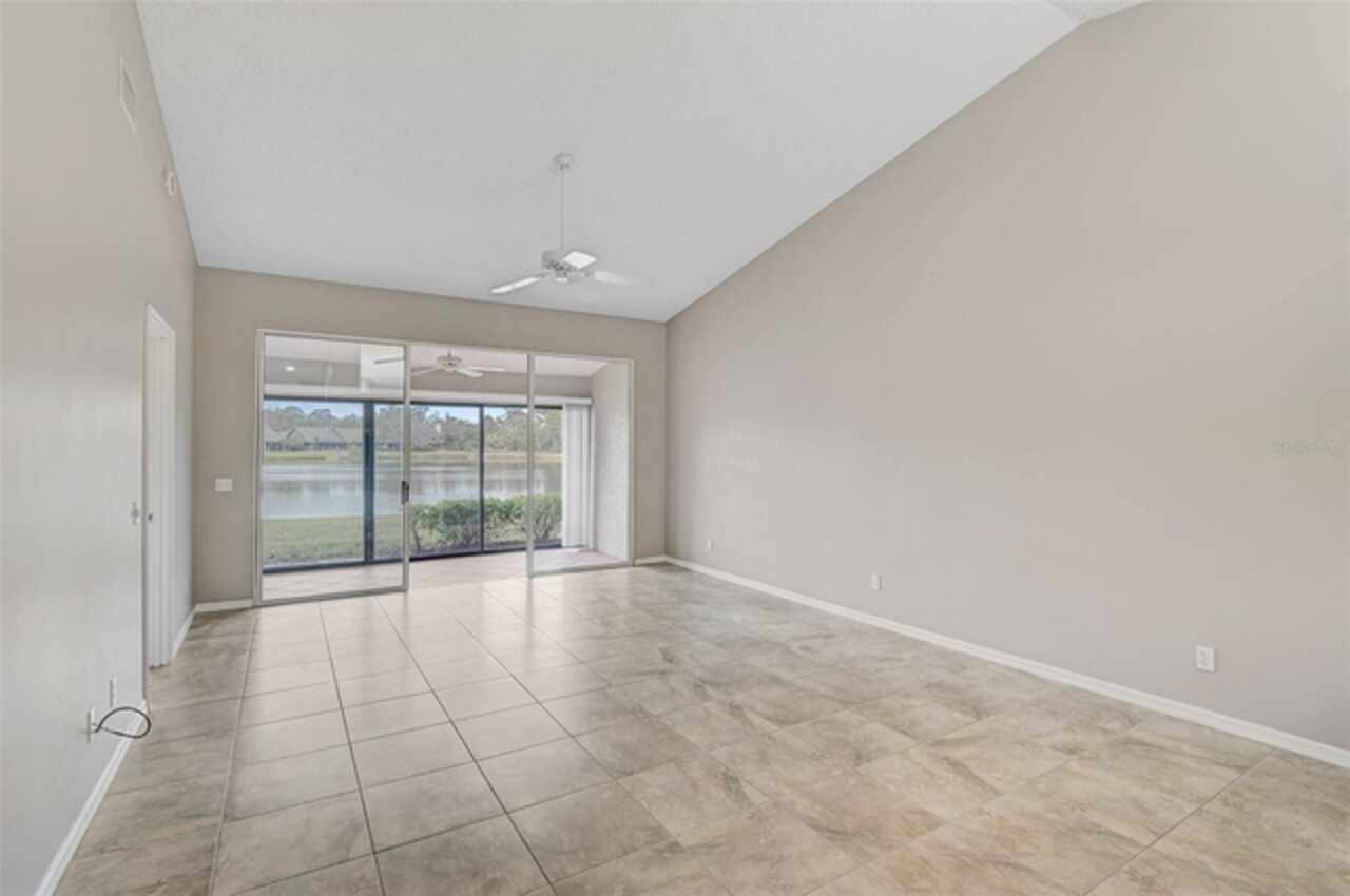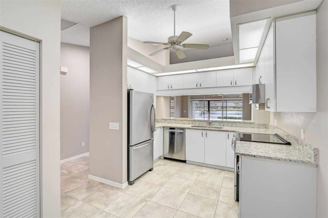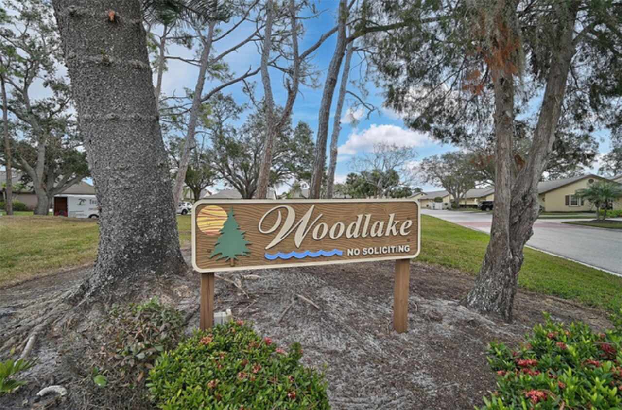 One or more photo(s) has been virtually staged. Wow—what a gem in Woodlake Villas! This well maintained 2-bedroom, 2-bath villa showcases tranquil lake views, soaring vaulted ceilings, and a skylight that fills the space with natural light. A versatile flex room with French pocket doors can easily serve as a home office or formal dining room, while the full 2-car garage provides ample storage and convenience. The kitchen boasts newer stainless-steel appliances and opens seamlessly to the spacious living and dining area—ideal for entertaining or everyday living—with room to add an island or dining table. Stylish tile flooring flows throughout, and ceiling fans in every room ensure year-round comfort. Unwind on the enclosed lanai and enjoy serene sunsets over the lake, or take a short stroll to the heated community pool and gazebo for a peaceful retreat by the water. Woodlake Villas offers an unbeatable location—just minutes from UTC Mall, an array of shopping and dining options, downtown Sarasota, and the area’s award-winning beaches. And here’s the best part: every villa received a brand-new roof in 2024, offering added value and peace of mind. Maintenance of roofs and eaves and common areas of buildings and grounds is the responsibility of the Association. Don’t miss this opportunity to make this exceptional home yours!