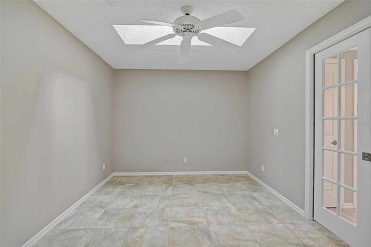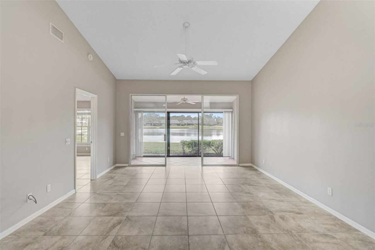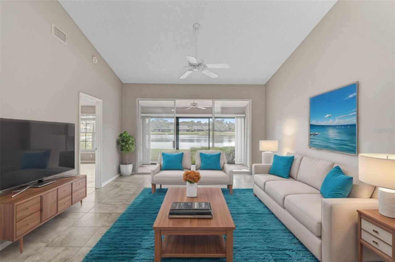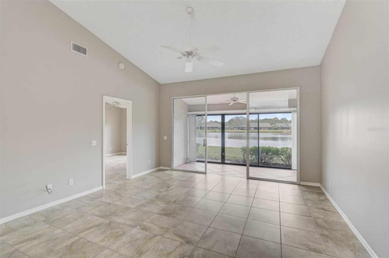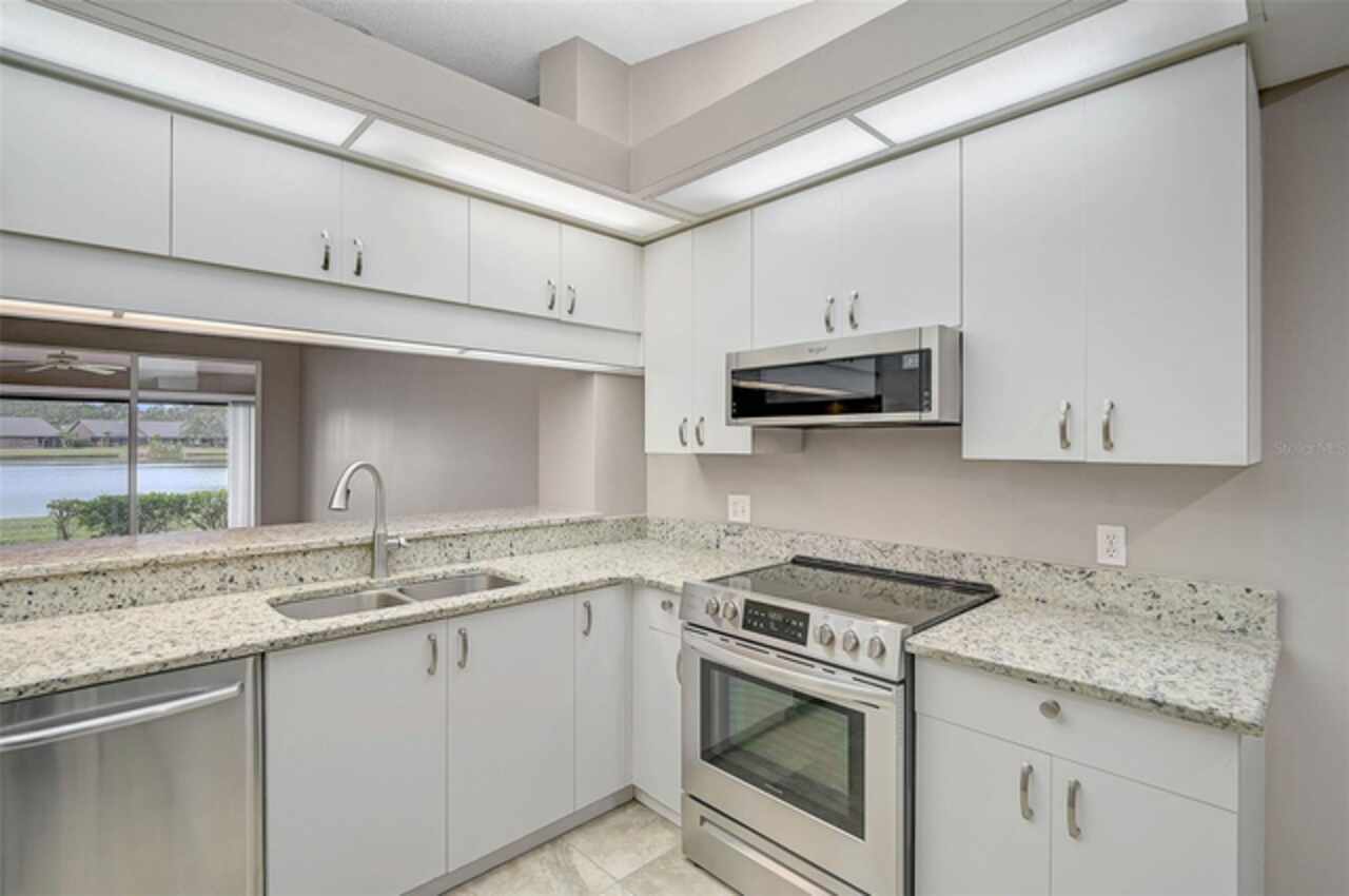 One or more photo(s) has been virtually staged. Wow—what a gem in Woodlake Villas! This well maintained 2-bedroom, 2-bath villa showcases tranquil lake views, soaring vaulted ceilings, and a skylight that fills the space with natural light. A versatile flex room with French pocket doors can easily serve as a home office or formal dining room, while the full 2-car garage provides ample storage and convenience. The kitchen boasts newer stainless-steel appliances and opens seamlessly to the spacious living and dining area—ideal for entertaining or everyday living—with room to add an island or dining table. Stylish tile flooring flows throughout, and ceiling fans in every room ensure year-round comfort. Unwind on the enclosed lanai and enjoy serene sunsets over the lake, or take a short stroll to the heated community pool and gazebo for a peaceful retreat by the water. Woodlake Villas offers an unbeatable location—just minutes from UTC Mall, an array of shopping and dining options, downtown Sarasota, and the area’s award-winning beaches. And here’s the best part: every villa received a brand-new roof in 2024, offering added value and peace of mind. Maintenance of roofs and eaves and common areas of buildings and grounds is the responsibility of the Association. Don’t miss this opportunity to make this exceptional home yours!