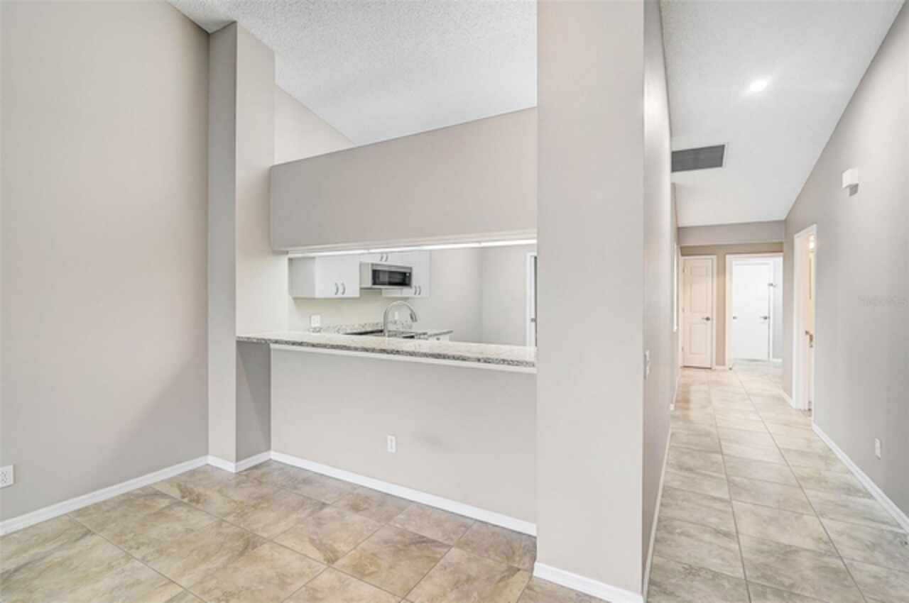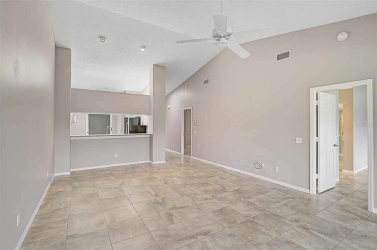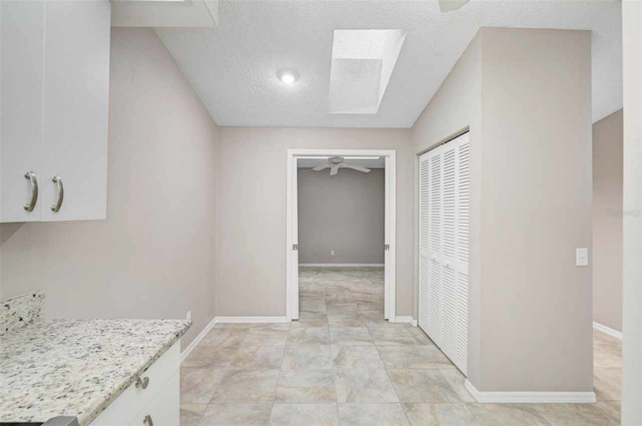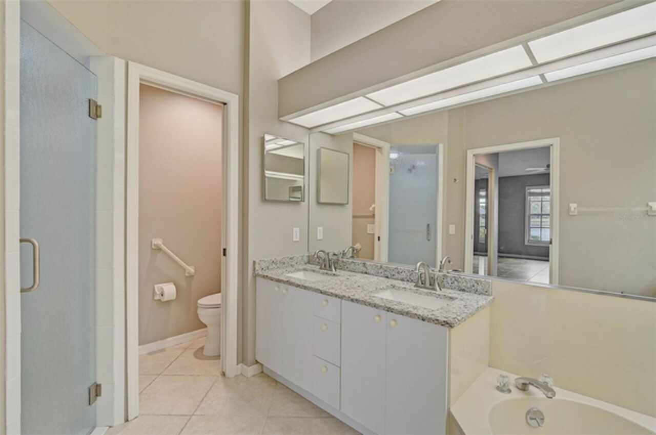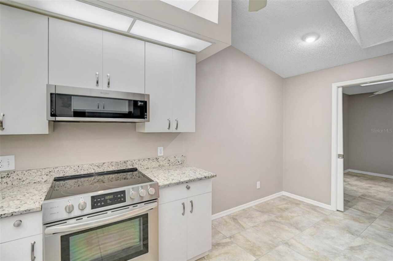 One or more photo(s) has been virtually staged. Wow—what a gem in Woodlake Villas! This well maintained 2-bedroom, 2-bath villa showcases tranquil lake views, soaring vaulted ceilings, and a skylight that fills the space with natural light. A versatile flex room with French pocket doors can easily serve as a home office or formal dining room, while the full 2-car garage provides ample storage and convenience. The kitchen boasts newer stainless-steel appliances and opens seamlessly to the spacious living and dining area—ideal for entertaining or everyday living—with room to add an island or dining table. Stylish tile flooring flows throughout, and ceiling fans in every room ensure year-round comfort. Unwind on the enclosed lanai and enjoy serene sunsets over the lake, or take a short stroll to the heated community pool and gazebo for a peaceful retreat by the water. Woodlake Villas offers an unbeatable location—just minutes from UTC Mall, an array of shopping and dining options, downtown Sarasota, and the area’s award-winning beaches. And here’s the best part: every villa received a brand-new roof in 2024, offering added value and peace of mind. Maintenance of roofs and eaves and common areas of buildings and grounds is the responsibility of the Association. Don’t miss this opportunity to make this exceptional home yours!