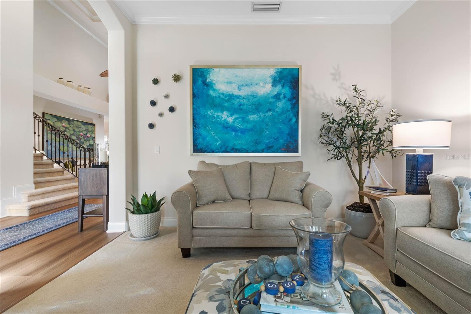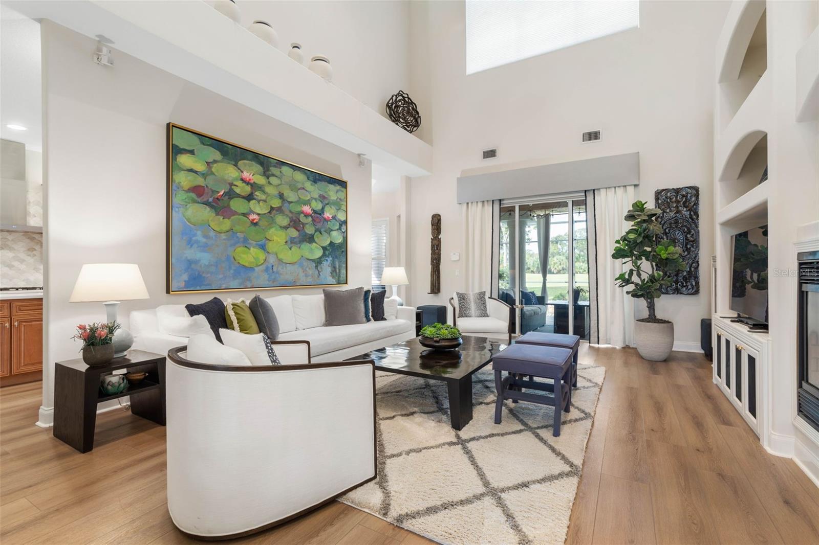 Welcome to 72 Lagare Street, a beautifully updated saltwater pool home in the coveted Front Street neighborhood of Grand Haven. Perfectly positioned with a serene golf course view and just steps from the scenic Esplanade Trail, this residence blends elegance, comfort, and modern upgrades. Inside, you’ll find 3 bedrooms, 2.5 baths, plus a versatile office/den, all framed by soaring ceilings and oversized windows that fill the home with natural light. The primary suite is conveniently located on the first floor, offering a private retreat with direct access to the outdoor living space. Its spa-inspired bath showcases a porcelain tile floor, walk-in shower, and stand-alone soaking tub, while a dual-sided propane fireplace creates a cozy ambiance shared with the great room. The chef’s kitchen boasts a propane range, quartz countertops, and solid wood cabinetry, flowing seamlessly into the living and dining areas for easy entertaining. Both the kitchen and baths have been tastefully updated with modern finishes. Step outside to your screened saltwater pool, the perfect place to relax while enjoying the peaceful golf course backdrop. Energy-conscious buyers will appreciate the solar features that enhance both efficiency and sustainability. This home offers the very best of Grand Haven living—luxury, location, and lifestyle. Don't forget to check out the walkthrough video. Grand Haven offers a newly renovated Cafe, two pools, two fitness centers, pickleball, bocce ball, har-tru tennis courts, volleyball, basketball, croquet, a tiki bar, dog park, & beautiful walking trails at no additional fee. Jack Nicklaus golf club membership is available for a separate membership fee.
