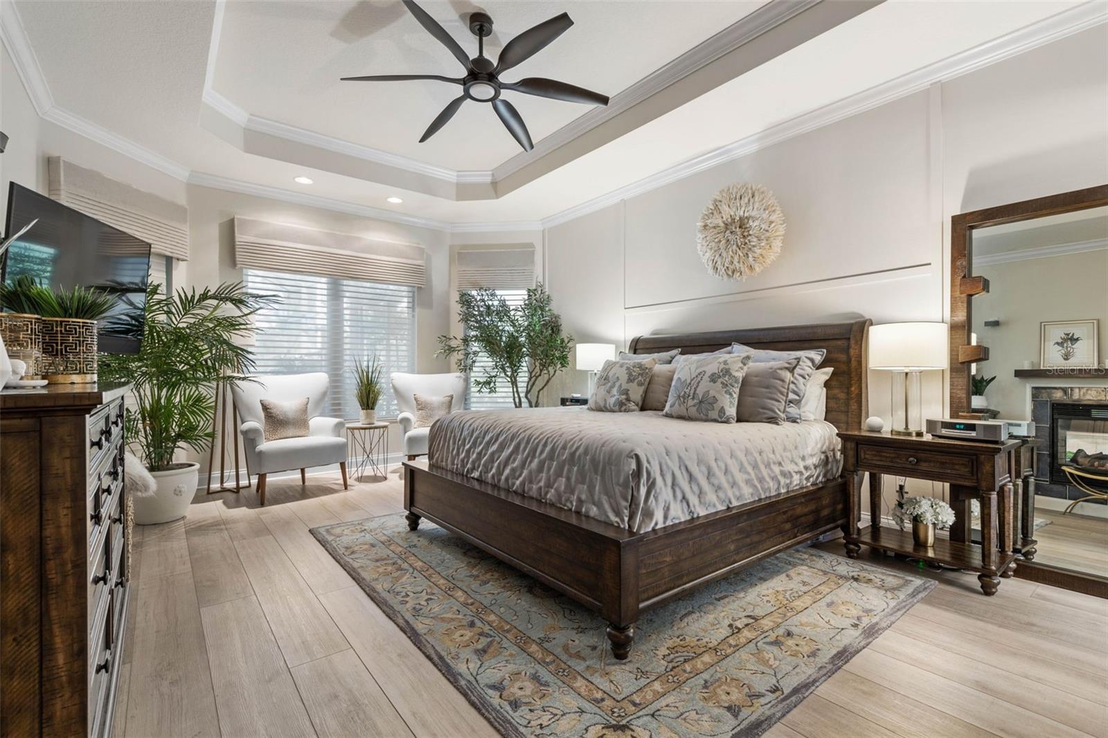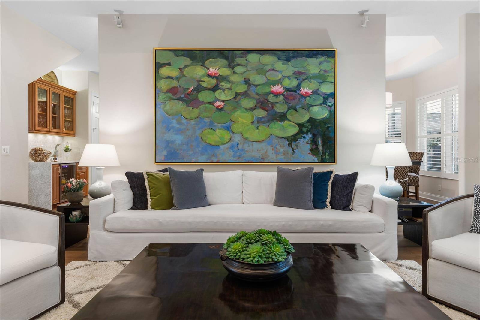 Built-in Features, Ceiling Fans(s), Crown Molding, Dry Bar, Eat-in Kitchen, High Ceilings, Primary Bedroom Main Floor, Solid Surface Counters, Solid Wood Cabinets, Walk-In Closet(s), Window Treatments