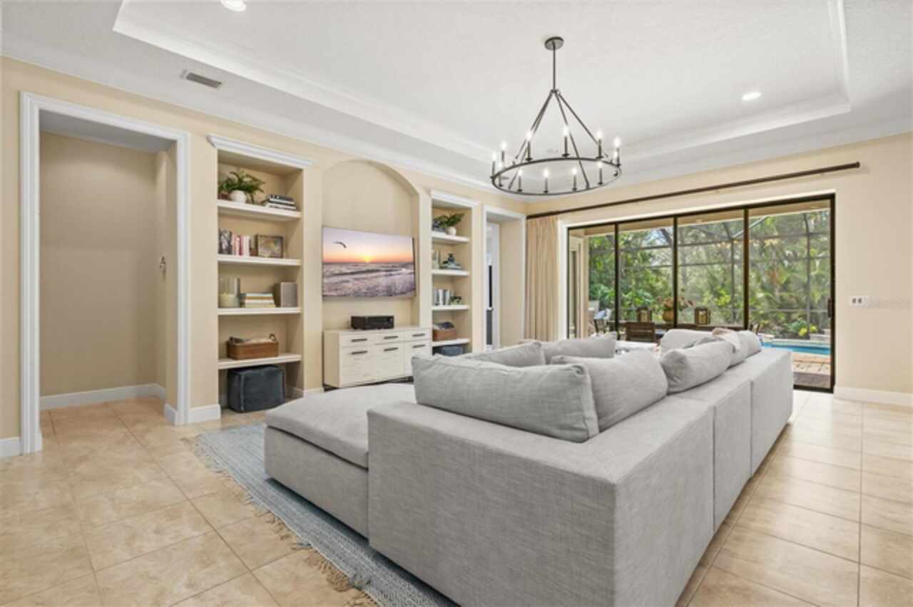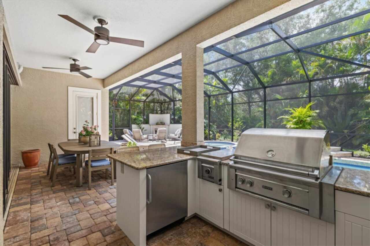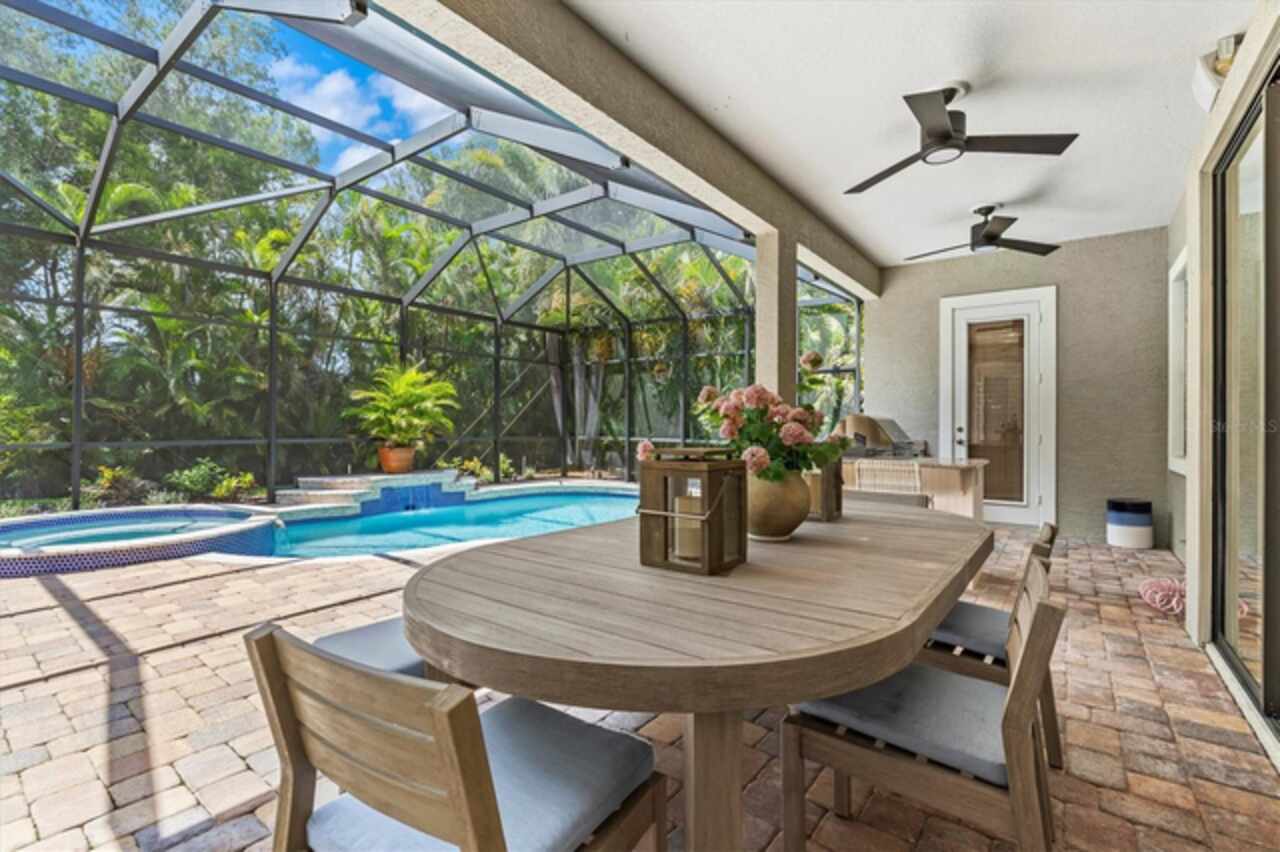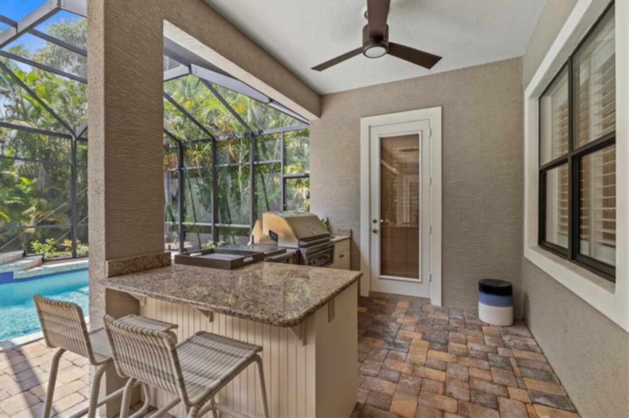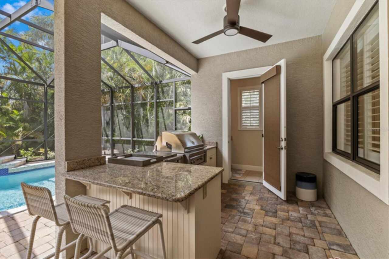 Immaculate Maintenance-Free Home in Stone Ridge at Lakewood Ranch Country Club. Located within the gates of Lakewood Ranch Country Club, this meticulously maintained Savona model by Neal Communities sits on a private oversized cul-de-sac lot. Offering nearly 2, 500 sq. ft. of living space, the home features 3 bedrooms, a den, and a 3-car garage. Step inside to soaring 10-foot ceilings with coffered details, crown molding in every room, plantation shutters, and custom window treatments. Tile floors flow throughout, with wood-look plank tile in the owner’s suite, den, and bedrooms. All lighting and ceiling fans have been thoughtfully updated. The den, accented with glass-pane French doors, provides the perfect home office or quiet retreat. The formal living and dining areas set the tone, while the open-concept family room with custom built-ins and disappearing sliders expands seamlessly to the lanai. The adjoining kitchen showcases upgraded cabinetry with glass-front uppers, granite countertops, stainless-steel appliances, a built-in desk, breakfast bar, and casual dining nook. The spacious owner’s suite offers lanai access, a sitting area, and an en suite bath with soaking tub, dual vanities, walk-in shower, private water closet, and a custom-fitted walk-in closet. Outdoor living is unmatched here. This home boasts the largest lanai in the neighborhood, highlighted by a sparkling pool and spa, custom gas fireplace, lush landscaping, and complete privacy. The outdoor kitchen features granite counters, a gas grill, side burner, refrigerator, and sink. A covered dining space, cabana bath, and outdoor shower make this a true retreat for relaxing or entertaining. Membership at Lakewood Ranch Country Club is optional, but available, with access to golf, tennis, fitness, dining, and resort-style pools. All this, just minutes from award-winning beaches, fine dining, and world-class shopping.