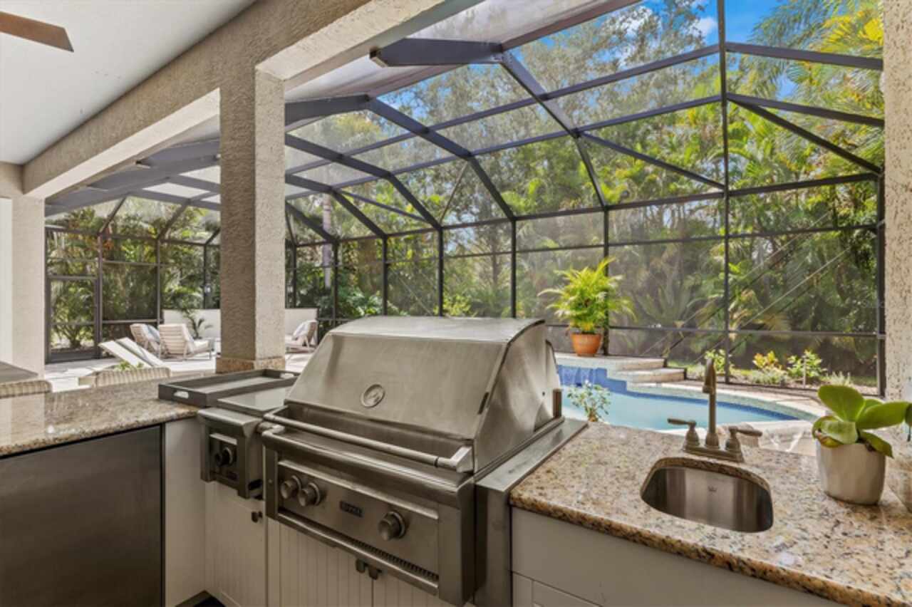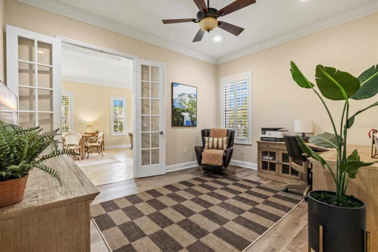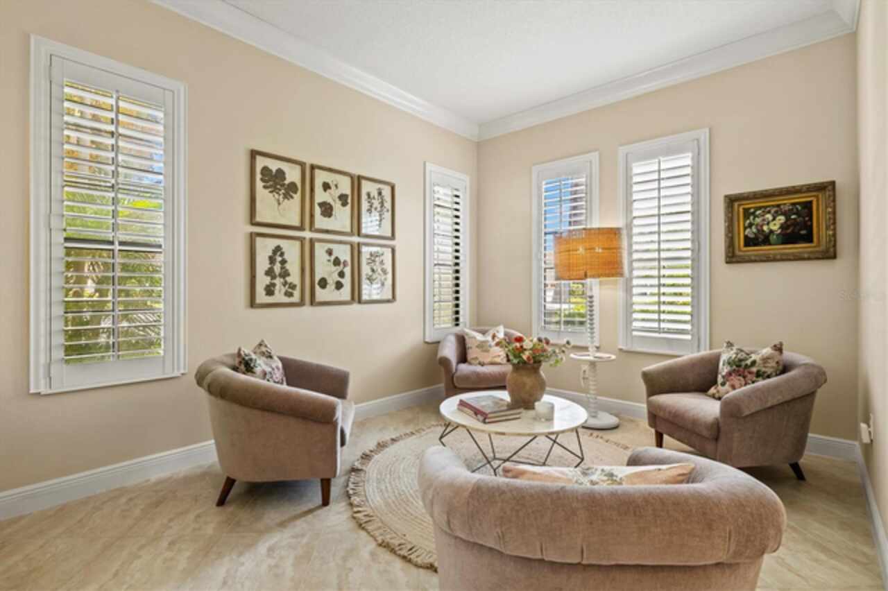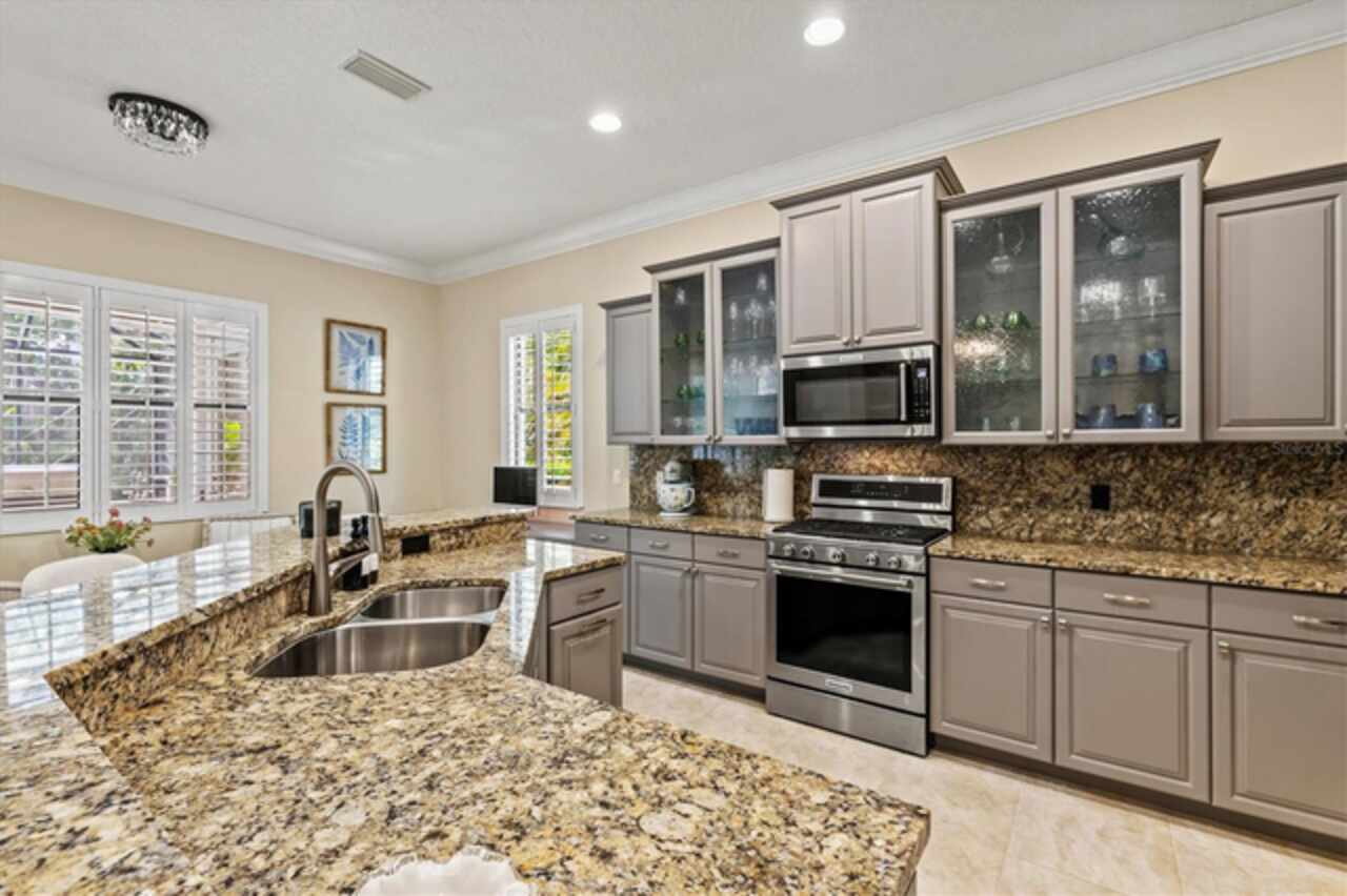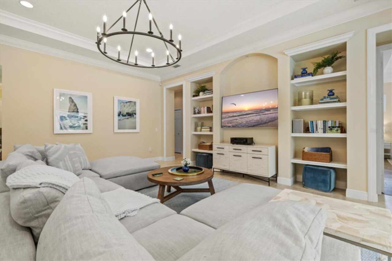Immaculate Maintenance-Free Home in Stone Ridge at Lakewood Ranch Country Club. Located within the gates of Lakewood Ranch Country Club, this meticulously maintained Savona model by Neal Communities sits on a private oversized cul-de-sac lot. Offering nearly 2, 500 sq. ft. of living space, the home features 3 bedrooms, a den, and a 3-car garage. Step inside to soaring 10-foot ceilings with coffered details, crown molding in every room, plantation shutters, and custom window treatments. Tile floors flow throughout, with wood-look plank tile in the owner’s suite, den, and bedrooms. All lighting and ceiling fans have been thoughtfully updated. The den, accented with glass-pane French doors, provides the perfect home office or quiet retreat. The formal living and dining areas set the tone, while the open-concept family room with custom built-ins and disappearing sliders expands seamlessly to the lanai. The adjoining kitchen showcases upgraded cabinetry with glass-front uppers, granite countertops, stainless-steel appliances, a built-in desk, breakfast bar, and casual dining nook. The spacious owner’s suite offers lanai access, a sitting area, and an en suite bath with soaking tub, dual vanities, walk-in shower, private water closet, and a custom-fitted walk-in closet. Outdoor living is unmatched here. This home boasts the largest lanai in the neighborhood, highlighted by a sparkling pool and spa, custom gas fireplace, lush landscaping, and complete privacy. The outdoor kitchen features granite counters, a gas grill, side burner, refrigerator, and sink. A covered dining space, cabana bath, and outdoor shower make this a true retreat for relaxing or entertaining. Membership at Lakewood Ranch Country Club is optional, but available, with access to golf, tennis, fitness, dining, and resort-style pools. All this, just minutes from award-winning beaches, fine dining, and world-class shopping.