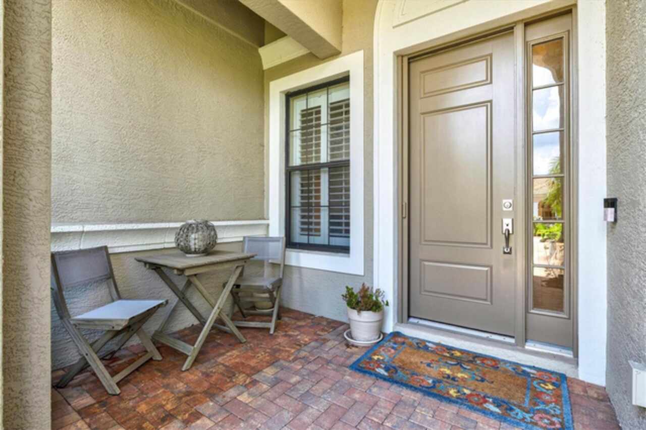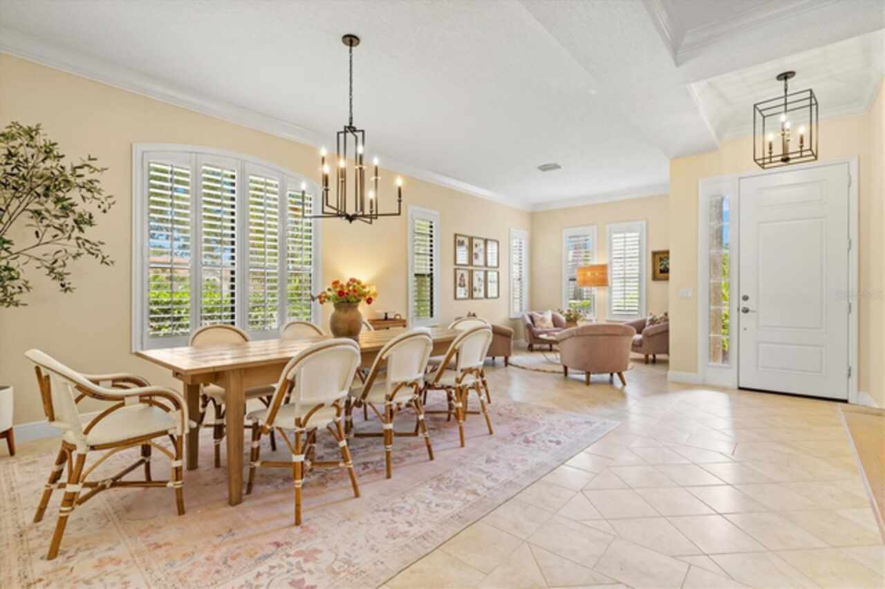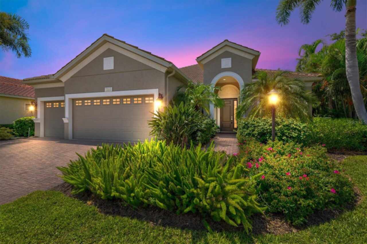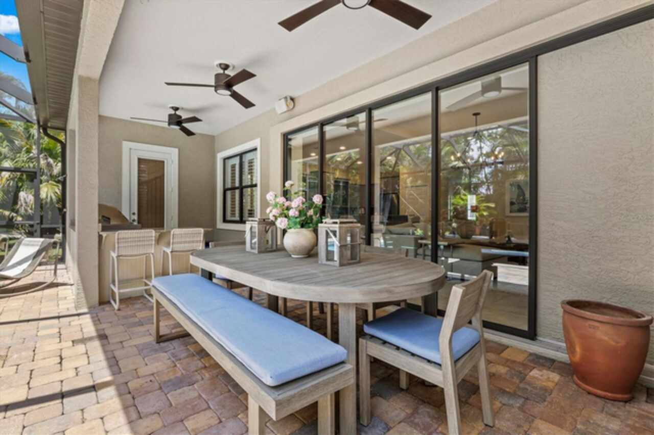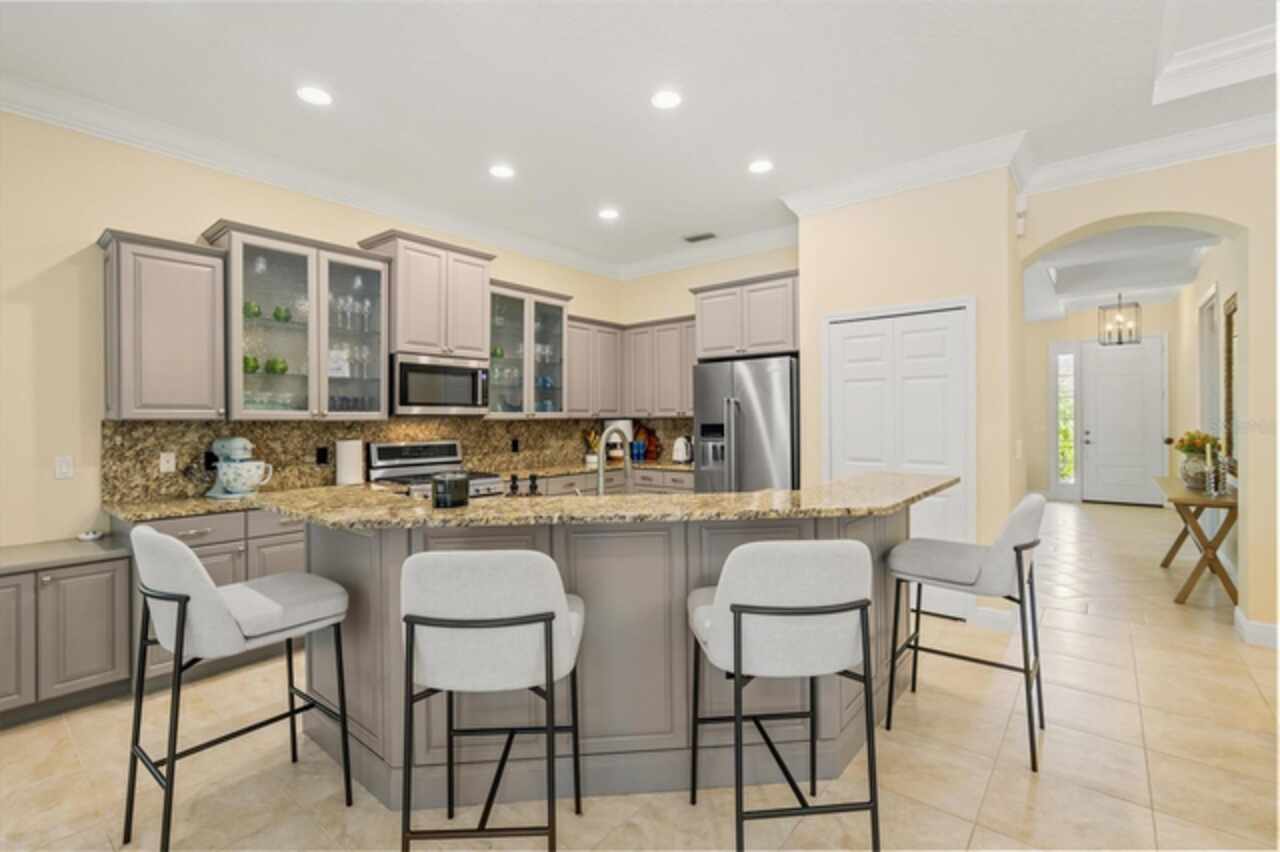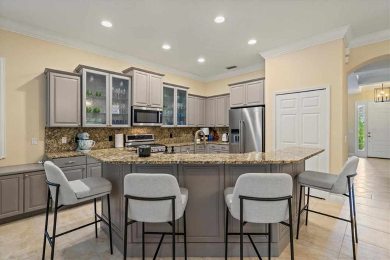 Immaculate Maintenance-Free Home in Stone Ridge at Lakewood Ranch Country Club. Located within the gates of Lakewood Ranch Country Club, this meticulously maintained Savona model by Neal Communities sits on a private oversized cul-de-sac lot. Offering nearly 2, 500 sq. ft. of living space, the home features 3 bedrooms, a den, and a 3-car garage. Step inside to soaring 10-foot ceilings with coffered details, crown molding in every room, plantation shutters, and custom window treatments. Tile floors flow throughout, with wood-look plank tile in the owner’s suite, den, and bedrooms. All lighting and ceiling fans have been thoughtfully updated. The den, accented with glass-pane French doors, provides the perfect home office or quiet retreat. The formal living and dining areas set the tone, while the open-concept family room with custom built-ins and disappearing sliders expands seamlessly to the lanai. The adjoining kitchen showcases upgraded cabinetry with glass-front uppers, granite countertops, stainless-steel appliances, a built-in desk, breakfast bar, and casual dining nook. The spacious owner’s suite offers lanai access, a sitting area, and an en suite bath with soaking tub, dual vanities, walk-in shower, private water closet, and a custom-fitted walk-in closet. Outdoor living is unmatched here. This home boasts the largest lanai in the neighborhood, highlighted by a sparkling pool and spa, custom gas fireplace, lush landscaping, and complete privacy. The outdoor kitchen features granite counters, a gas grill, side burner, refrigerator, and sink. A covered dining space, cabana bath, and outdoor shower make this a true retreat for relaxing or entertaining. Membership at Lakewood Ranch Country Club is optional, but available, with access to golf, tennis, fitness, dining, and resort-style pools. All this, just minutes from award-winning beaches, fine dining, and world-class shopping.