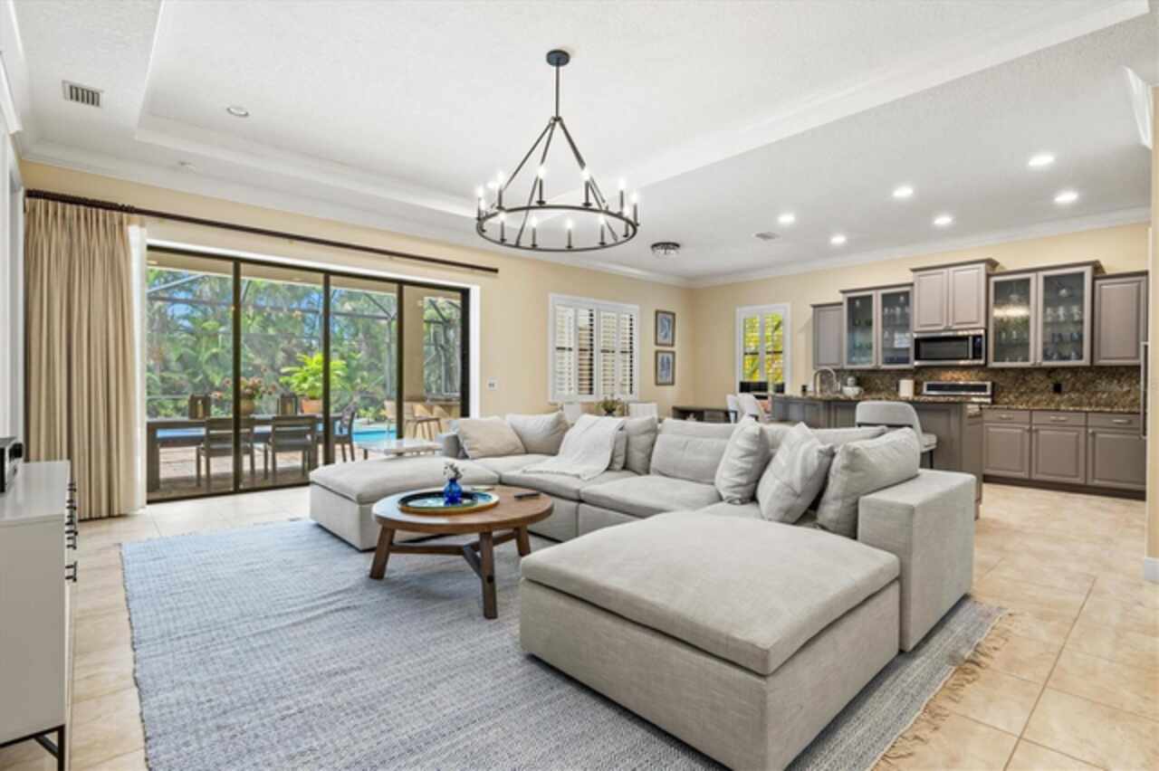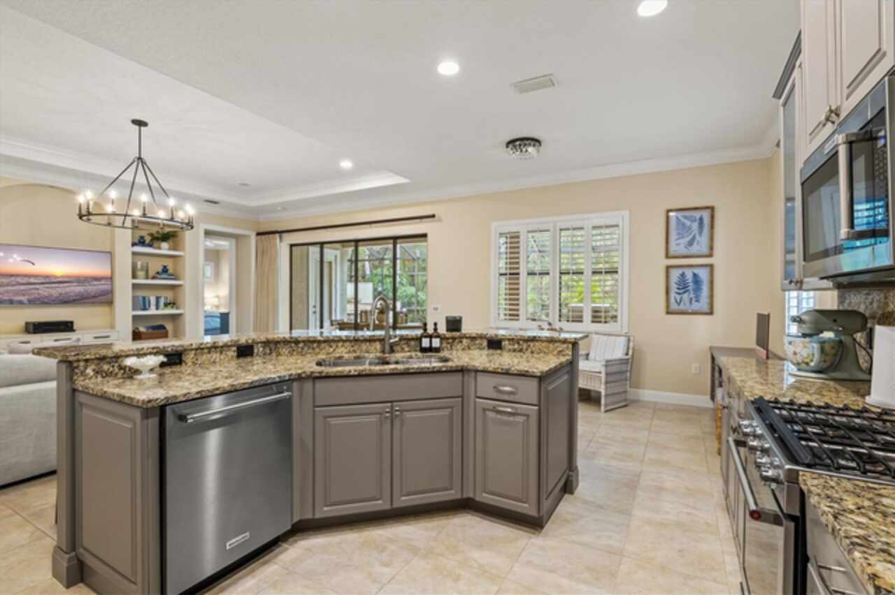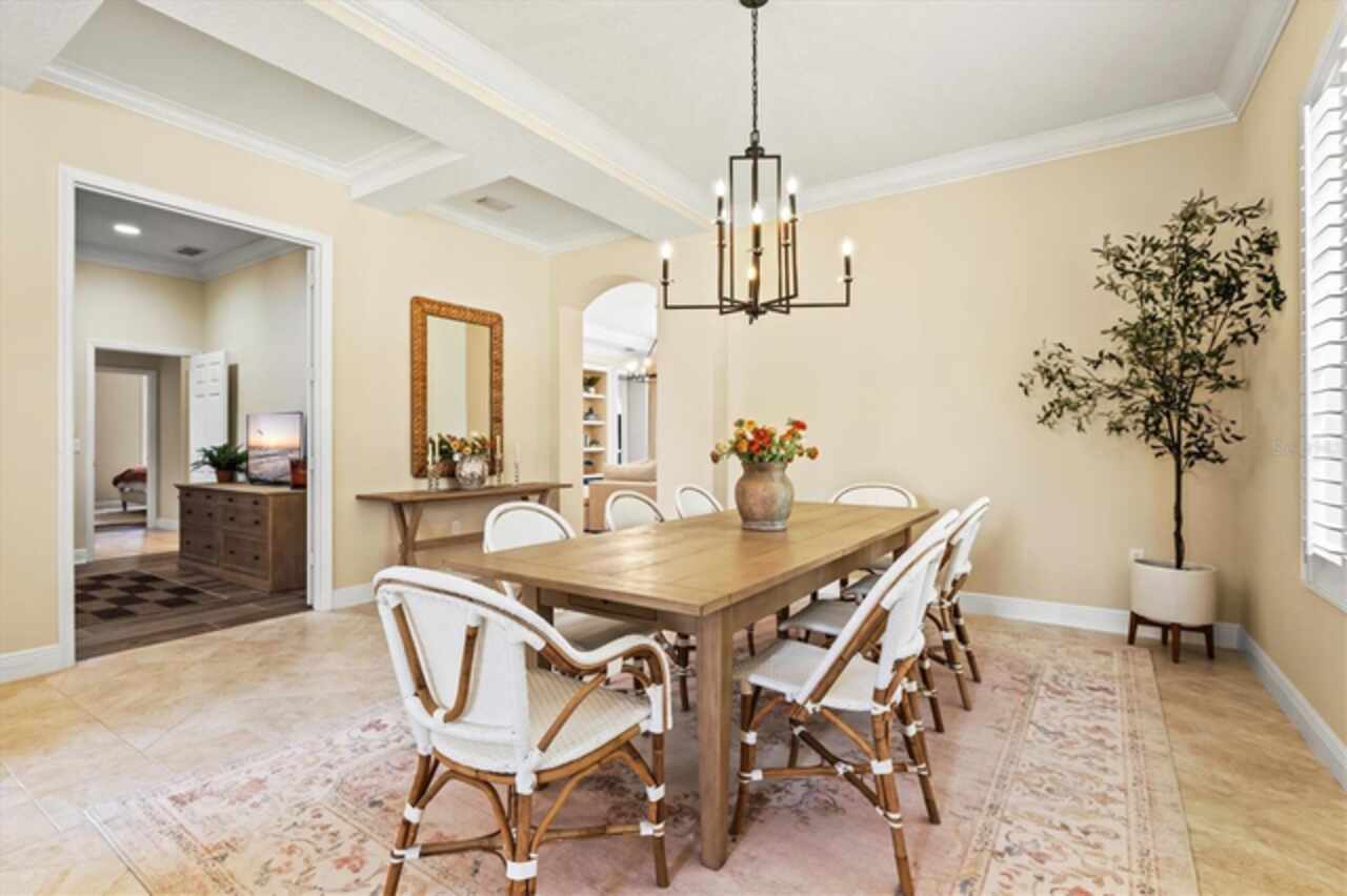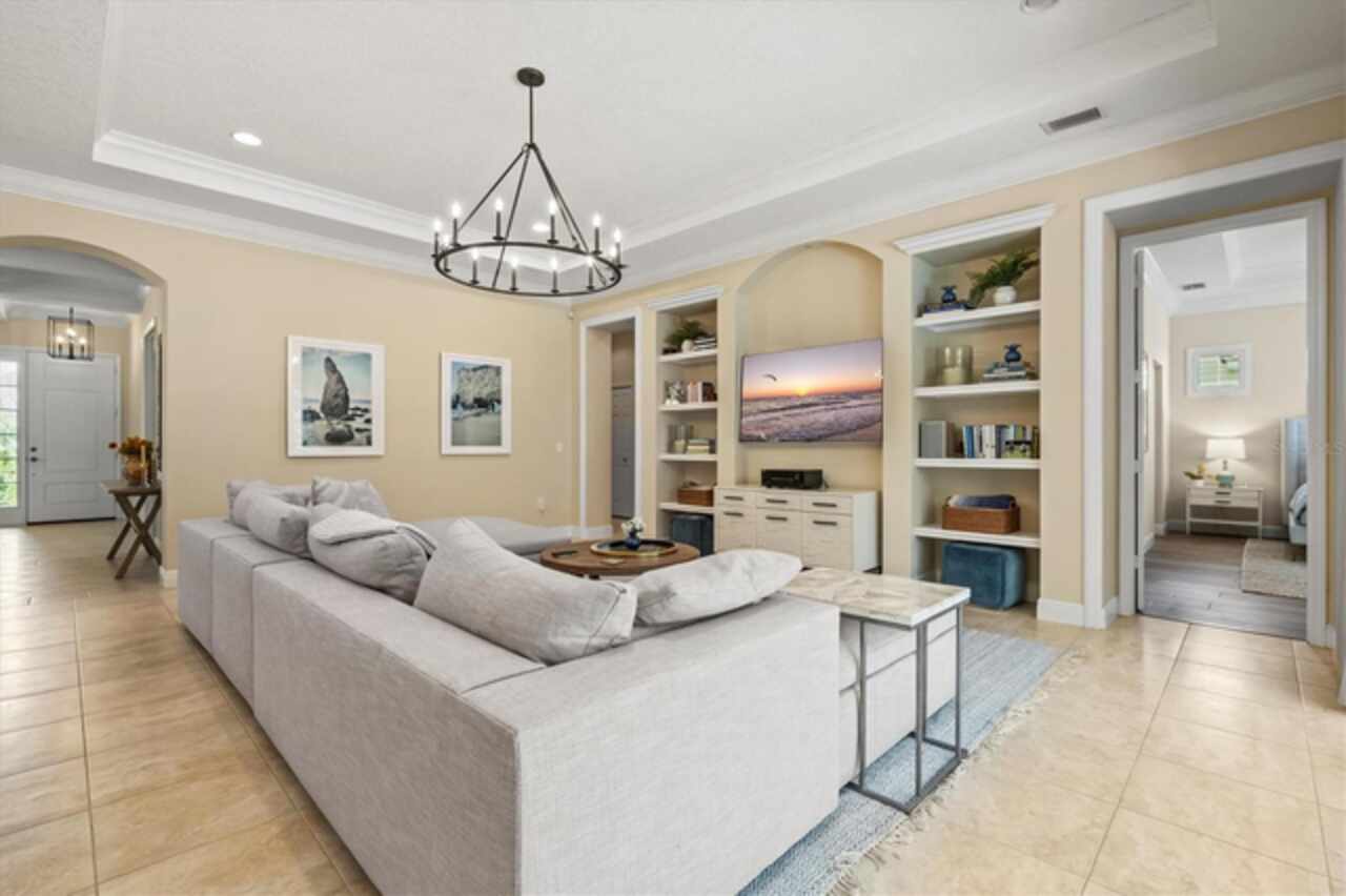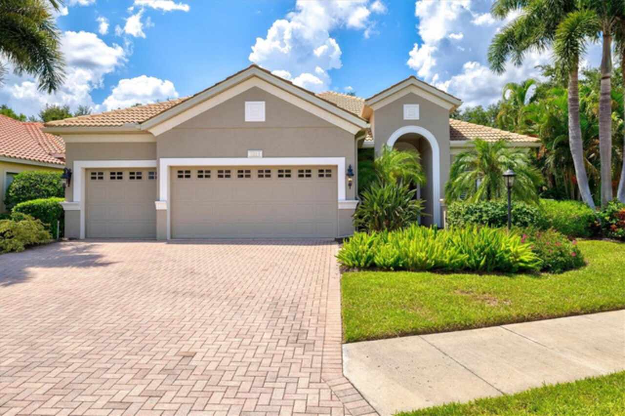 Immaculate Maintenance-Free Home in Stone Ridge at Lakewood Ranch Country Club. Located within the gates of Lakewood Ranch Country Club, this meticulously maintained Savona model by Neal Communities sits on a private oversized cul-de-sac lot. Offering nearly 2, 500 sq. ft. of living space, the home features 3 bedrooms, a den, and a 3-car garage. Step inside to soaring 10-foot ceilings with coffered details, crown molding in every room, plantation shutters, and custom window treatments. Tile floors flow throughout, with wood-look plank tile in the owner’s suite, den, and bedrooms. All lighting and ceiling fans have been thoughtfully updated. The den, accented with glass-pane French doors, provides the perfect home office or quiet retreat. The formal living and dining areas set the tone, while the open-concept family room with custom built-ins and disappearing sliders expands seamlessly to the lanai. The adjoining kitchen showcases upgraded cabinetry with glass-front uppers, granite countertops, stainless-steel appliances, a built-in desk, breakfast bar, and casual dining nook. The spacious owner’s suite offers lanai access, a sitting area, and an en suite bath with soaking tub, dual vanities, walk-in shower, private water closet, and a custom-fitted walk-in closet. Outdoor living is unmatched here. This home boasts the largest lanai in the neighborhood, highlighted by a sparkling pool and spa, custom gas fireplace, lush landscaping, and complete privacy. The outdoor kitchen features granite counters, a gas grill, side burner, refrigerator, and sink. A covered dining space, cabana bath, and outdoor shower make this a true retreat for relaxing or entertaining. Membership at Lakewood Ranch Country Club is optional, but available, with access to golf, tennis, fitness, dining, and resort-style pools. All this, just minutes from award-winning beaches, fine dining, and world-class shopping.