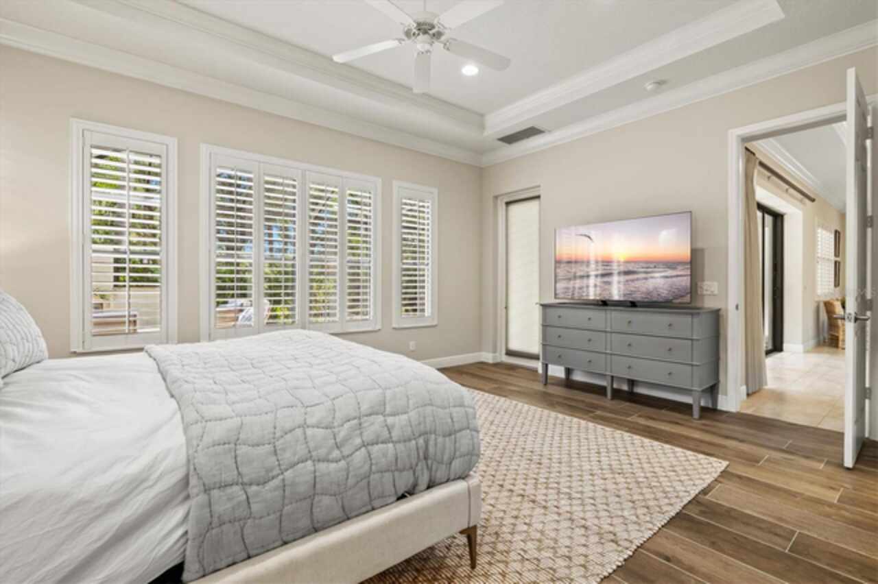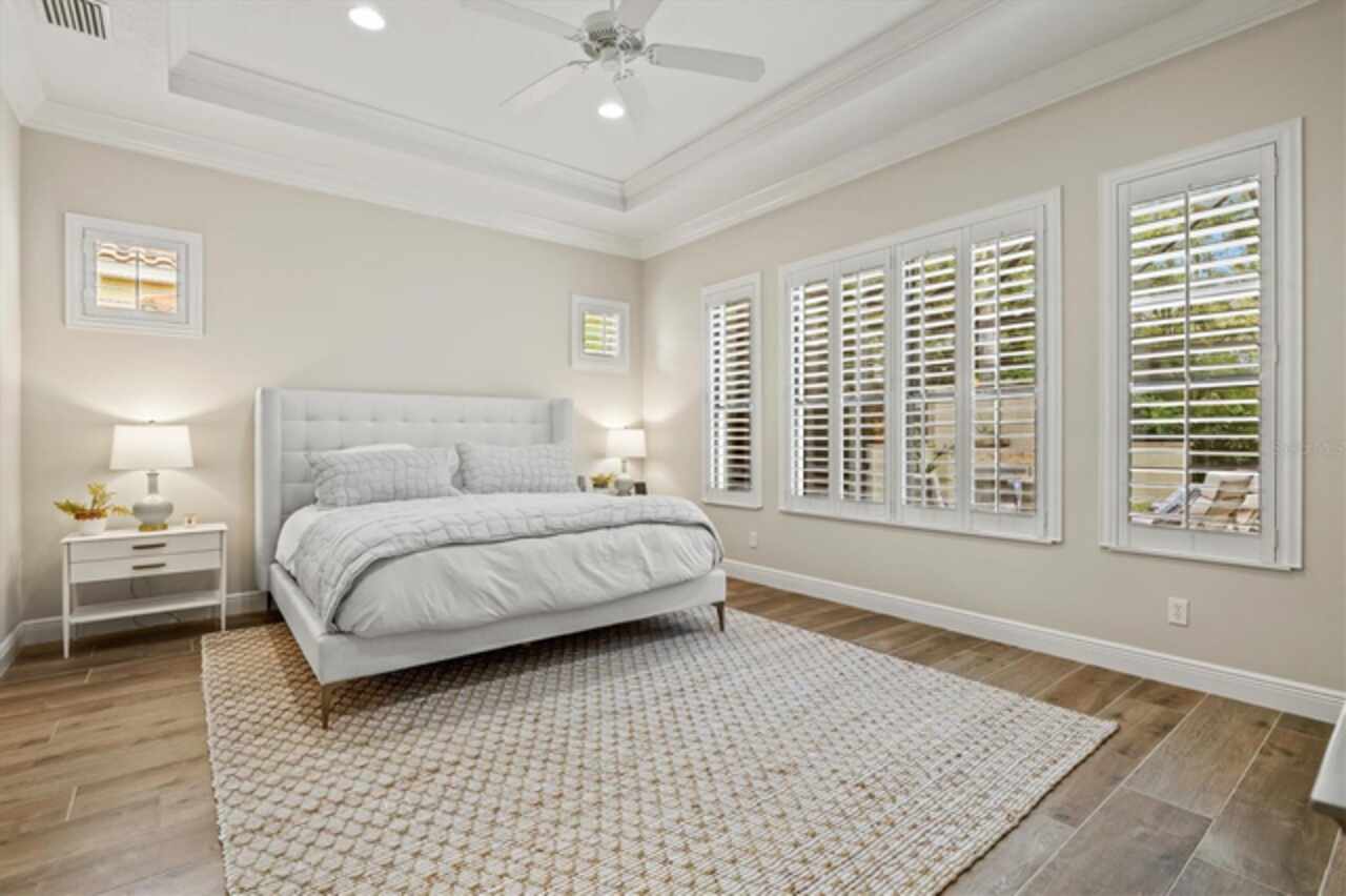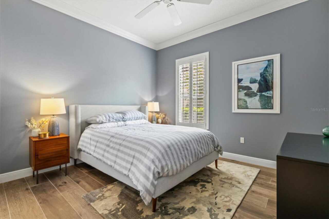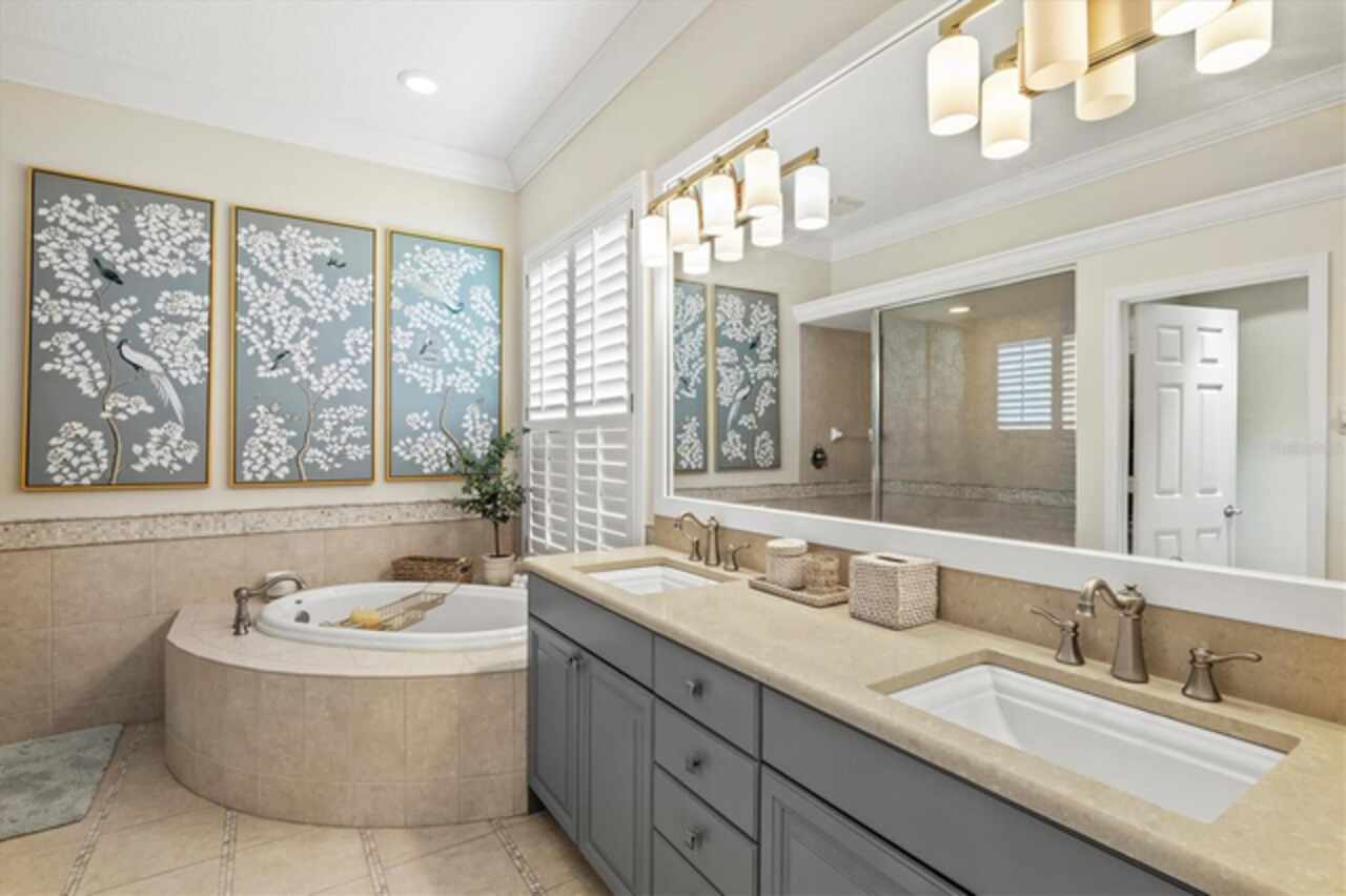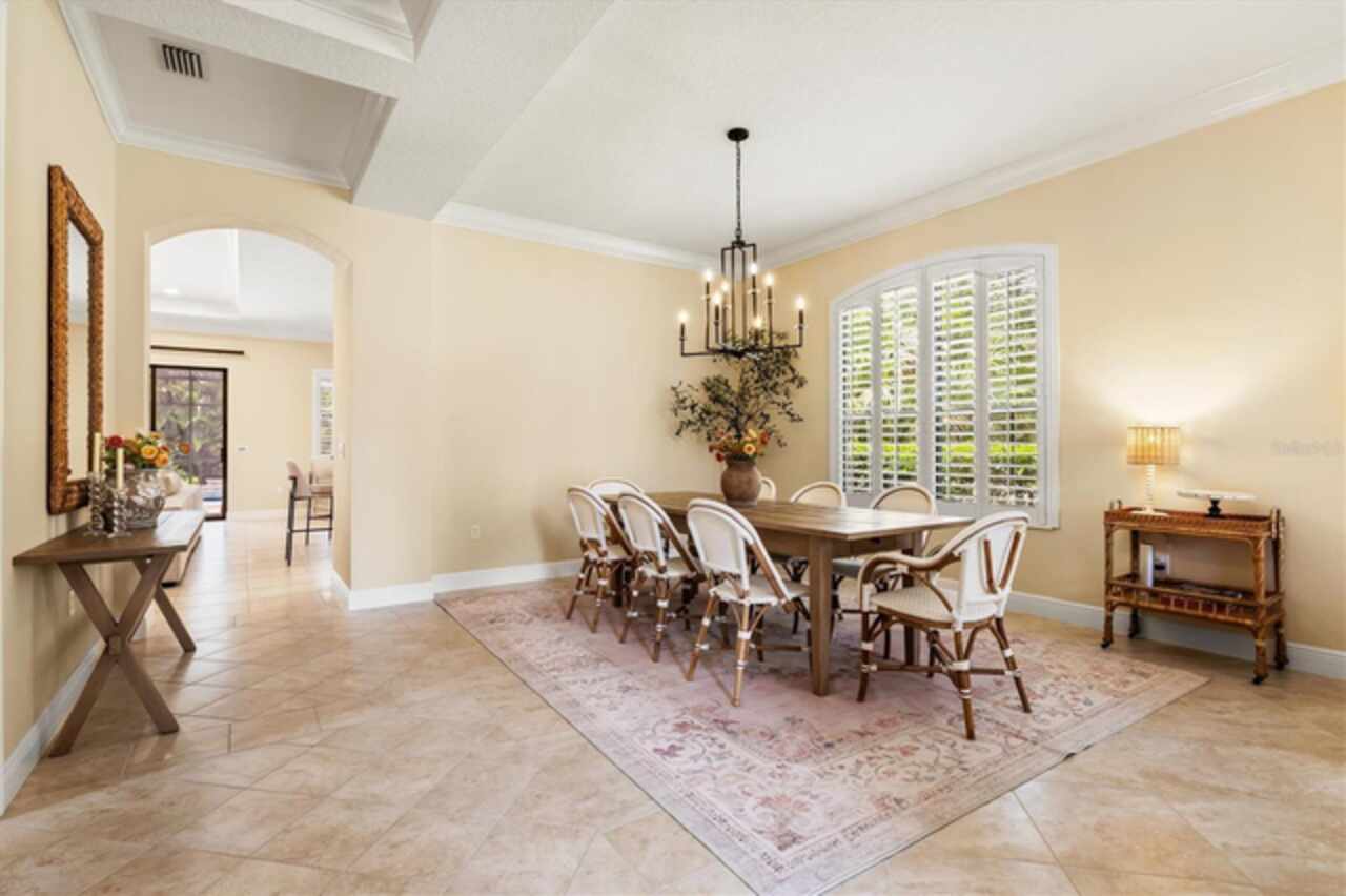 Immaculate Maintenance-Free Home in Stone Ridge at Lakewood Ranch Country Club. Located within the gates of Lakewood Ranch Country Club, this meticulously maintained Savona model by Neal Communities sits on a private oversized cul-de-sac lot. Offering nearly 2, 500 sq. ft. of living space, the home features 3 bedrooms, a den, and a 3-car garage. Step inside to soaring 10-foot ceilings with coffered details, crown molding in every room, plantation shutters, and custom window treatments. Tile floors flow throughout, with wood-look plank tile in the owner’s suite, den, and bedrooms. All lighting and ceiling fans have been thoughtfully updated. The den, accented with glass-pane French doors, provides the perfect home office or quiet retreat. The formal living and dining areas set the tone, while the open-concept family room with custom built-ins and disappearing sliders expands seamlessly to the lanai. The adjoining kitchen showcases upgraded cabinetry with glass-front uppers, granite countertops, stainless-steel appliances, a built-in desk, breakfast bar, and casual dining nook. The spacious owner’s suite offers lanai access, a sitting area, and an en suite bath with soaking tub, dual vanities, walk-in shower, private water closet, and a custom-fitted walk-in closet. Outdoor living is unmatched here. This home boasts the largest lanai in the neighborhood, highlighted by a sparkling pool and spa, custom gas fireplace, lush landscaping, and complete privacy. The outdoor kitchen features granite counters, a gas grill, side burner, refrigerator, and sink. A covered dining space, cabana bath, and outdoor shower make this a true retreat for relaxing or entertaining. Membership at Lakewood Ranch Country Club is optional, but available, with access to golf, tennis, fitness, dining, and resort-style pools. All this, just minutes from award-winning beaches, fine dining, and world-class shopping.