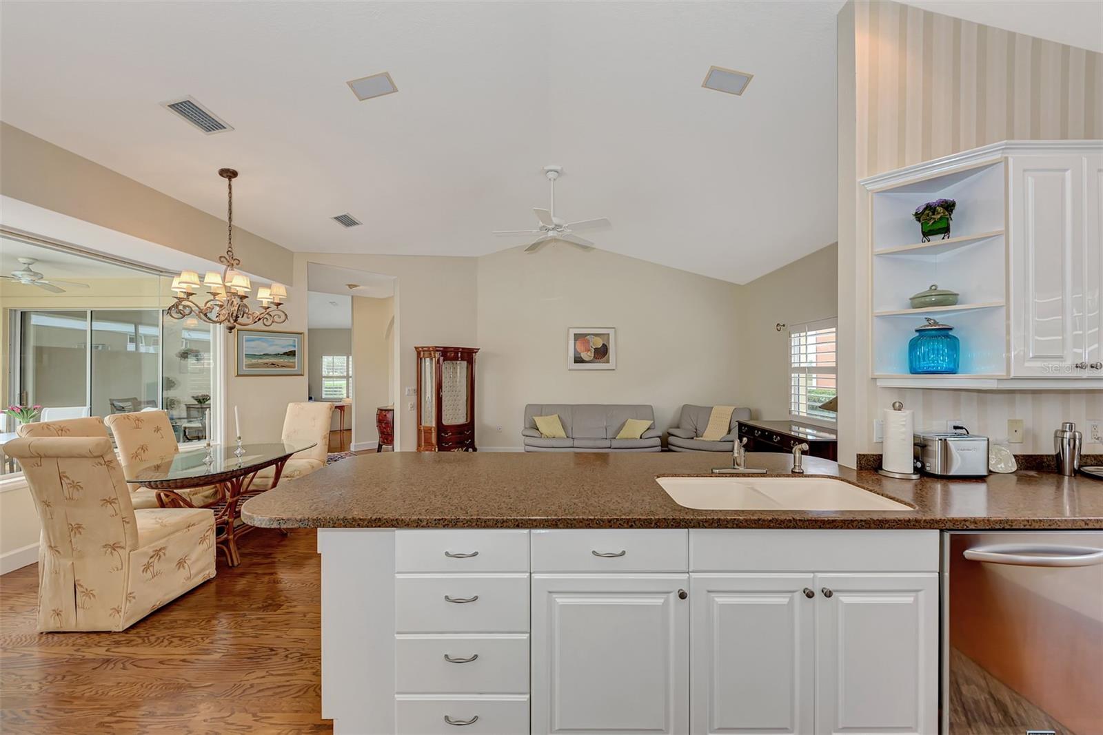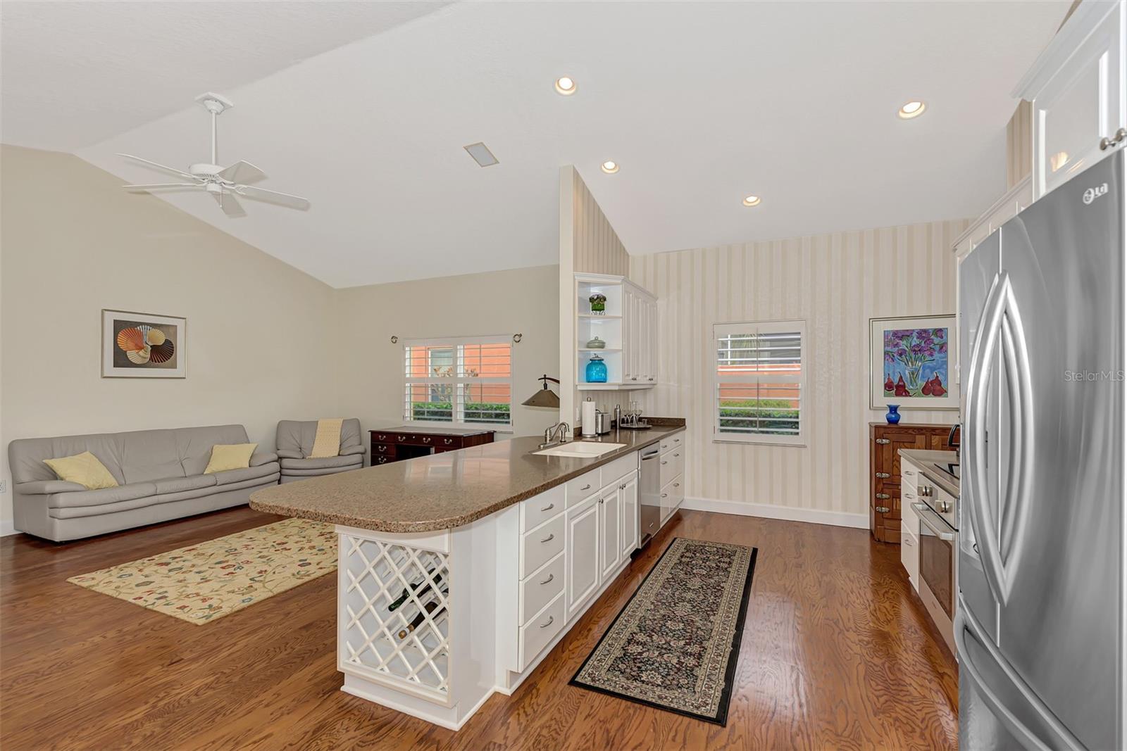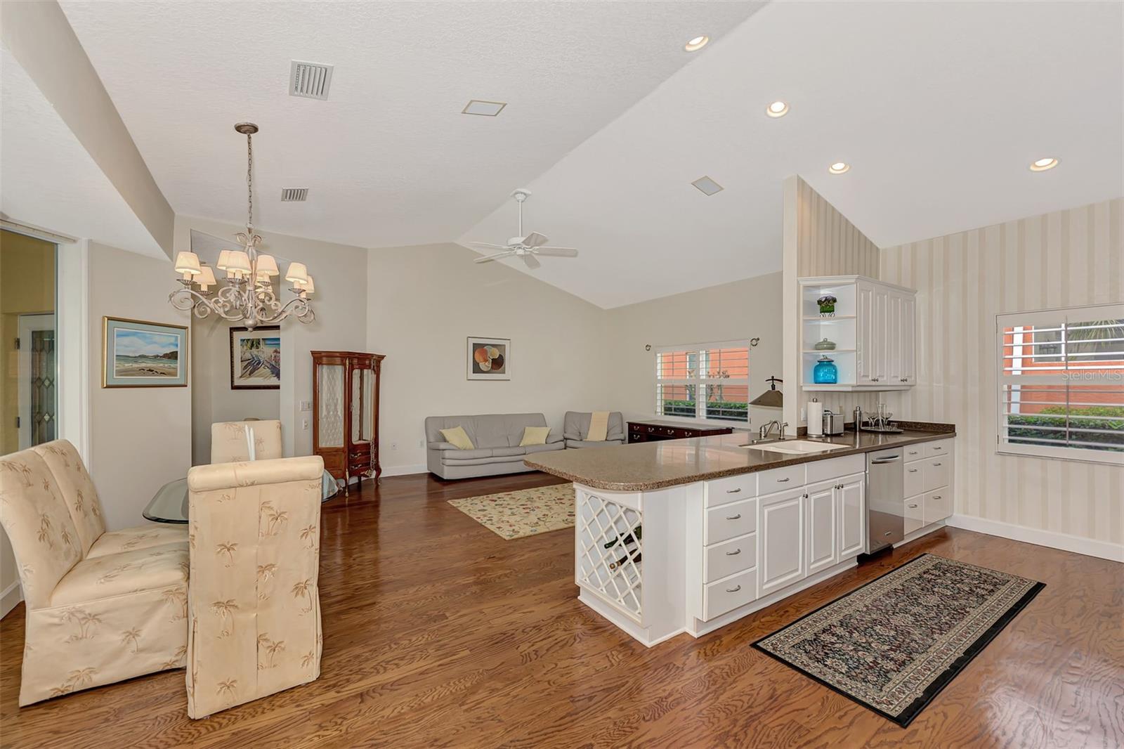 Cathedral Ceiling(s), Ceiling Fans(s), Eat-in Kitchen, High Ceilings, Kitchen/Family Room Combo, Living Room/Dining Room Combo, Primary Bedroom Main Floor, Solid Wood Cabinets, Vaulted Ceiling(s), Window Treatments