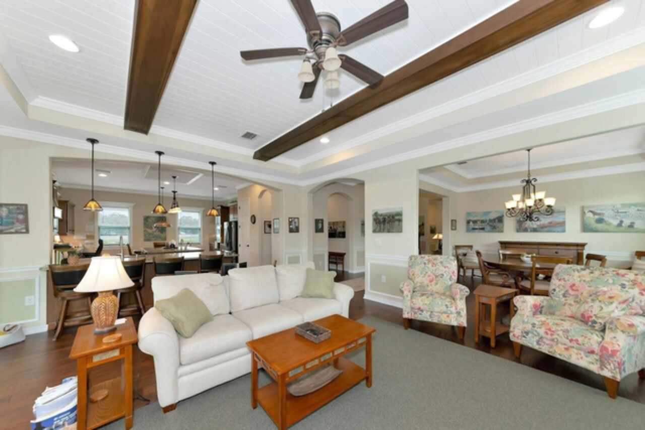 Ceiling Fans(s), Central Vaccum, Chair Rail, Coffered Ceiling(s), Crown Molding, Eat-in Kitchen, High Ceilings, Kitchen/Family Room Combo, Living Room/Dining Room Combo, Open Floorplan, PrimaryBedroom Upstairs, Solid Surface Counters, Tray Ceiling(s), Walk-In Closet(s), Window Treatments