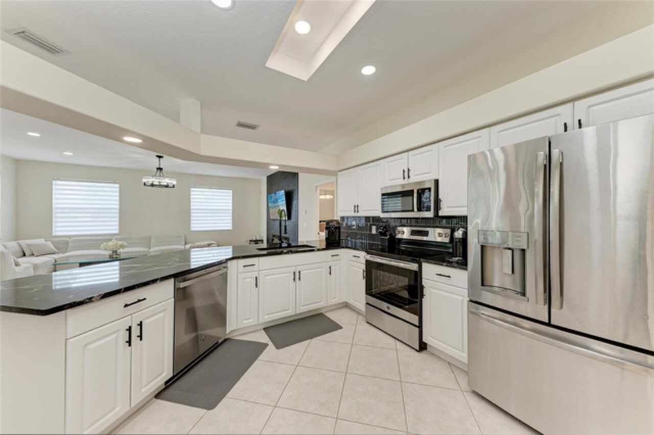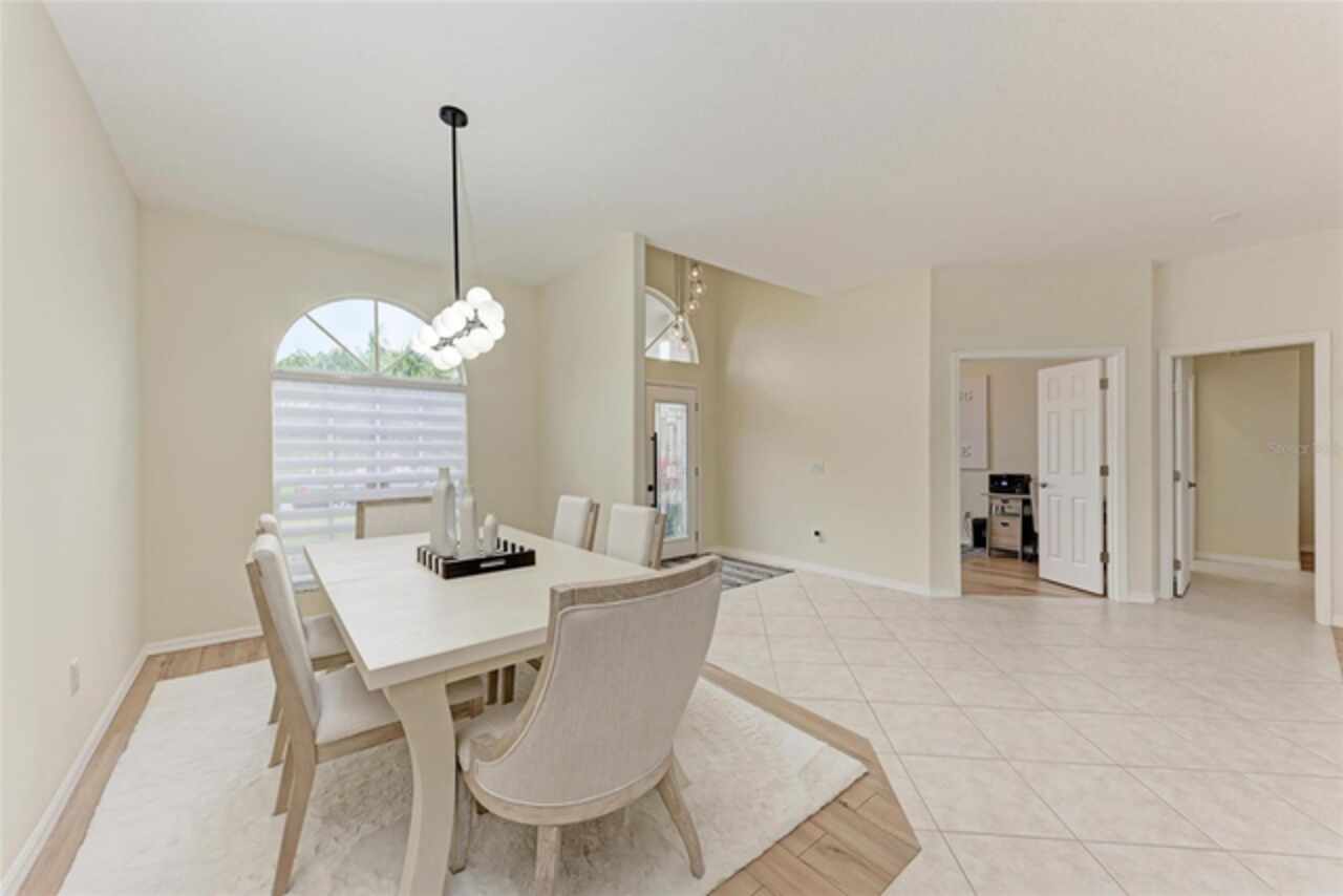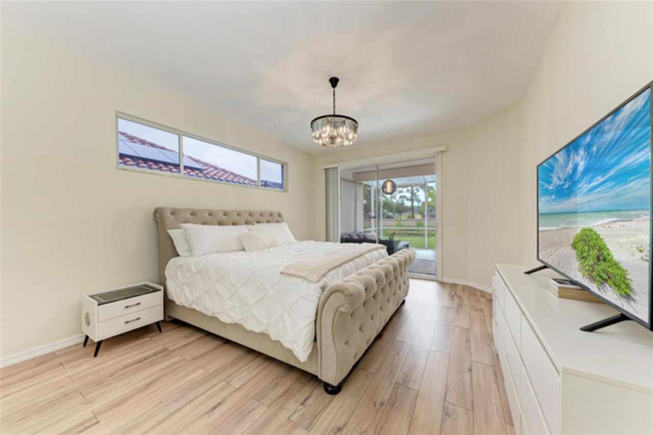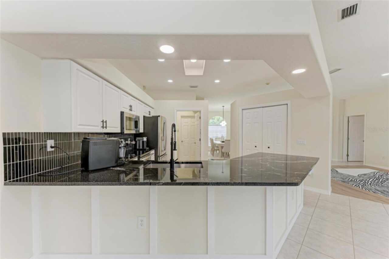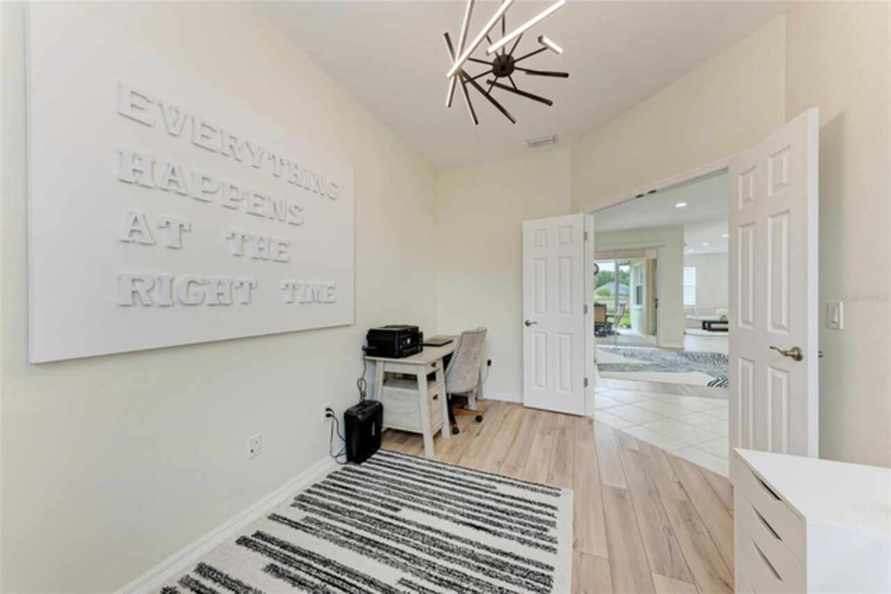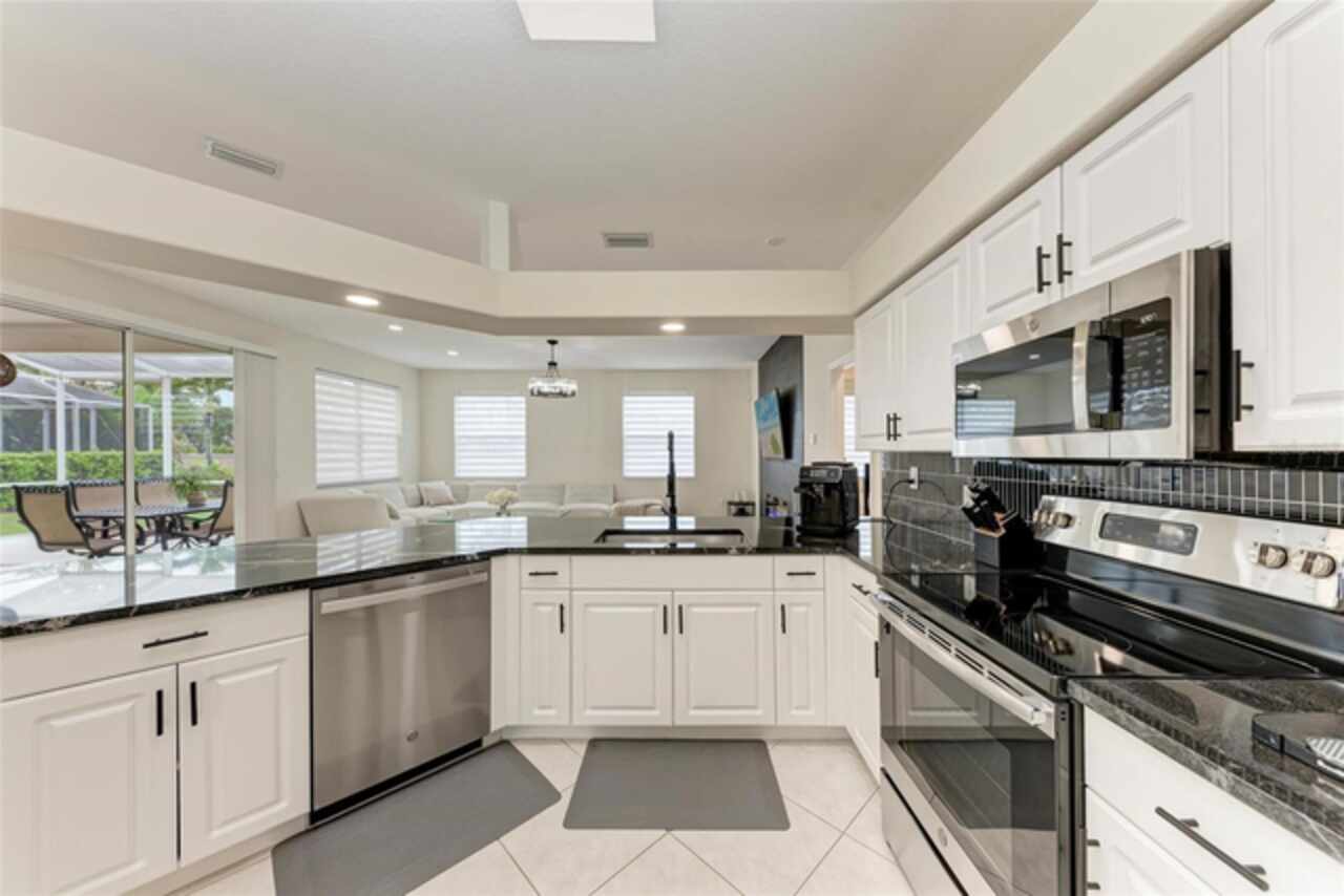 Beautifully updated and move-in ready, this bright and spacious 3-bedroom, 2-bath split floorplan home with a den offers the perfect blend of style and comfort. The owners have thoughtfully renovated both bathrooms and the kitchen, added new flooring, painted the interior and exterior, and installed a brand-new sprinkler system. The oversized kitchen is ideal for entertaining, while the formal dining room and cathedral ceilings add elegance and volume throughout the home. A newly added fireplace and TV feature wall create a stylish focal point in the living room. The master suite features a separate shower and soaking tub, plus a large walk-in closet. Step outside to the massive screened lanai and enjoy tranquil lake views. Additional features include a 2-car garage and a prime location just minutes from UTC, and conveniently close to Lakewood Ranch shops and dining.