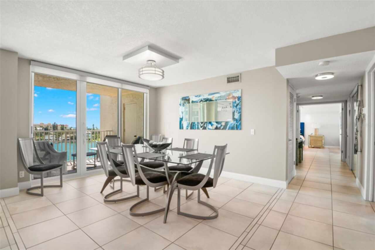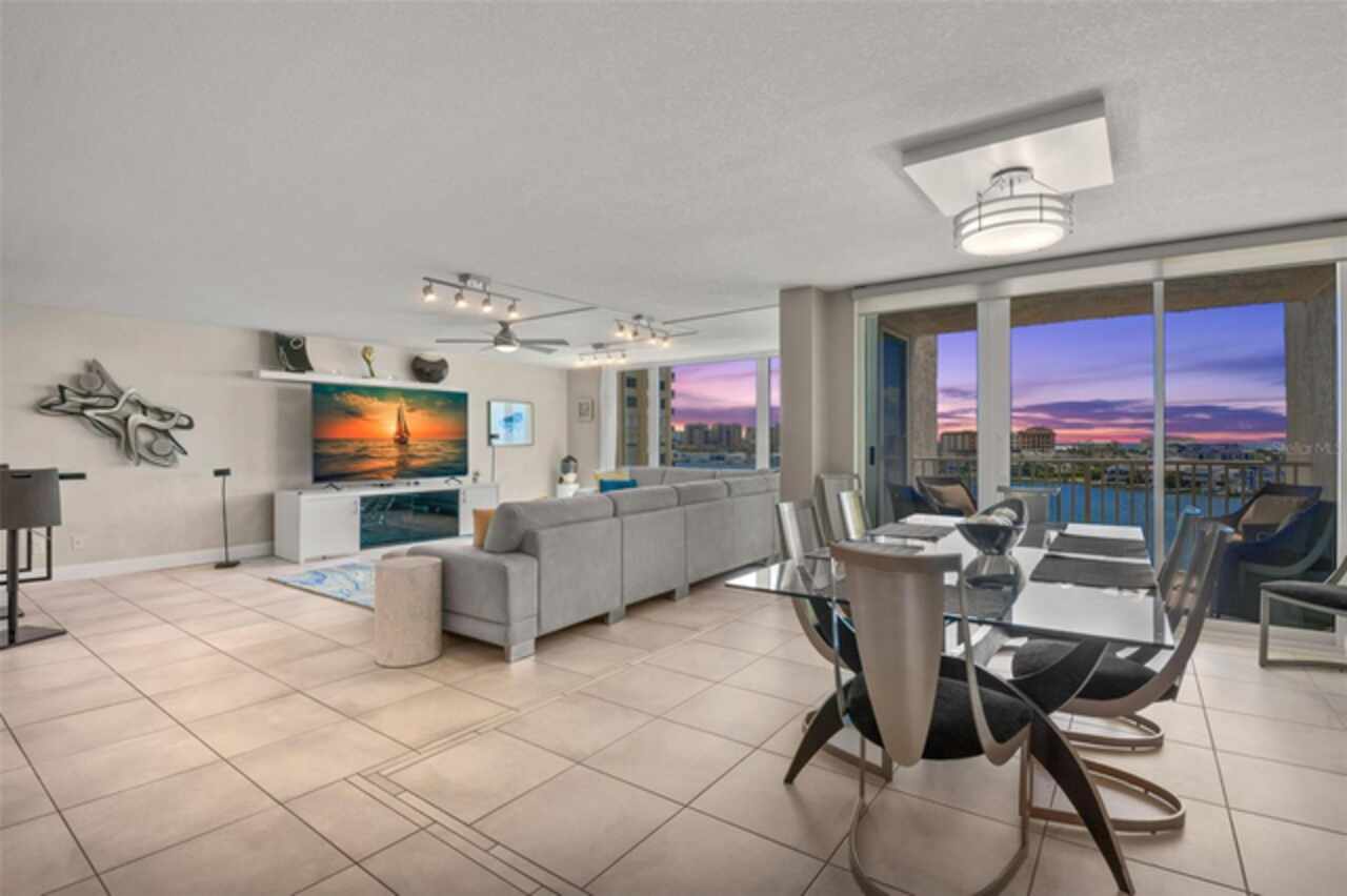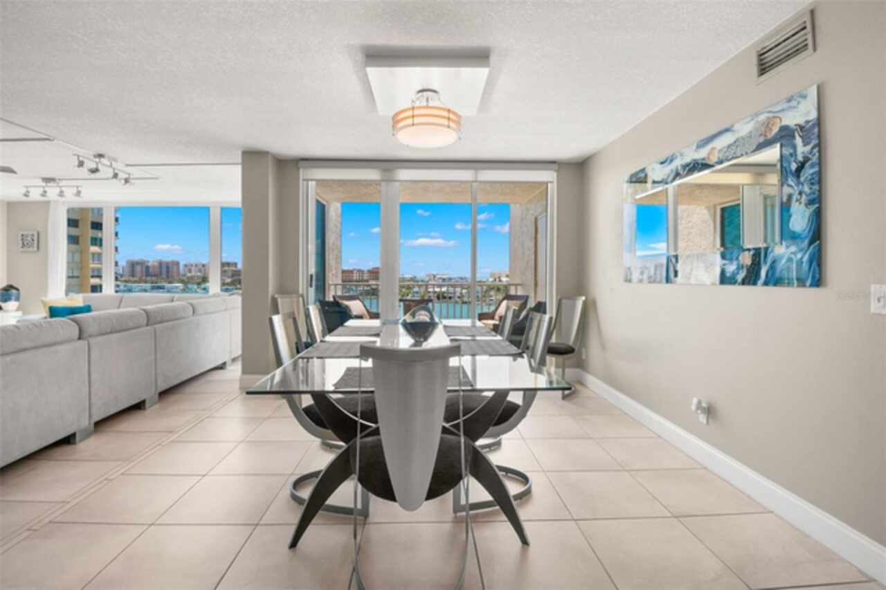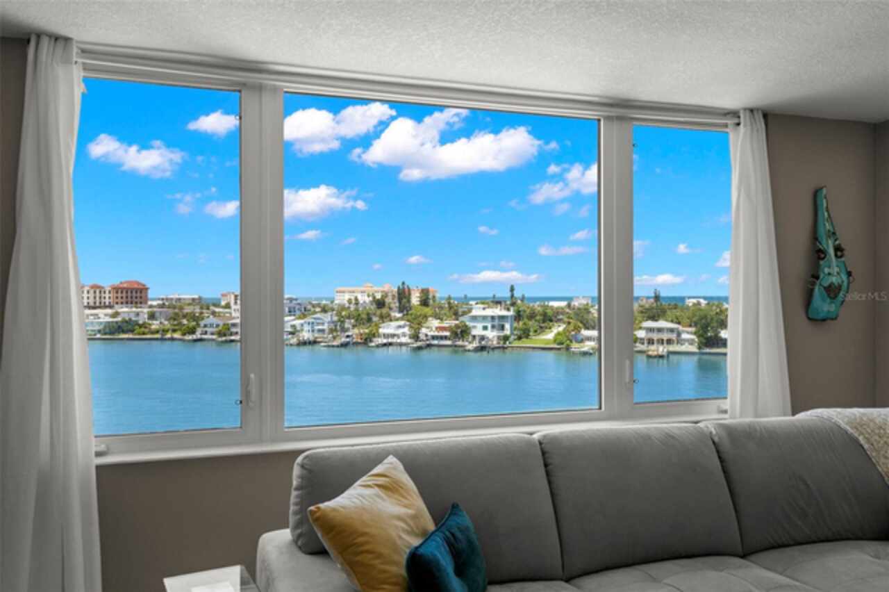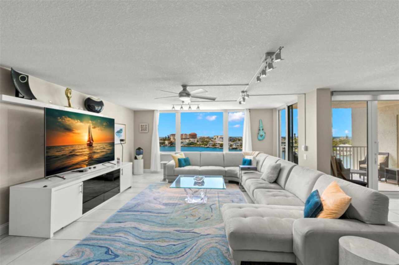 Welcome to waterfront living at its finest in this spacious 2-bedroom, 2-bath west facing condo boasting over 1, 900 square feet and breathtaking water views from every window. Perfectly situated in the highly desirable Island Estates community of Clearwater Beach, this residence offers the rare combination of size, location, and resort-style amenities. From the moment you step inside, the panoramic views of the Gulf, Intracoastal, pool, and marina will captivate you. The open floor plan is designed for both comfort and entertaining, featuring a beautifully updated kitchen with abundant custom storage, stainless steel appliances, double built-in ovens, wine refrigerator, designer granite countertops, and water views from the sink. A built-in seating area flows seamlessly into the expansive great room, while the dining area offers the perfect backdrop of passing boats and playful dolphins. Just off of the dining room you will find a private balcony with breathtaking views and a private storage room. The primary suite is a true retreat with sweeping water views, a private balcony for enjoying stunning sunsets, a large walk-in closet with built-ins, and a ensuite with double vessel sinks, generous storage, and an oversized walk-in shower with beautiful tile work and framless glass enclosure. The second bedroom also enjoys endless water views, a wall of closets, and custom plantation shutters. An updated second bathroom completes the layout, featuring a modern vanity and a tub/shower combo—offering comfort and convenience for guests or family. Storage is abundant with multiple hallway closets, plus a large laundry room with a full-size washer and dryer, water softener, and more cabinetry. Recent upgrades include brand-new impact windows and sliders, as well as a newer HVAC system (2020), providing peace of mind for years to come. This pet-friendly building welcomes one cat or dog up to 35 pounds and features secure entry, covered parking, private storage, tennis courts, fitness center, clubhouse, billiards, and so much more. Best of all, all special assessments will be covered by the seller. Move-in ready and meticulously maintained, this condo is the one you’ve been waiting for—schedule your private tour today and start living the waterfront lifestyle!