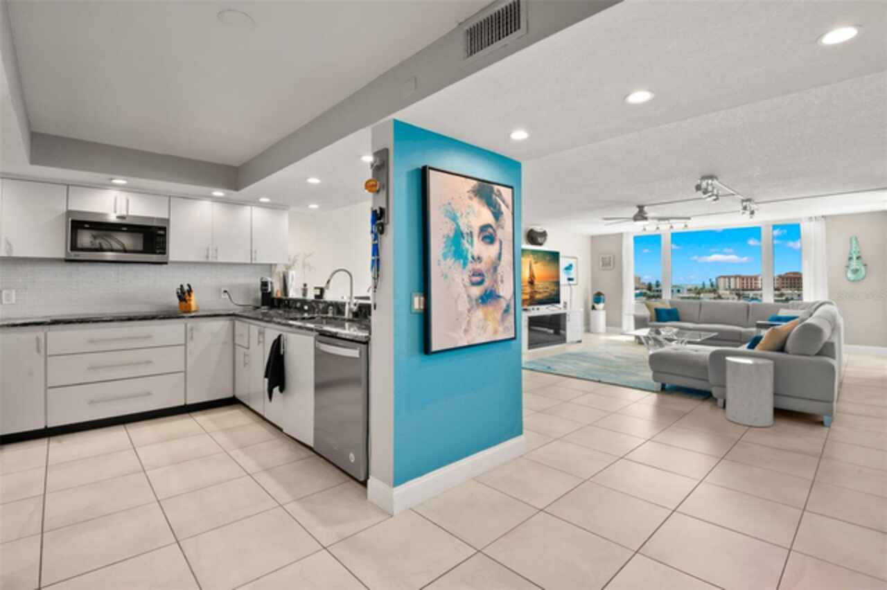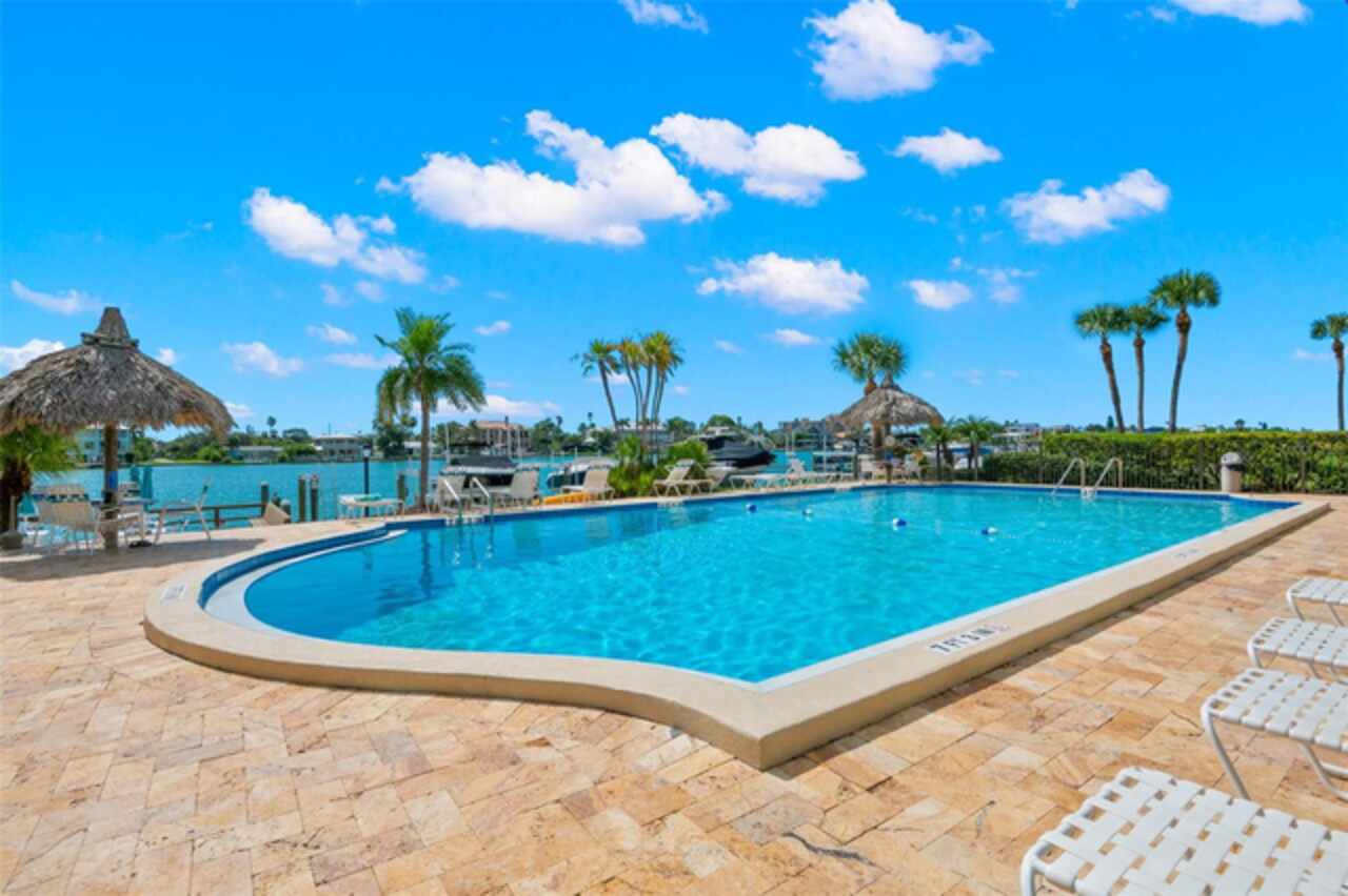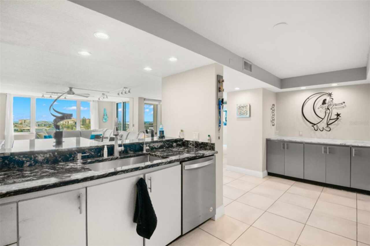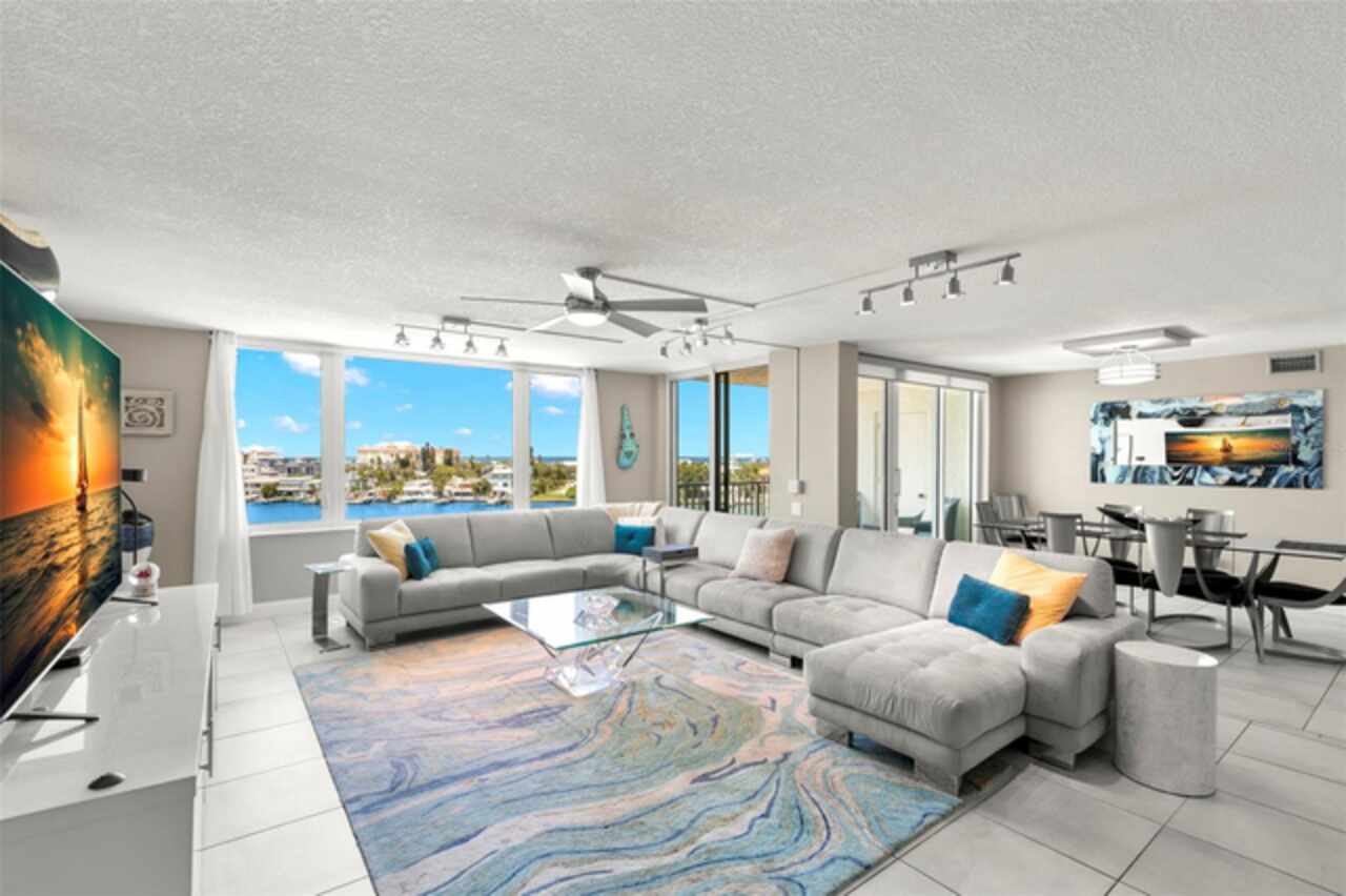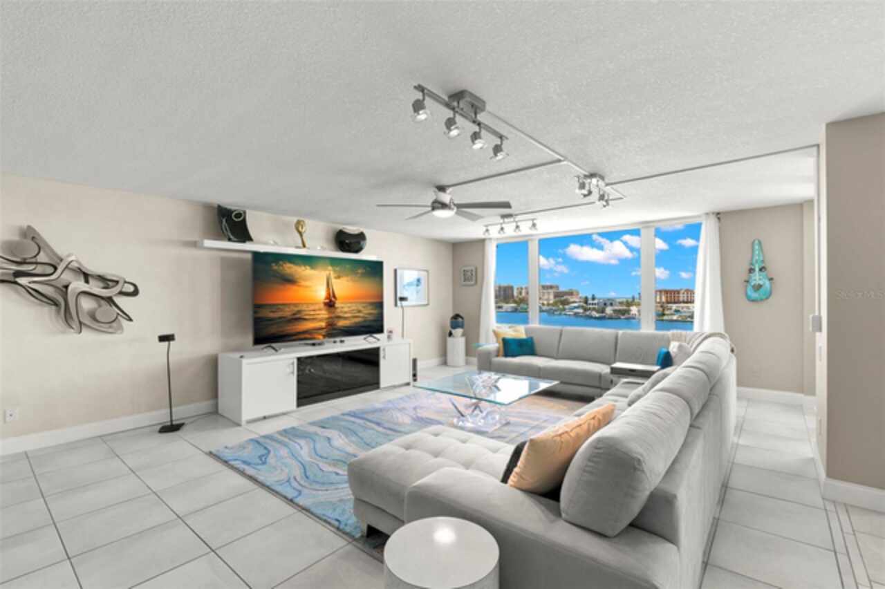 Welcome to waterfront living at its finest in this spacious 2-bedroom, 2-bath west facing condo boasting over 1, 900 square feet and breathtaking water views from every window. Perfectly situated in the highly desirable Island Estates community of Clearwater Beach, this residence offers the rare combination of size, location, and resort-style amenities. From the moment you step inside, the panoramic views of the Gulf, Intracoastal, pool, and marina will captivate you. The open floor plan is designed for both comfort and entertaining, featuring a beautifully updated kitchen with abundant custom storage, stainless steel appliances, double built-in ovens, wine refrigerator, designer granite countertops, and water views from the sink. A built-in seating area flows seamlessly into the expansive great room, while the dining area offers the perfect backdrop of passing boats and playful dolphins. Just off of the dining room you will find a private balcony with breathtaking views and a private storage room. The primary suite is a true retreat with sweeping water views, a private balcony for enjoying stunning sunsets, a large walk-in closet with built-ins, and a ensuite with double vessel sinks, generous storage, and an oversized walk-in shower with beautiful tile work and framless glass enclosure. The second bedroom also enjoys endless water views, a wall of closets, and custom plantation shutters. An updated second bathroom completes the layout, featuring a modern vanity and a tub/shower combo—offering comfort and convenience for guests or family. Storage is abundant with multiple hallway closets, plus a large laundry room with a full-size washer and dryer, water softener, and more cabinetry. Recent upgrades include brand-new impact windows and sliders, as well as a newer HVAC system (2020), providing peace of mind for years to come. This pet-friendly building welcomes one cat or dog up to 35 pounds and features secure entry, covered parking, private storage, tennis courts, fitness center, clubhouse, billiards, and so much more. Best of all, all special assessments will be covered by the seller. Move-in ready and meticulously maintained, this condo is the one you’ve been waiting for—schedule your private tour today and start living the waterfront lifestyle!
