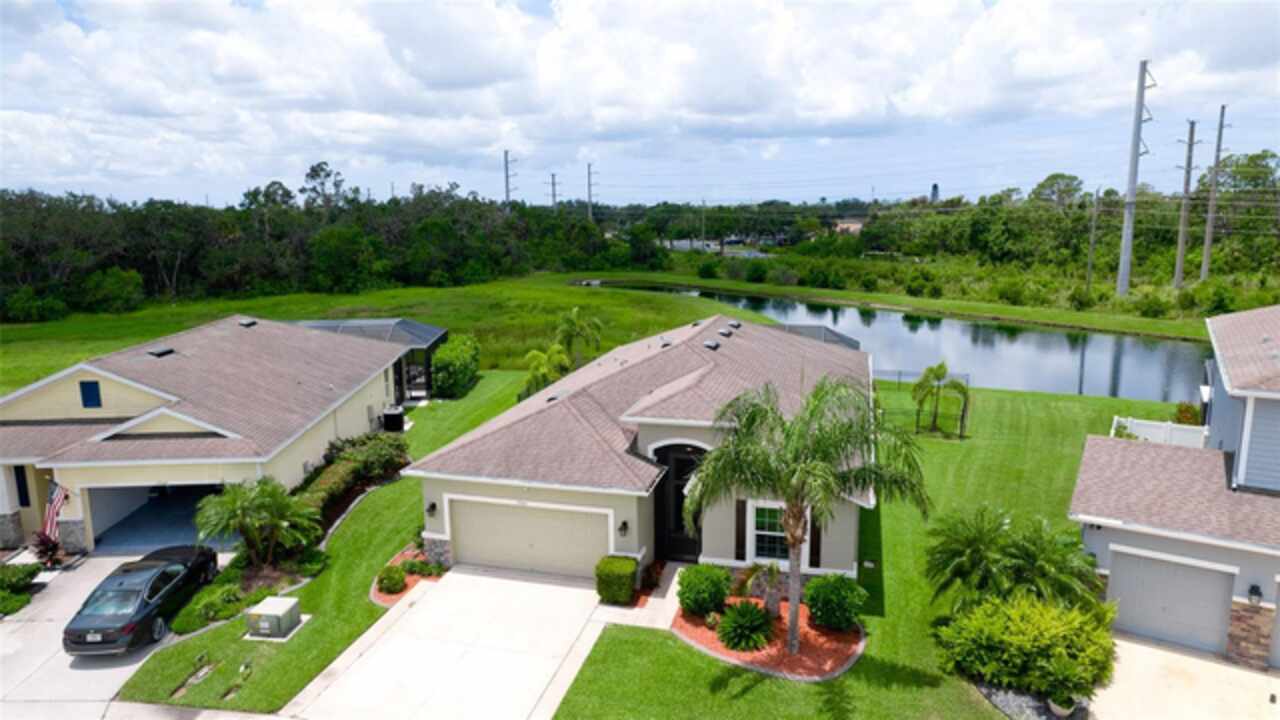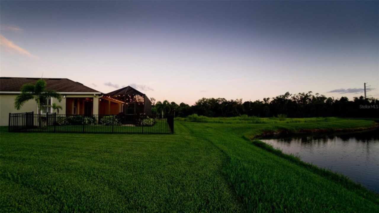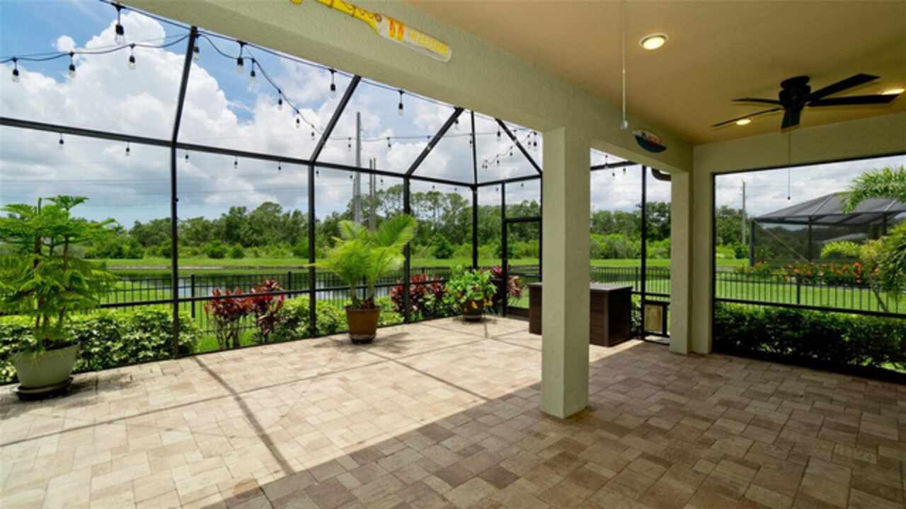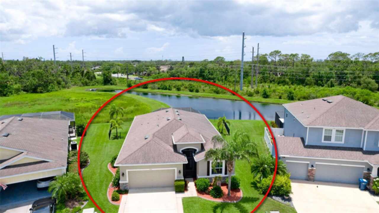 Welcome to this immaculately maintained original home in the desirable community of Stoneledge. With 3 bedrooms, a den, and 2.5 baths across 2, 035 square feet, this residence offers a seamless blend of comfort, style, and thoughtful upgrades. Freshly painted interior 11/2025. Nestled on a fully fenced homesite overlooking a tranquil pond, the backyard is your private oasis—complete with an extended screened lanai, pavered patio, Edison-style lighting, and concrete under the rear fence for added security. Enjoy spectacular evening sunsets right from your backyard. Inside, you’ll find tile flooring throughout the main living areas, luxury vinyl waterproof plank flooring in the office, and carpet in primary & one guest bedroom. The wide entry foyer, custom crown molding, updated baseboards, and plantation shutters at the dining room and office enhance the home’s elegant character. The gourmet kitchen is equipped with stainless steel appliances, 42-inch wood cabinetry, granite countertops, under-cabinet lighting, USB-equipped, pendant lights over the island, and slide-out drawers in the lower cabinets. A pantry with durable steel shelving completes the space. Additional highlights include: Accordion and roll-down hurricane shutters throughout, included generator, 20-amp service in the den for an extra fridge or freezer, Primary suite with double vanities, soaking tub, and separate shower, large front-load washer and dryer with storage shelves, closet upgrades with double-door entry and blackout curtains in one guest room. Low monthly HOA of just $92, covering ponds, common areas, entrance, dog park, and mailboxes. New AC system (Feb 2024) with transferable 10 year warranty. Average electric bill of just $125/month. Every detail has been thoughtfully designed and lovingly cared for—this is truly a move-in-ready gem in a sought-after neighborhood.