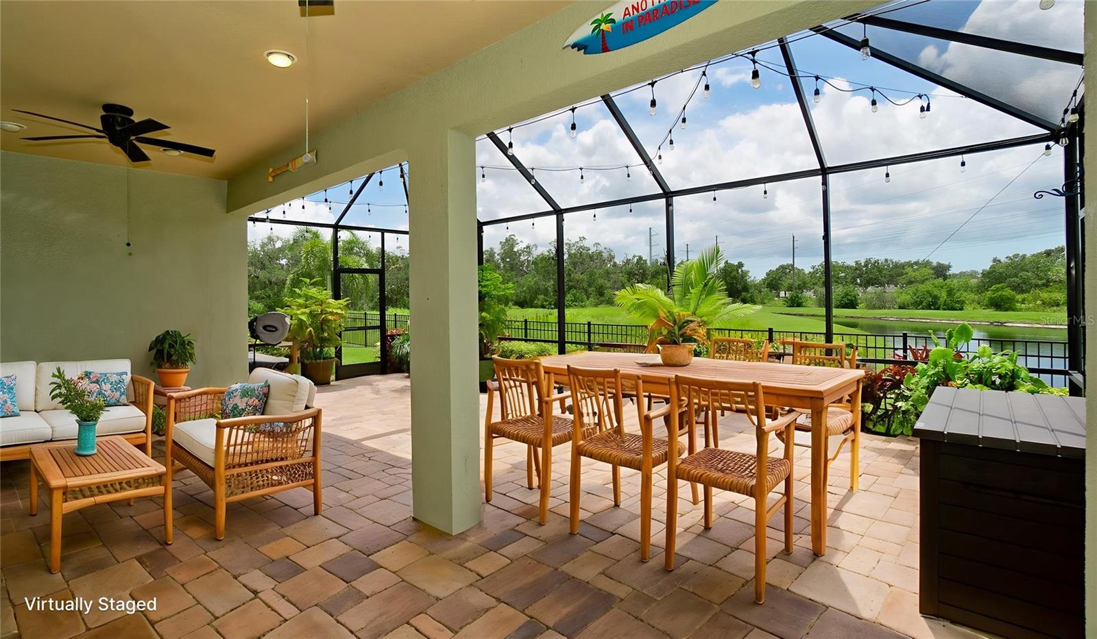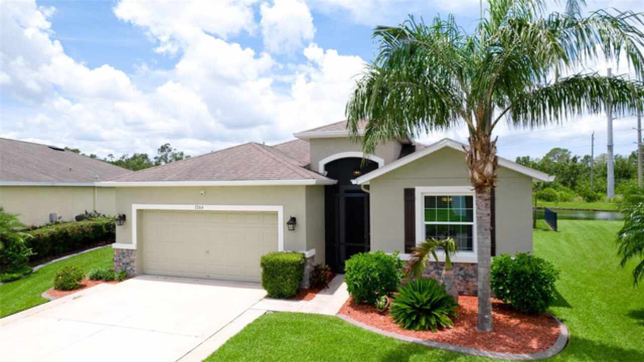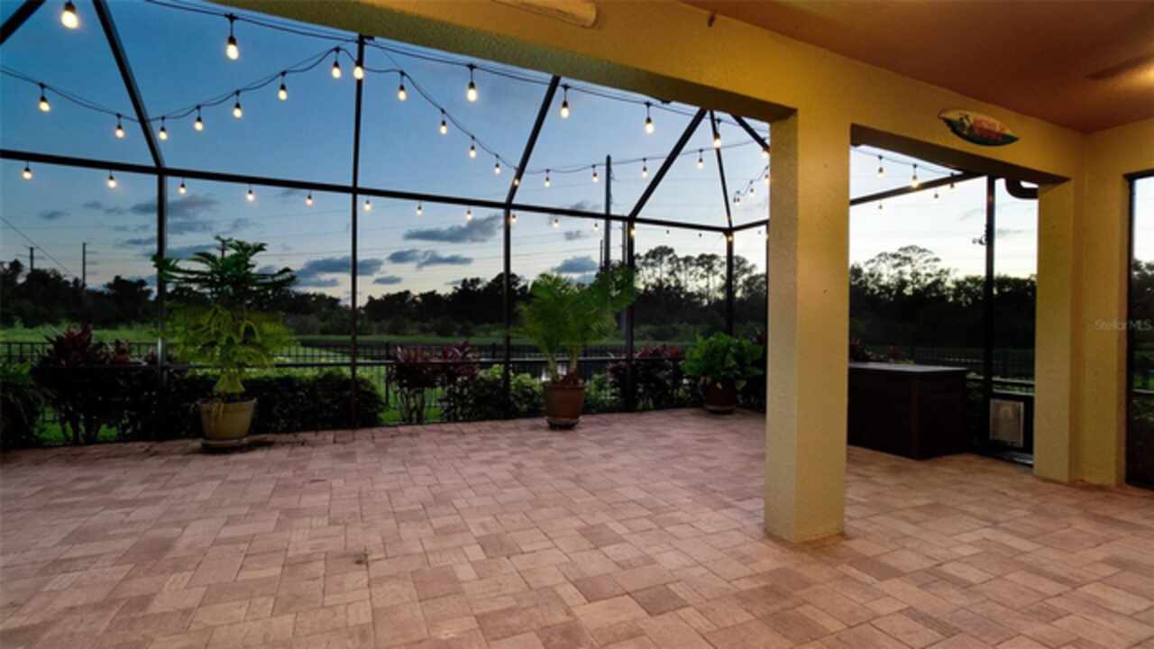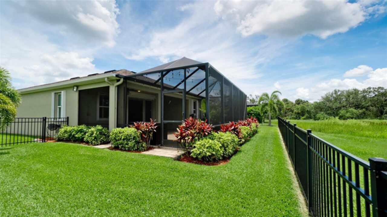 Welcome to this immaculately maintained original home in the desirable community of Stoneledge. With 3 bedrooms, a den, and 2.5 baths across 2, 035 square feet, this residence offers a seamless blend of comfort, style, and thoughtful upgrades. Freshly painted interior 11/2025. Nestled on a fully fenced homesite overlooking a tranquil pond, the backyard is your private oasis—complete with an extended screened lanai, pavered patio, Edison-style lighting, and concrete under the rear fence for added security. Enjoy spectacular evening sunsets right from your backyard. Inside, you’ll find tile flooring throughout the main living areas, luxury vinyl waterproof plank flooring in the office, and carpet in primary & one guest bedroom. The wide entry foyer, custom crown molding, updated baseboards, and plantation shutters at the dining room and office enhance the home’s elegant character. The gourmet kitchen is equipped with stainless steel appliances, 42-inch wood cabinetry, granite countertops, under-cabinet lighting, USB-equipped, pendant lights over the island, and slide-out drawers in the lower cabinets. A pantry with durable steel shelving completes the space. Additional highlights include: Accordion and roll-down hurricane shutters throughout, included generator, 20-amp service in the den for an extra fridge or freezer, Primary suite with double vanities, soaking tub, and separate shower, large front-load washer and dryer with storage shelves, closet upgrades with double-door entry and blackout curtains in one guest room. Low monthly HOA of just $92, covering ponds, common areas, entrance, dog park, and mailboxes. New AC system (Feb 2024) with transferable 10 year warranty. Average electric bill of just $125/month. Every detail has been thoughtfully designed and lovingly cared for—this is truly a move-in-ready gem in a sought-after neighborhood.