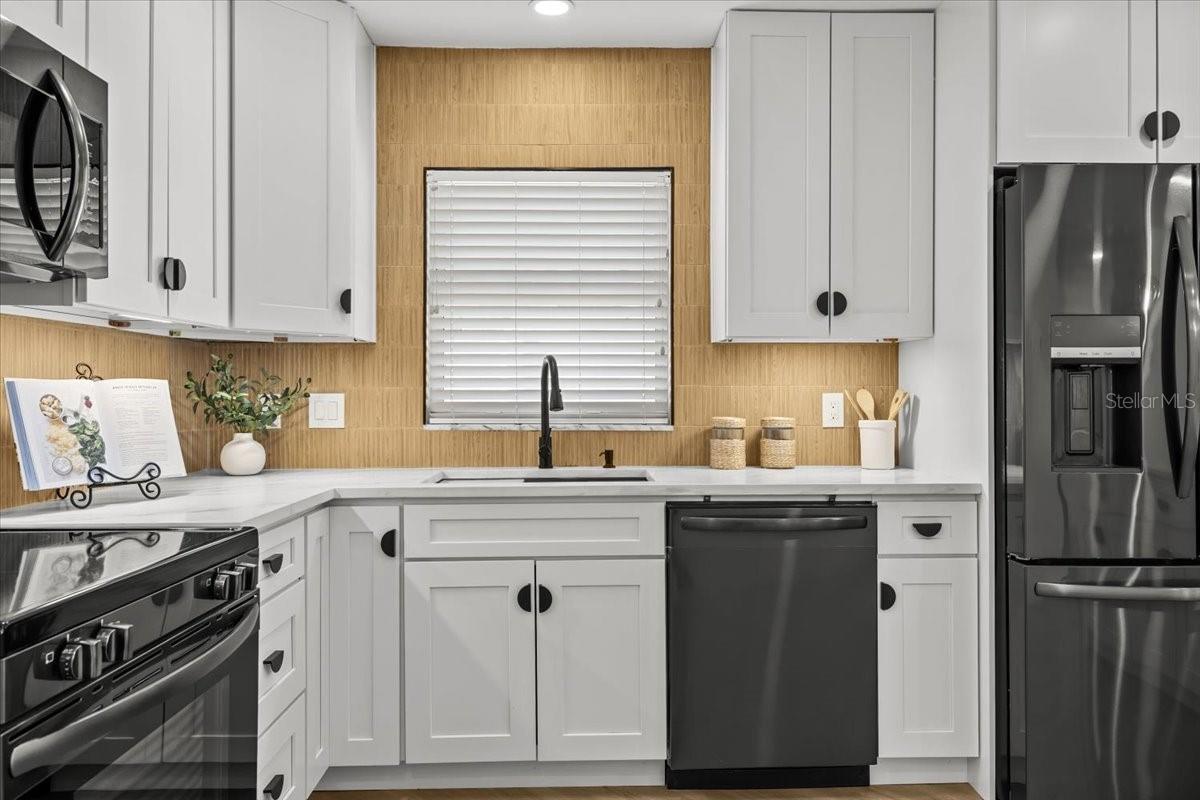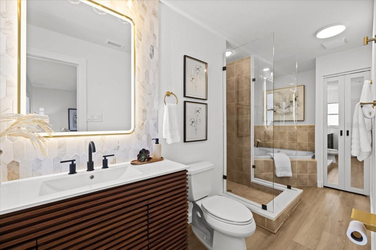 $15k PRICE IMPROVEMENT! Seller motivated. Looking for a home that simply feels good the moment you walk in? This newly remodeled 3-bed, 2-bath block-constructed home with garage delivers modern style, effortless functionality, and undeniable “good vibes only.” Whether you’re seeking a primary residence, vacation retreat, or income-producing rental, every inch of this thoughtfully designed home maximizes comfort and convenience without an ounce of wasted space. Freshly painted inside and out, the home’s curb appeal shines with new landscaping, a charming front porch, and warm cedar ceiling. Step inside and instantly feel the bright, airy flow of the open-concept living area filled with natural light and soaring style. The sleek, dimmable LED recessed lighting, dry bar with built-in cabinetry, and showstopping ombré pendant lights create a perfect entertaining space. The dream kitchen blends function and beauty with brand-new 2025 black stainless steel appliances, white shaker soft-close cabinetry, quartz countertops, under-cabinet lighting, and a stylish backsplash. A breakfast bar adds extra seating, while a separate formal dining room with a modern dimmable chandelier is perfect for gatherings. Durable luxury vinyl waterproof flooring runs throughout—no carpet, low maintenance, and completely pet-friendly. Each of the three spacious bedrooms features generous closet space. The primary suite is a true retreat, offering a spa-like bathroom with a jetted Jacuzzi corner tub, glass walk-in shower, large vanity with lighted LED mirror, and elegant matte black/gold fixtures. The guest bath mirrors this stylish design for a cohesive, high-end feel. A split third bedroom or office/flex space enjoys its own direct access (separate from guest's backyard access) to the screened lanai and backyard, making it ideal for remote work or guests. Step outside to a vinyl-fenced backyard with new sod and low-maintenance landscaping—ready for a lounge area, swingset, and/or future swim spa. The indoor laundry room is both updated and functional, featuring a utility sink, shelving, hanging rod, and space for a full-size stackable washer/dryer. Additional storage is abundant, including a large built-in pantry/closet. The oversized rear garage offers a full workshop bench with lighting, shelving, and easy alley access through a new electric remote-controlled gate, plus a large parking pad and space for your shed that has electric available. Front street parking is also available. Major/minor updates give peace of mind and efficiency: 2022 Roof, 2023 HVAC with new 2025 blown-in insulation, 2025 water heater, drywall/trim, new doors/doorstops, hardware, ceiling fans, lighting, and outdoor security fixtures. This home radiates positive energy—beautifully staged and designed for both style and smart living. Every detail, from the lighting to layout, was intentionally chosen to make life easier and more enjoyable. Location highlights: Just 11 minutes to South Tampa, 23 minutes to MacDill AFB, and an easy straight shot to Downtown St. Pete & the Pier. Only 4 minutes to Gateway Market Center (Publix, Target & more), plus walking distance to Fossil Park and 4th Street N dining/retail. And of course—world-class beaches are only minutes away! Discover a home that not only looks incredible but feels incredible. Move-in ready, low-maintenance, and high-style—this one checks every box.