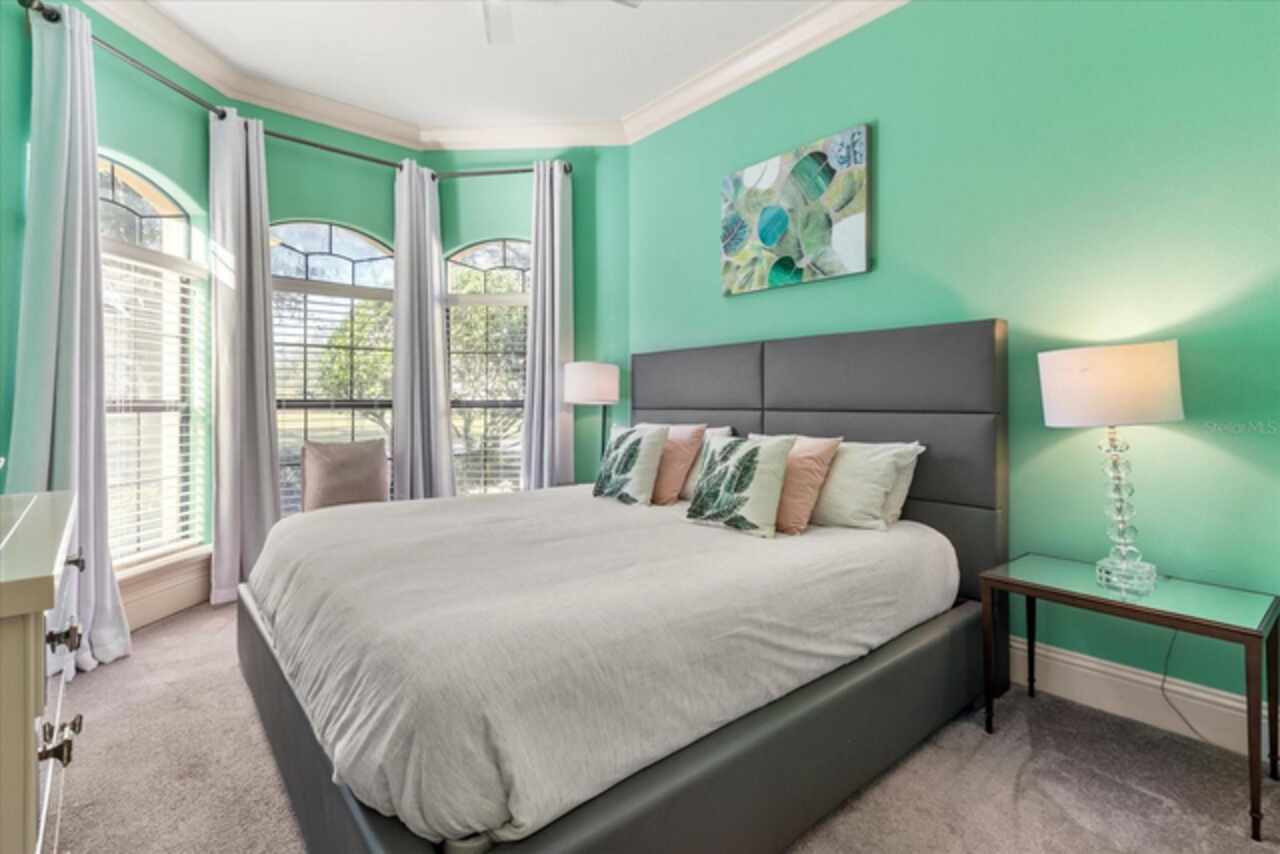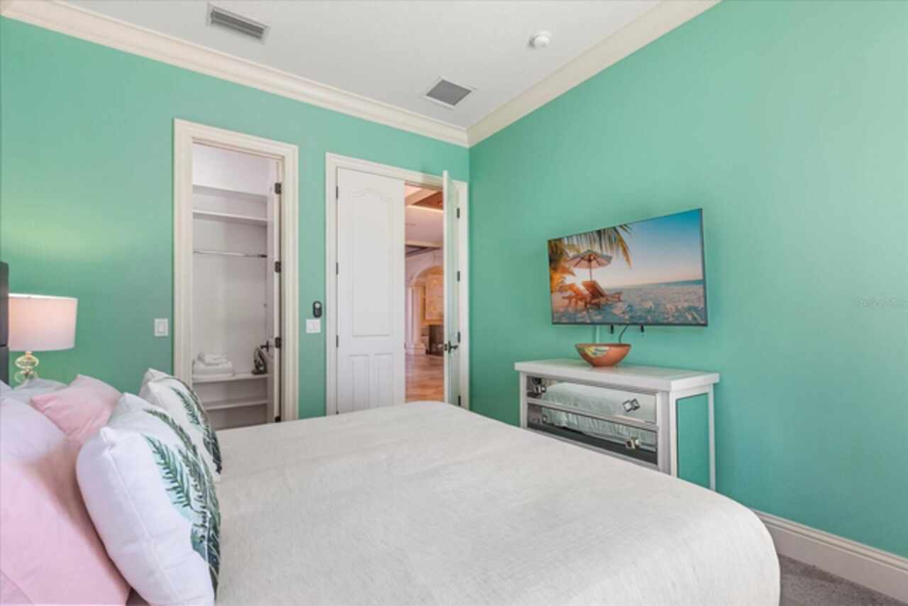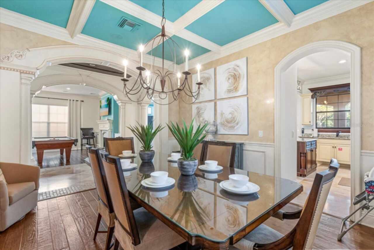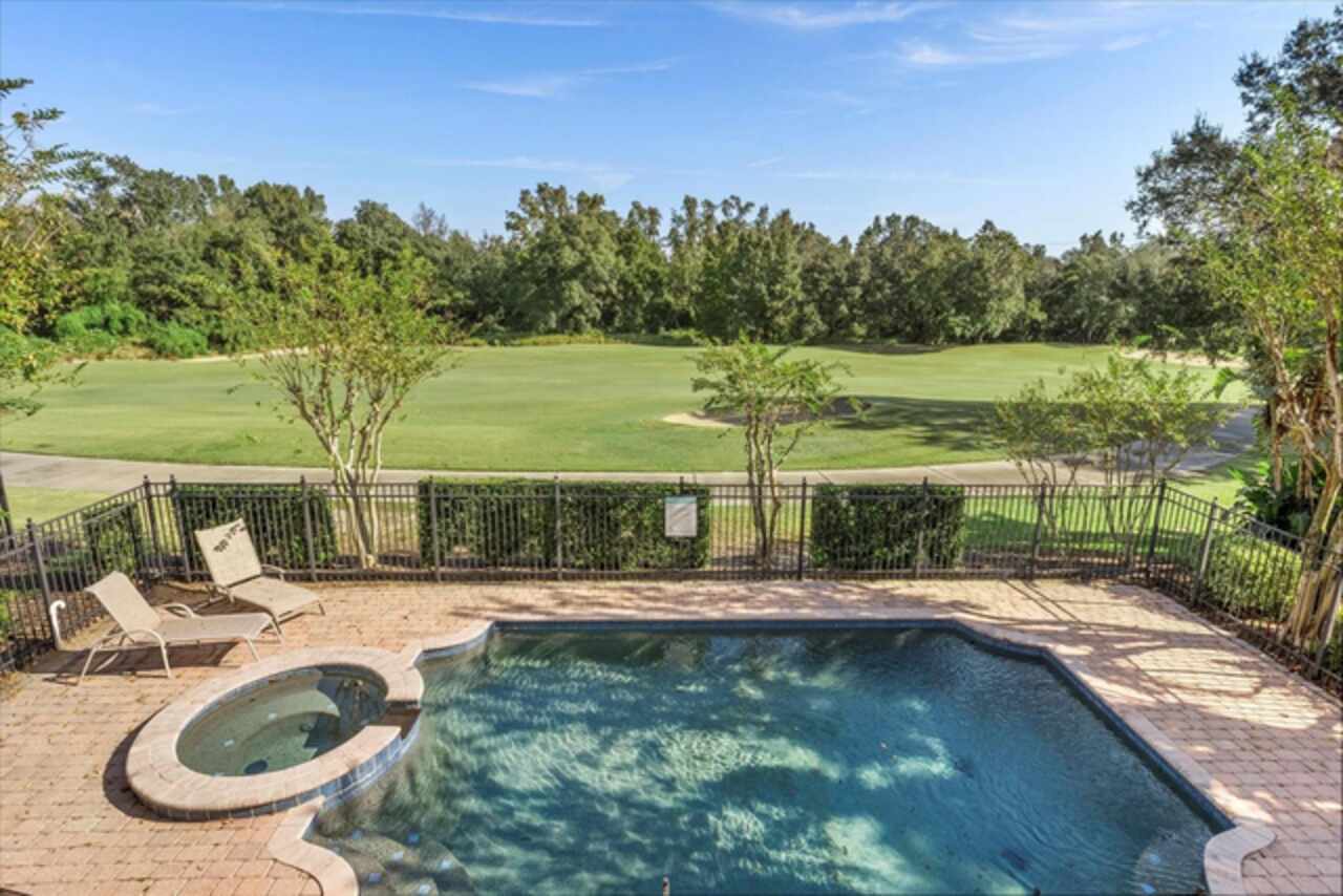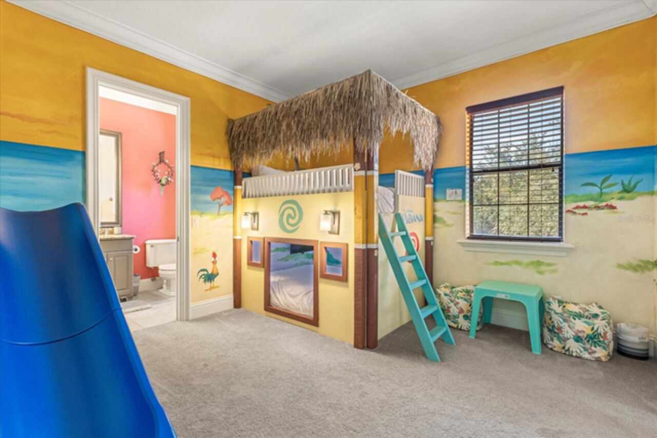 **Active Reunion Club Membership**New downstairs A/C & pool pump / filter installed 2025** Welcome to the renowned guard gated, golf community of Reunion Resort! Positioned with frontage, and beautiful views of the Tom Watson Signature golf course, this 5 bed 4 bath home is the golfers paradise. As you enter the home you will immediately notice the mediterranean style, beauty of this home. Travertine tile, and scraped wood flooring cover the entire first level of this home, with Lvp wood flooring being added to the second floor. Making your way through the home, you you will notice the custom features throughout including built in bookshelves in several areas of the home, custom wood accents on the ceiling, and a chef's kitchen. Downstairs you will find a lounge area in the center of the home, complete with a pool table, and a formal dining room directly across from it, allowing ample space for you and family to gather and create memories together. The chef's kitchen is complete with custom appliances to match the cabinets, granite countertops, and a seating area in the kitchen, overlooking the beautiful golf views, and the oversized pool. As you make your way up stairs you will notice that there is a second living room area, designed as a comfortable place for family and friends to come together and hangout, or watch a movie. Two theme rooms have been added to the home, giving a fun, safe area for the little ones to enjoy themselves, and make forever memories. This home is a true turnkey rental property, with bookings already in place that will convey to you at closing. Reunion Resort is a luxury resort, that also allows short term rental, and is a top choice for visitors of all ages, Reunion features 12 Pools In The Community, Including a multimillion dollar water park, Complete with a lazy river, splash park for the little ones, tiki bar, & Water Slides, 3 championship golf courses, 5 restaurants, tennis/pickleball courts, putt putt golf, and many more amenities, making Reunion truly a city within gates. This home is turnkey, and has so much more to appreciate, that you will have to see in person to appreciate. It is now your turn to call Reunion Resort your new home.