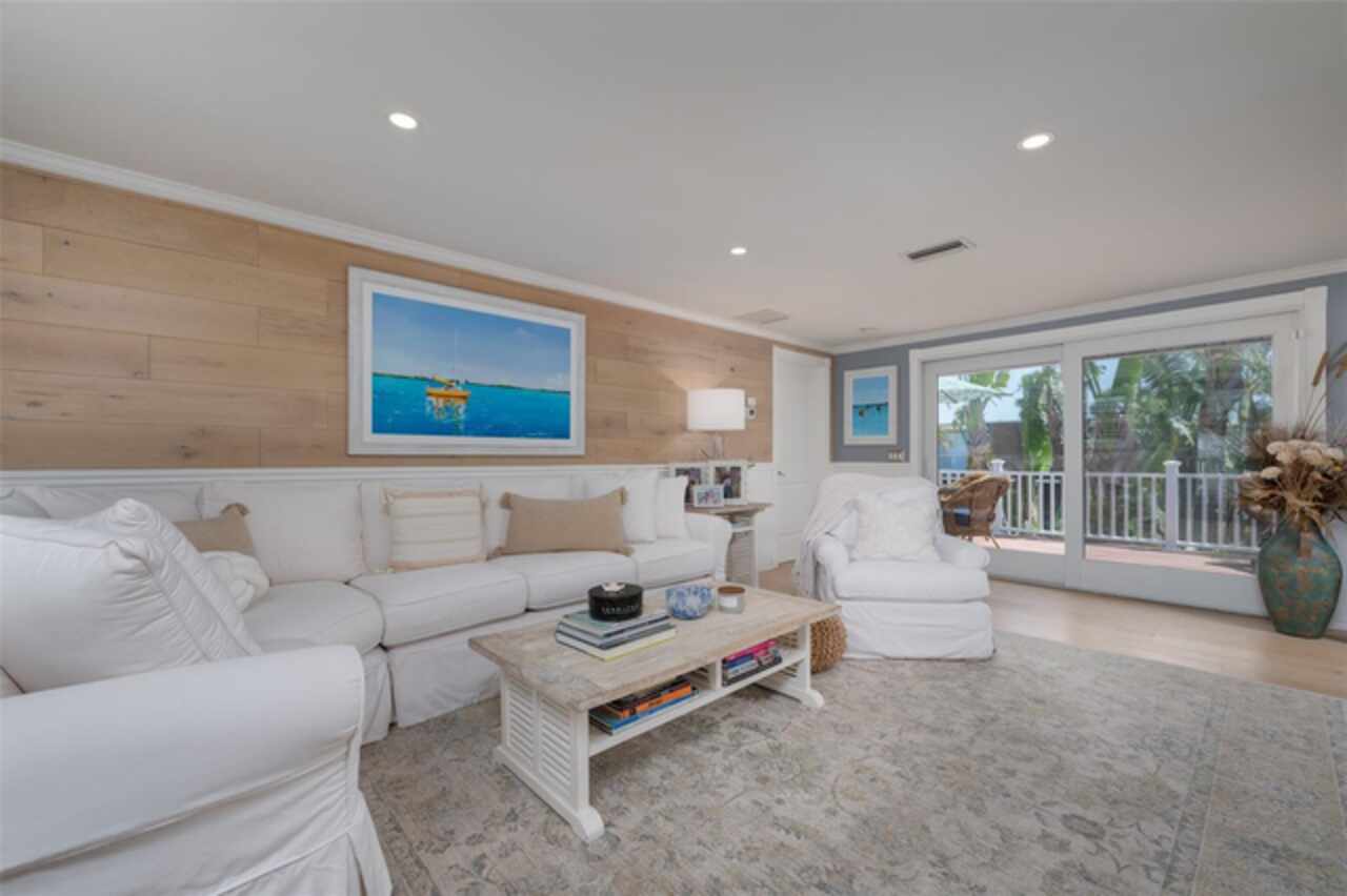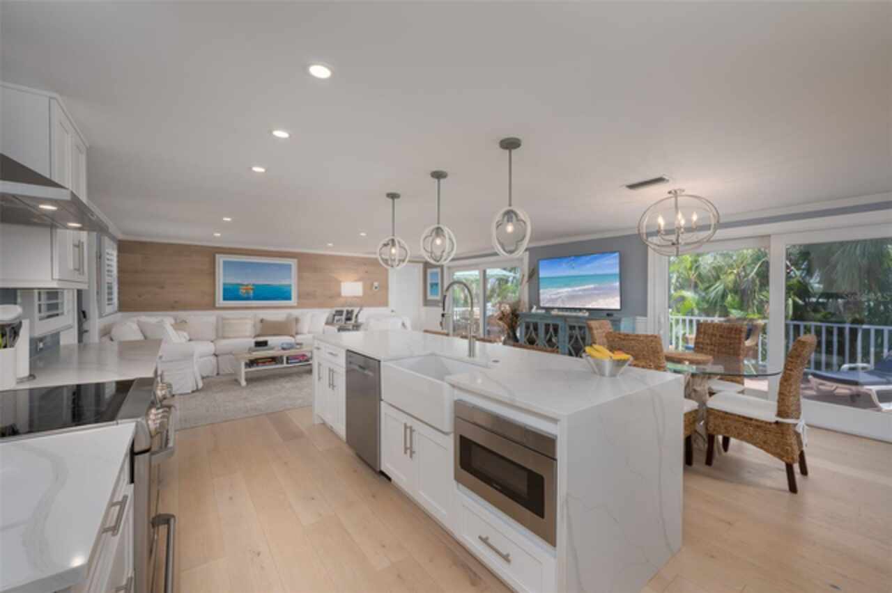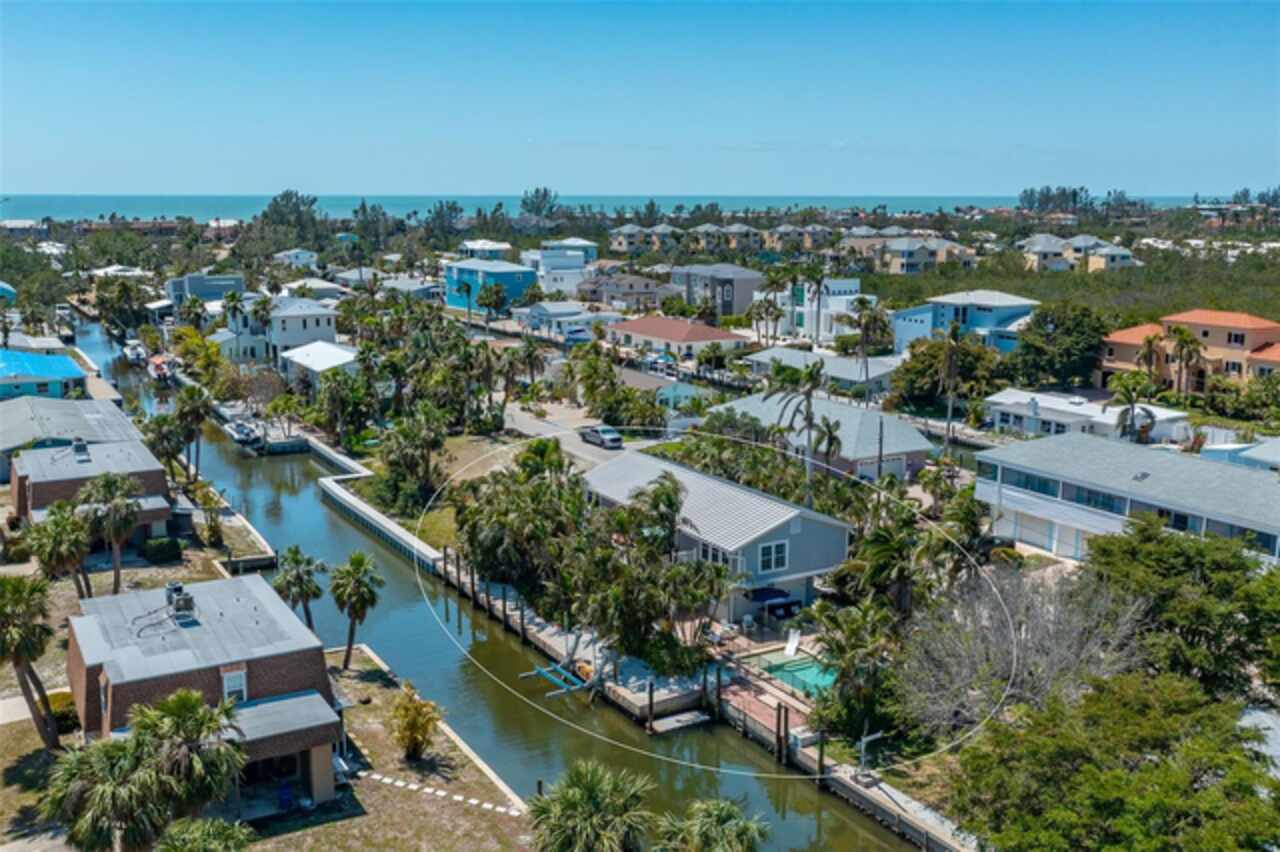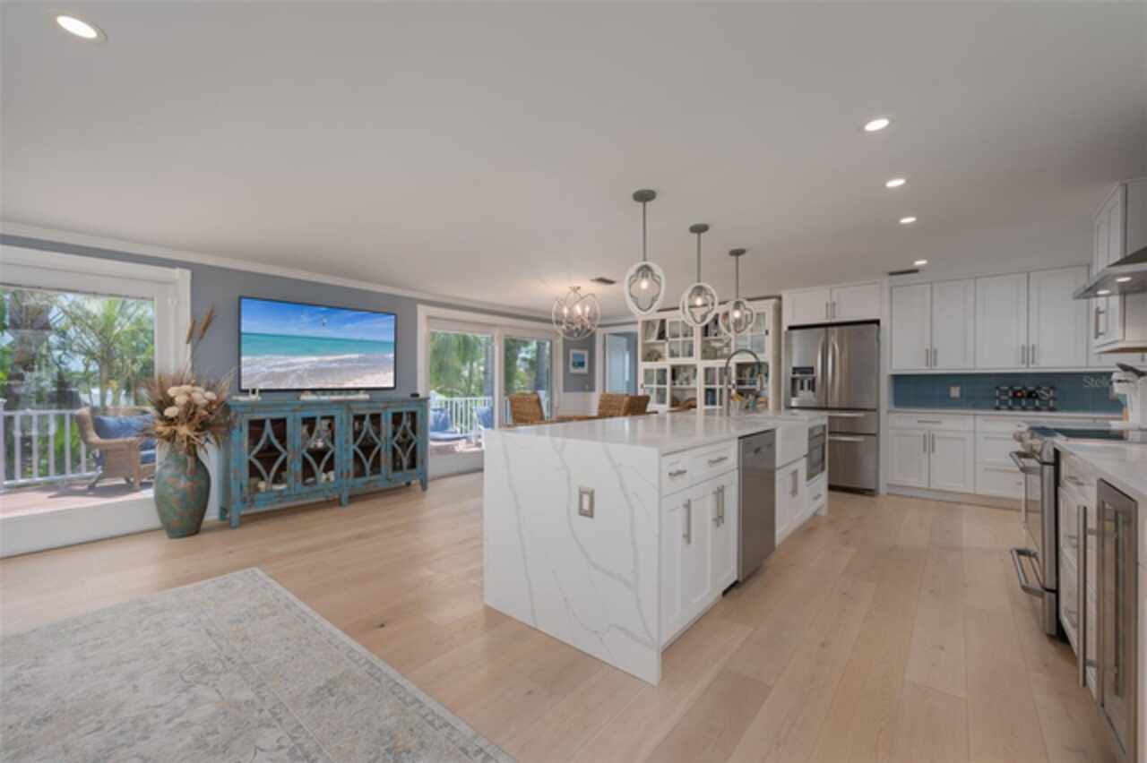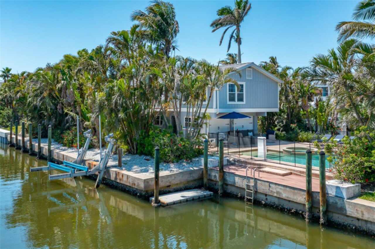 Discover your own tropical paradise on the serene North end of Longboat Key and has deeded beach access, a rare gem that blends privacy, luxury, and coastal charm. This stunning, fully renovated home boasts a thoughtfully designed open split-floor plan, perfect for relaxed living and entertaining. The custom-designed kitchen is a chef's dream, featuring sleek solid countertops, custom cabinetry, and premium stainless-steel appliances. An expansive island bar creates an inviting space for casual dining and social gatherings. Gorgeous, engineered wood floors flow throughout the main living areas, adding warmth and elegance. The spacious master suite offers a tranquil retreat, complete with a newly remodeled spa-like master bath ideal for unwinding after a day spent on the water. A well-appointed guest bedroom with its own private bath ensures comfort and privacy for visitors. Step outside to your private oasis, where a sprawling rear balcony overlooks serene canal views and the heated pool. The expansive paver deck offers ample space for lounging, dining, and soaking up the Florida sun. Boating enthusiasts will be delighted by the 120-foot seawall, 7, 000 lb. boat lift, and convenient docking and mooring features providing effortless access to the open water. This property is designed with both style and security in mind. The durable standing seam metal roof and hurricane-resistant impact glass windows and doors provide peace of mind during storm season. The lower level features a versatile guest or in-law suite complete with an upgraded bathroom and kitchenette, ideal for hosting family or accommodating extended stays. Lush, meticulously maintained landscaping showcases a variety of palm trees and fruit trees, creating a true tropical escape. The two-car garage, finished with a sleek and durable epoxy coating, combines style with functionality.