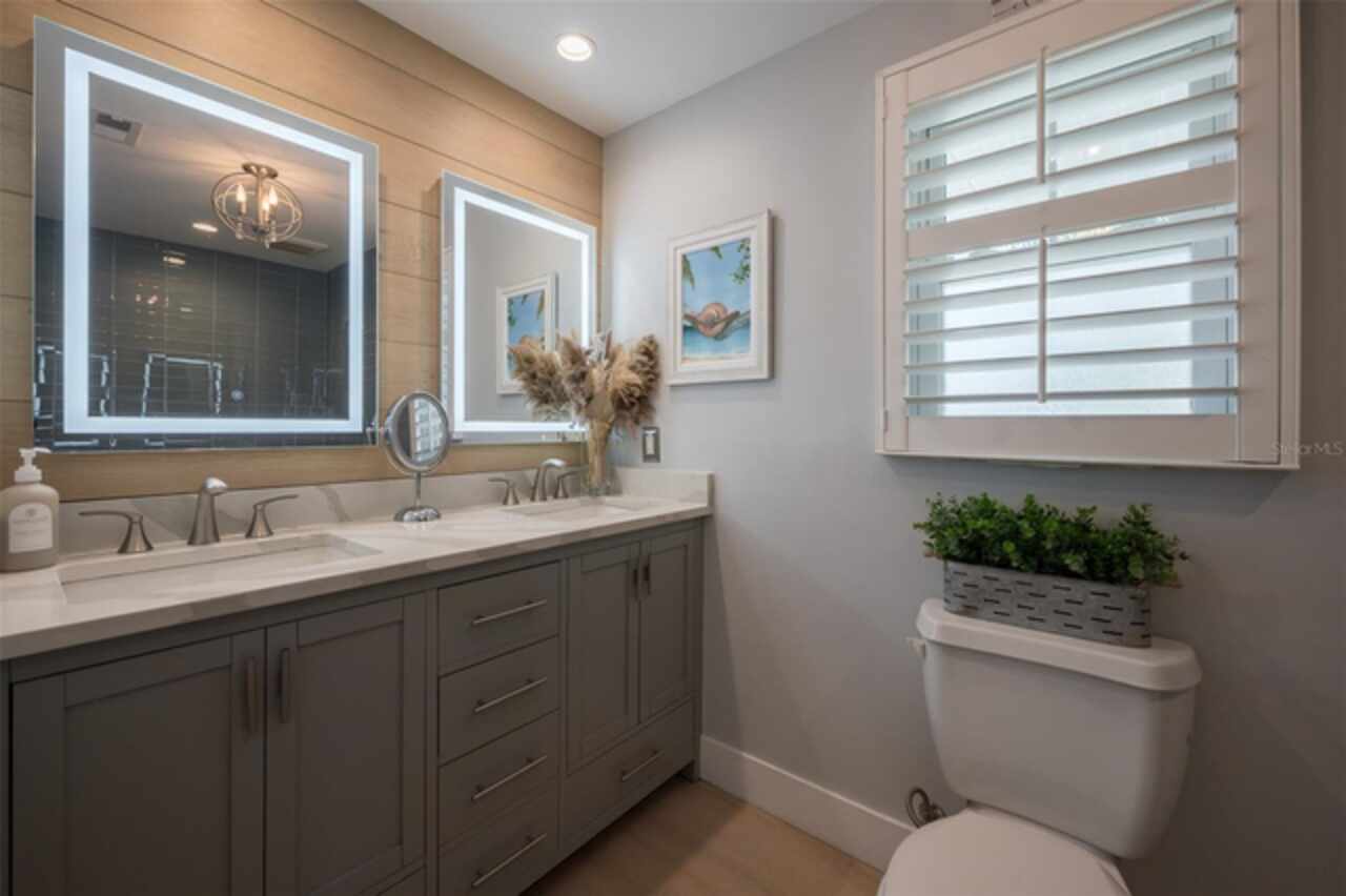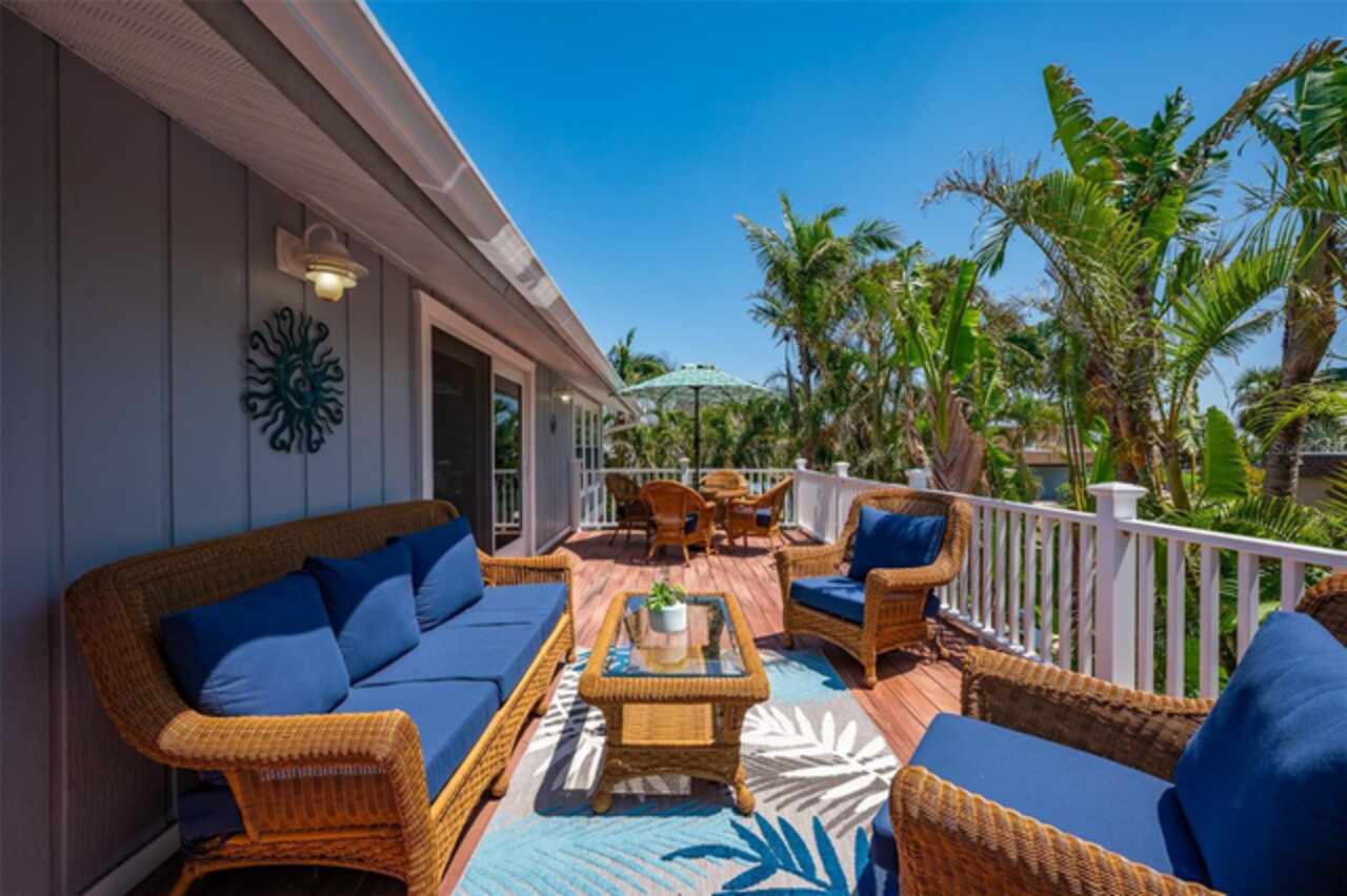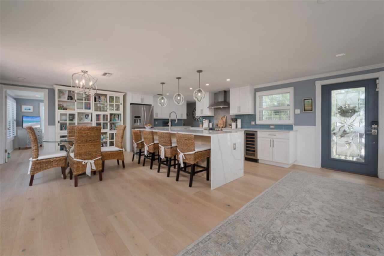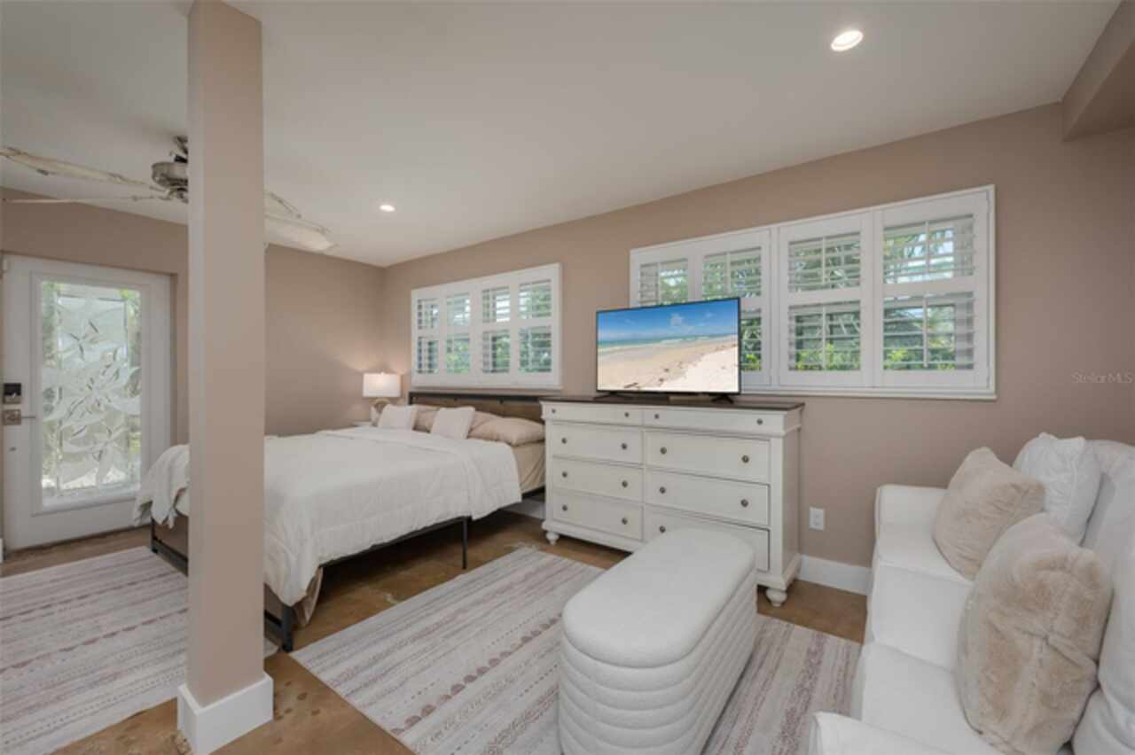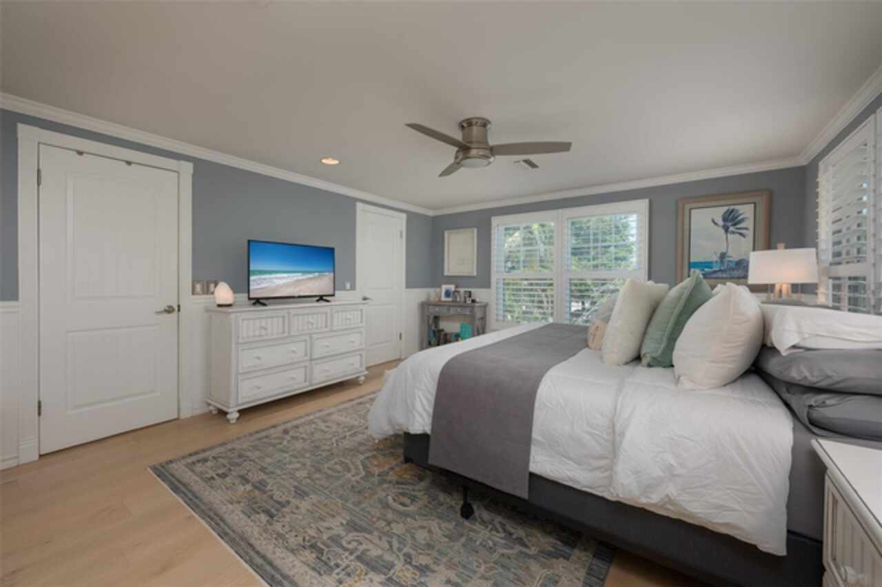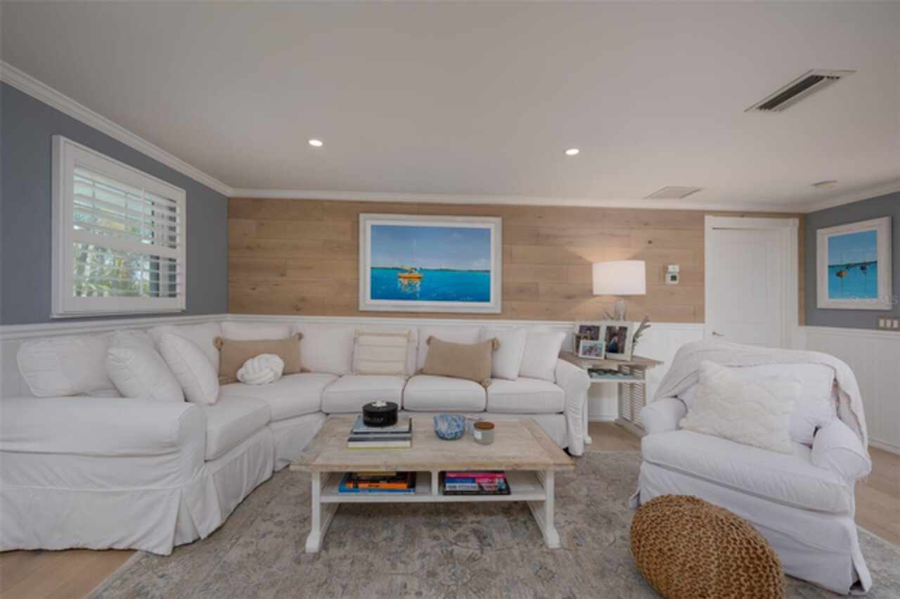 Discover your own tropical paradise on the serene North end of Longboat Key and has deeded beach access, a rare gem that blends privacy, luxury, and coastal charm. This stunning, fully renovated home boasts a thoughtfully designed open split-floor plan, perfect for relaxed living and entertaining. The custom-designed kitchen is a chef's dream, featuring sleek solid countertops, custom cabinetry, and premium stainless-steel appliances. An expansive island bar creates an inviting space for casual dining and social gatherings. Gorgeous, engineered wood floors flow throughout the main living areas, adding warmth and elegance. The spacious master suite offers a tranquil retreat, complete with a newly remodeled spa-like master bath ideal for unwinding after a day spent on the water. A well-appointed guest bedroom with its own private bath ensures comfort and privacy for visitors. Step outside to your private oasis, where a sprawling rear balcony overlooks serene canal views and the heated pool. The expansive paver deck offers ample space for lounging, dining, and soaking up the Florida sun. Boating enthusiasts will be delighted by the 120-foot seawall, 7, 000 lb. boat lift, and convenient docking and mooring features providing effortless access to the open water. This property is designed with both style and security in mind. The durable standing seam metal roof and hurricane-resistant impact glass windows and doors provide peace of mind during storm season. The lower level features a versatile guest or in-law suite complete with an upgraded bathroom and kitchenette, ideal for hosting family or accommodating extended stays. Lush, meticulously maintained landscaping showcases a variety of palm trees and fruit trees, creating a true tropical escape. The two-car garage, finished with a sleek and durable epoxy coating, combines style with functionality.