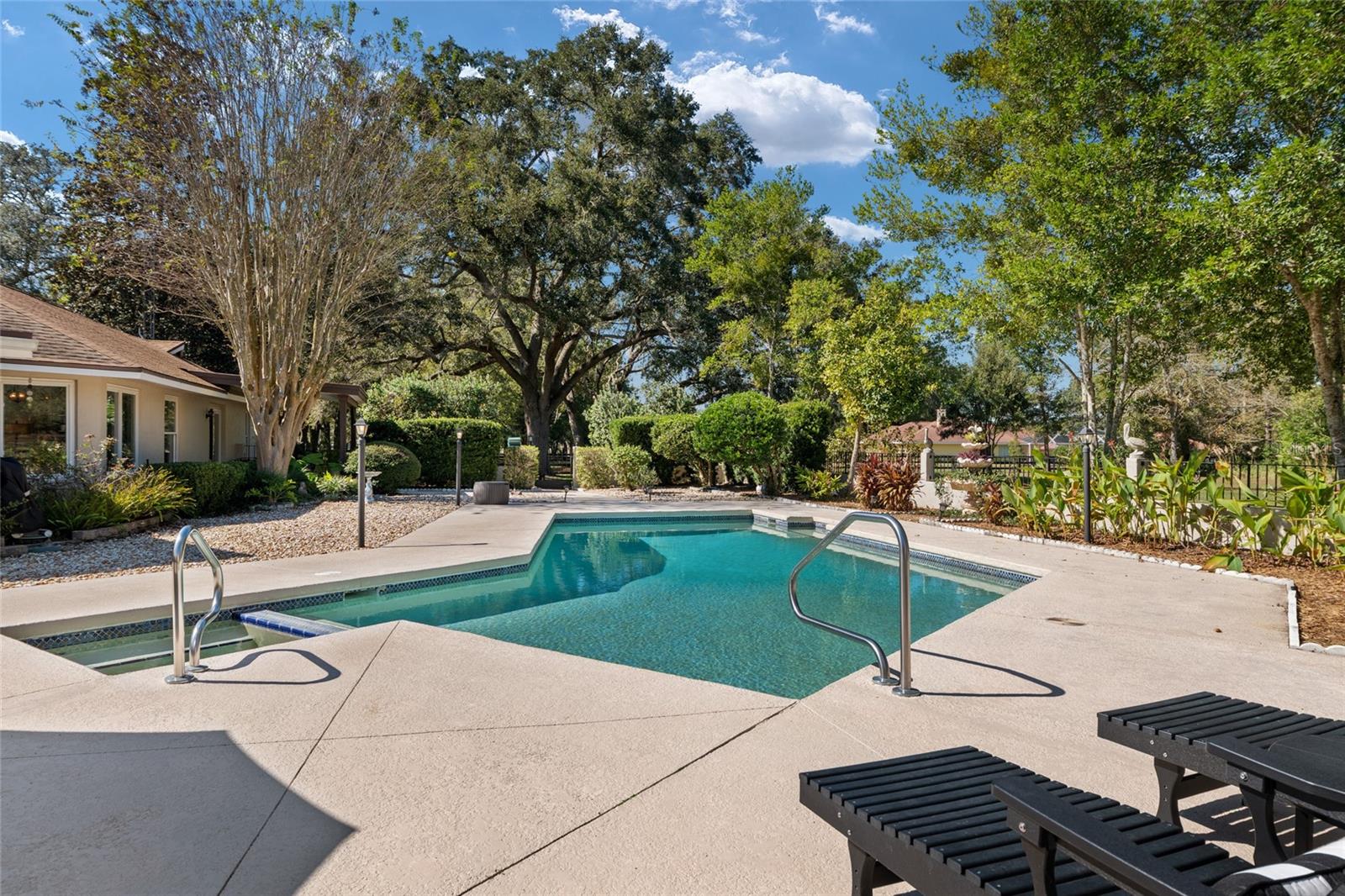Embrace the elegance of equestrian living on this exceptional 5-acre estate in peaceful Countryside Farms, where a beautifully updated main residence, private guest house, and a resort-inspired pool area await. This gated property within a gated community offers a tranquil, park-like setting with a natural buffer along the back side of the community, creating the ultimate sanctuary in the city. Conveniently located just 15 minutes from Ocala’s renowned World Equestrian Center and 20 minutes from Florida Horse Park and the trails of the Florida Greenway, while close to doctors, hospitals, restaurants, and shopping. The 3BR/2.5BA main residence blends timeless architecture with modern sophistication, anchored by a stunning chef’s kitchen remodeled in 2020. Quartz countertops, a sleek tile backsplash, stainless steel appliances including a Bosch dishwasher and wall oven with convection microwave, and an expansive walk-in pantry make this space both efficient and refined. The split-bedroom layout offers privacy and flow, while the all-season sunroom invites relaxation with serene resort-like pool views. A wood-burning fireplace adds warmth and charm to the living area, while the sturdy built-in shelving in every closet provides smart, organized storage. The spacious owner’s suite is a true retreat, featuring a walk-in closet and spa-inspired ensuite with a deep jetted tub, walk-in shower, and double-sink vanity. Remodeled guest and half bath showcase quartz surfaces and lighted mirrors for a touch of luxury. Dual HVAC systems, a whole-house vacuum, and a large laundry room with abundant storage add comfort and convenience throughout. The furnished 1BR/1BA guest house offers a private haven for visitors or the perfect quarters for your equestrian trainer or tenant, complete with a walk-in closet, full kitchen, new roof (2025), HVAC (2024), and an oversized equipment garage with laundry area. Outdoors, your private oasis awaits with a sparkling propane-heated resort-style pool and spa with a cabana bath, surrounded by lush, irrigated landscaping. Additional highlights include a decorative gate, RV hookup, a large shady dog yard, new roofs on the sunroom and pool cabana, and a new pool pump for peace of mind. For the equestrian enthusiast, the property features a concrete 4-stall center-aisle barn with two in-and-out stalls with dry paddocks, rubber-matted floors, fans, automatic waterers, a tack and feed room, and an outdoor wash rack. The cross-fenced grounds also include two large pastures with automatic waterers and a professionally installed 200’ x 80’ sand and fiber arena completed in 2020 and equipped with irrigation. This rare offering combines luxury, privacy, and equestrian excellence, creating a tranquil retreat in a desirable location that is close to everything you need.