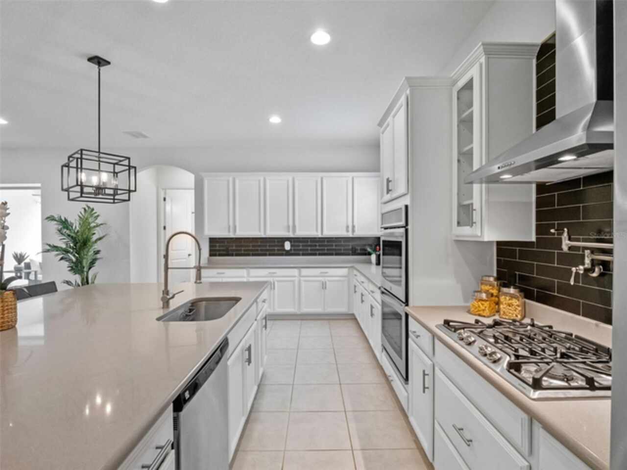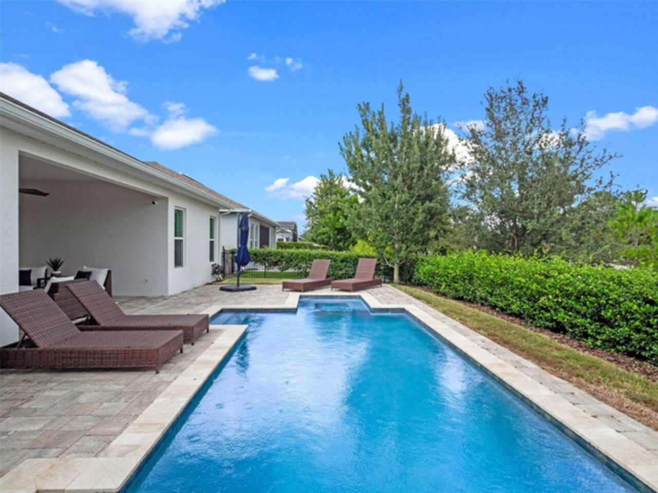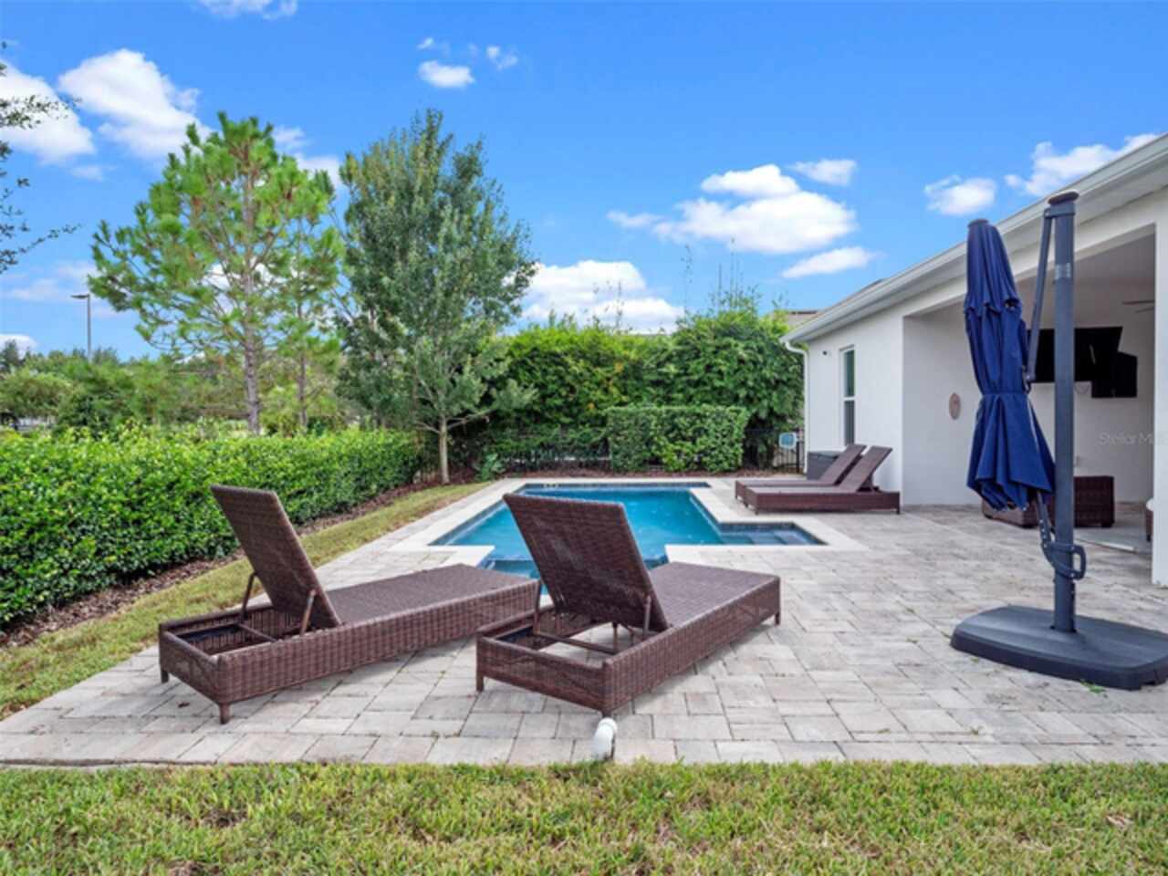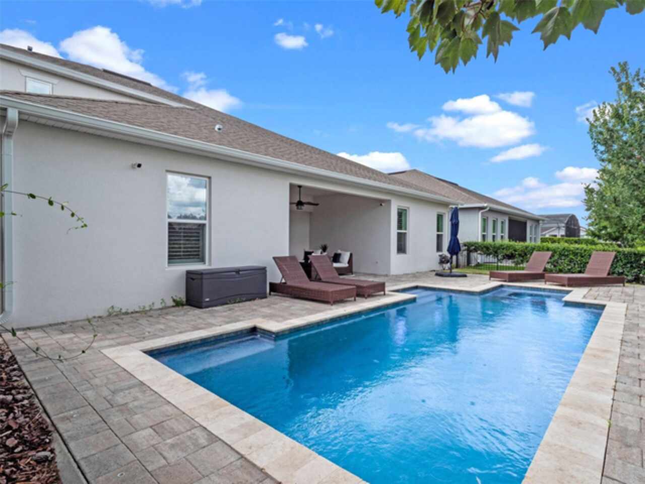 Under contract-accepting backup offers. Welcome to this 3, 097 square foot pool home in Sanctuary at Hamlin, located in the heart of Horizon West and just minutes from Hamlin Town Center. As you enter, two bedrooms share a full bathroom off the foyer, both featuring premium carpet and custom closets. The home then opens into a spacious dining and family room combination with 10-foot ceilings, wood-look tile flooring, and an accent wall. The gourmet kitchen overlooks the main living area and includes Kenmore stainless steel appliances, with double ovens, refrigerator, and natural gas cooktop with hood and pot filler. The kitchen also offers extensive 42-inch cabinetry, a stylish backsplash, ample counter space, a large walk-in pantry, and an oversized quartz island with seating and pendant lighting. The primary suite, accessed through double doors, is generously sized with views of the backyard. A custom barn door leads to the en suite bath, which includes dual vanities with a central makeup station, garden tub, walk-in shower, and two closets. The primary suite features custom closets as well. The first floor includes a third bedroom with pool views and a nearby full bath. Upstairs, you’ll find a private bedroom with en suite bath and a walk-in closet. Step outside through the sliding door to an open-air patio overlooking the saltwater pool and spa, surrounded by paver decking. The open design offers a clean, unobstructed view of the Florida sky, with no rear neighbors for added privacy. A gas hookup is in place for a future summer kitchen. Additional features include plantation shutters throughout, a downstairs laundry room, and a 3-car garage pre-wired for an electric vehicle charger. This home is conveniently close to Cinepolis, PopStroke, Orange County National Golf Center, restaurants, grocery stores, Orlando Health Horizon West Hospital, and Disney World, with easy access to SR-429 for commuting. Schedule your private showing today.