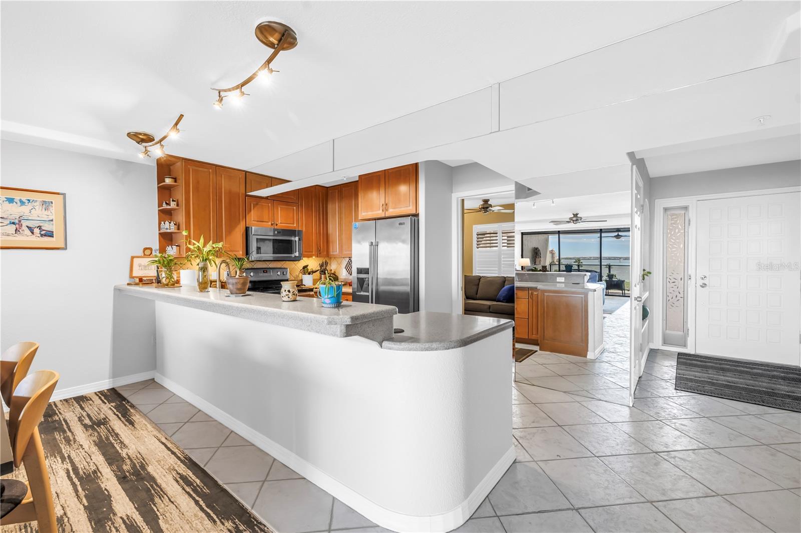 Kitchen/Family Room Combo, Open Floorplan, Solid Surface Counters, Wet Bar, Window Treatments