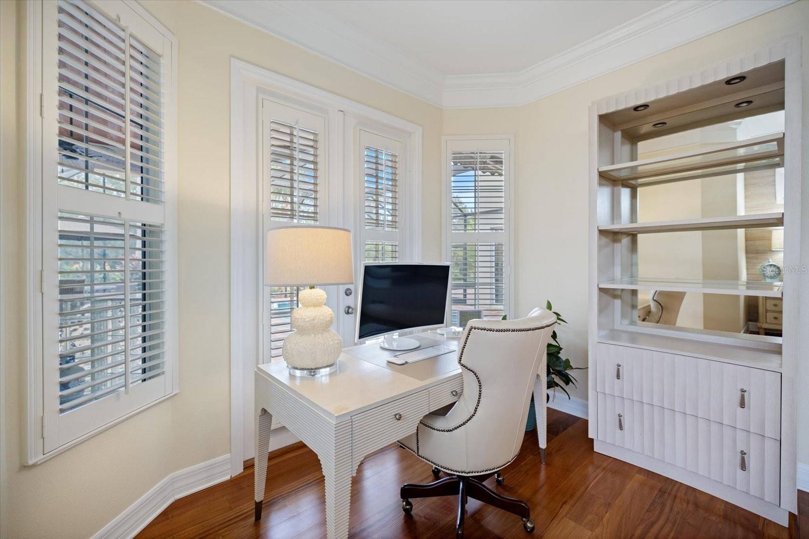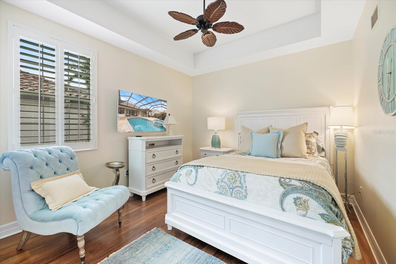 Located in River Club, this stunning property offers not just a place to live, but a luxurious lifestyle in a serene golf course community. Spanning 3, 721 square feet, this 4-bedroom, 3.5-bathroom residence is situated on a generous 14, 901 square foot lot, ensuring plenty of space for relaxation and entertainment. Step inside to a grand entryway featuring elegant columns and detailed tile flooring, leading to formal living and dining areas. The living room boasts a cozy fireplace with custom shelving beneath a beautifully coffered ceiling. Enjoy meals in the dining room, enhanced by a chandelier and plantation shutters, or take breakfast in the kitchen's sunny nook. The kitchen itself is a culinary paradise, featuring granite countertops, wood cabinets, a marble backsplash, cooktop, beverage fridge, and a spacious walk-in pantry. Experience seamless indoor-outdoor living with sliding glass doors in the family room opening to a breathtaking outdoor oasis. The outdoor living area includes a pool, spa, wood ceilings, and an outdoor kitchen with a bar, perfect for entertaining. Enjoy the convenience of a pool bath and a large brick patio ideal for gatherings around a fire pit. Retreat to the primary suite with a vestibule entry, luxurious tub, walk-in showers, split vanities, oversized walk-in closet with custom shelving, and French doors opening to your private bay sitting area. Wood flooring and shutters add a touch of sophistication. The tile roof newly replaced in 2023, adds peace of mind. Additional features include a spacious office and guest bedroom on the main floor, an upstairs bonus room with built-in desk and shelving, crown molding, pest tubes, central vacuum, and a newly replaced air conditioner in 2024. The attached garage is designed for more than just vehicles—it features epoxy speckled floors, custom cabinetry, mini-split air conditioning, and ample storage. A well-appointed laundry room includes a front-loading washer and dryer with pedestals, sink, and cabinets. With LOW HOA FEES AND NO CDD FEES, this exceptional home is set within the established community of River Club, offering easy access to the world-renowned Gulf Coast beaches, the shopping, dining, and entertainment venues of Lakewood Ranch and Sarasota, top-tier medical facilities, and excellent schools.
