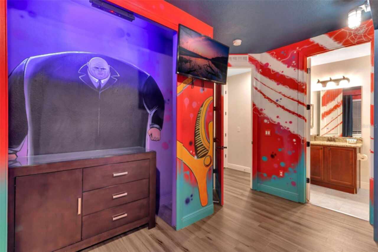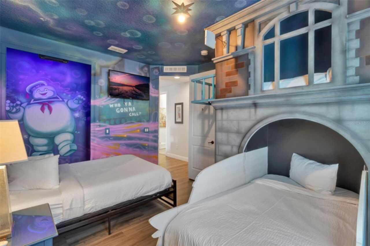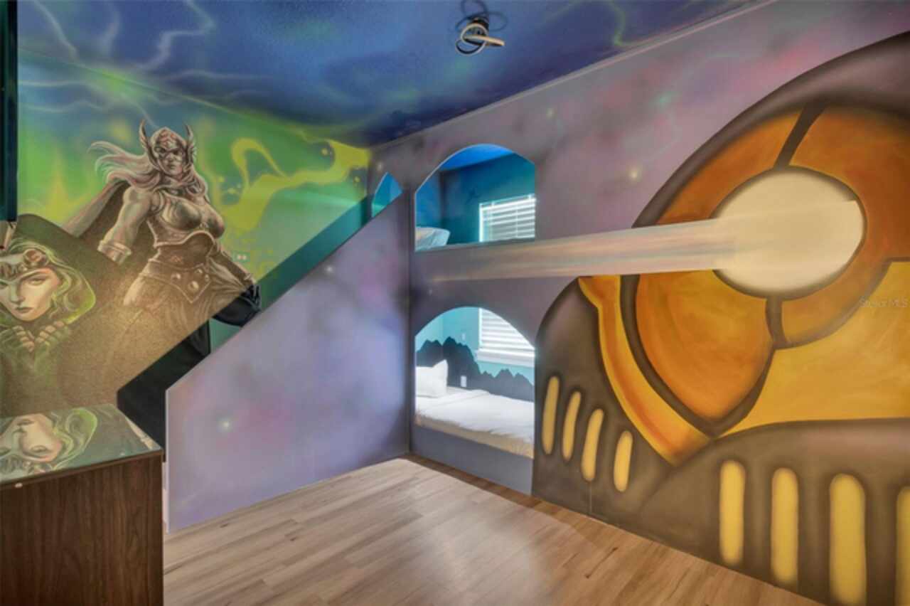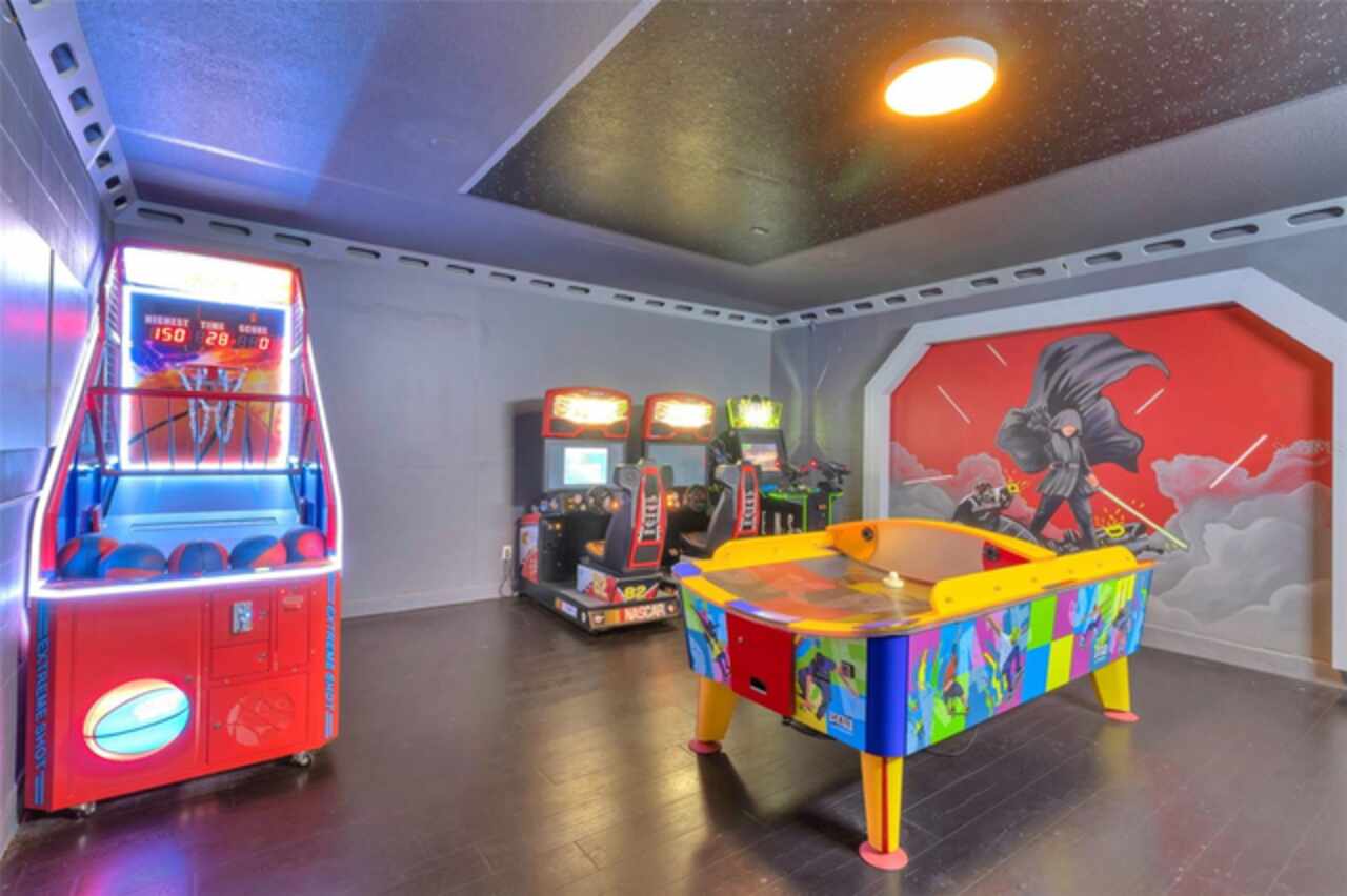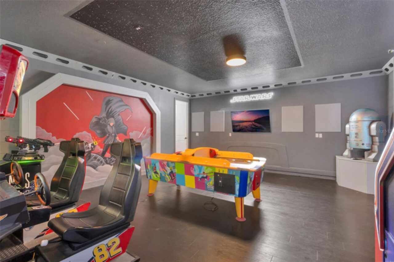 Welcome to this stunning TURNKEY, fully furnished 11-bedroom, 10-bathroom home located in the highly sought-after Encore Resort, just minutes from world-class theme parks! Perfectly designed for large groups and short-term rentals, this property comfortably SLEEPS 20–24 guests and offers the ultimate vacation experience with 9 ensuite bedrooms for maximum comfort and privacy. Gross RENTAL PROJECTIONS are $128, 373, with a 48% OCCUPANCY RATE and an AVERAGE NIGHTLY RATE of $727. Step inside to a spacious open-concept floor plan featuring a gourmet kitchen equipped with 2 refrigerators, 2 dishwashers, and generous dining and living areas—ideal for entertaining. Three bedrooms are conveniently located downstairs, including one with an accessible ensuite bathroom. Upstairs, you’ll find 8 additional bedrooms, including 4 custom-themed bunk rooms your guests will love: Marvel, Ghostbusters, Spiderman, and Pirates of the Caribbean. The living room’s sliding glass doors open to a covered patio, private heated pool and spa, and lush mature landscaping for added privacy—the perfect spot to unwind after a day at the parks. For endless indoor fun, the converted Star Wars-themed game room is a showstopper, featuring a life-size R2-D2, air hockey, Aliens Extermination, Expert Shot Basketball, and two Nascar Virtual Racing arcade games. Additional features include laundry rooms on both levels, ensuring convenience for large groups. Whether you're looking for a high-performing investment or a vacation home for making memories, this property delivers it all. The Encore at Reunion Resort includes a spectacular clubhouse, award-winning restaurant, a Water Park, full-service spa, two playgrounds, state-of-the-art gym, basketball, volleyball & tennis courts. The HOA fee covers 24-hour gated entrances & roaming security, trash pickup, & an annual exterior house cleaning. A concierge desk is available at the clubhouse to assist with booking tickets, meals, airline check ins, resort provided shuttles to parks, & more. Enjoy being minutes away from three golf courses and in the heart of attractions, shopping, dining and more. Call us today to schedule your private tour!