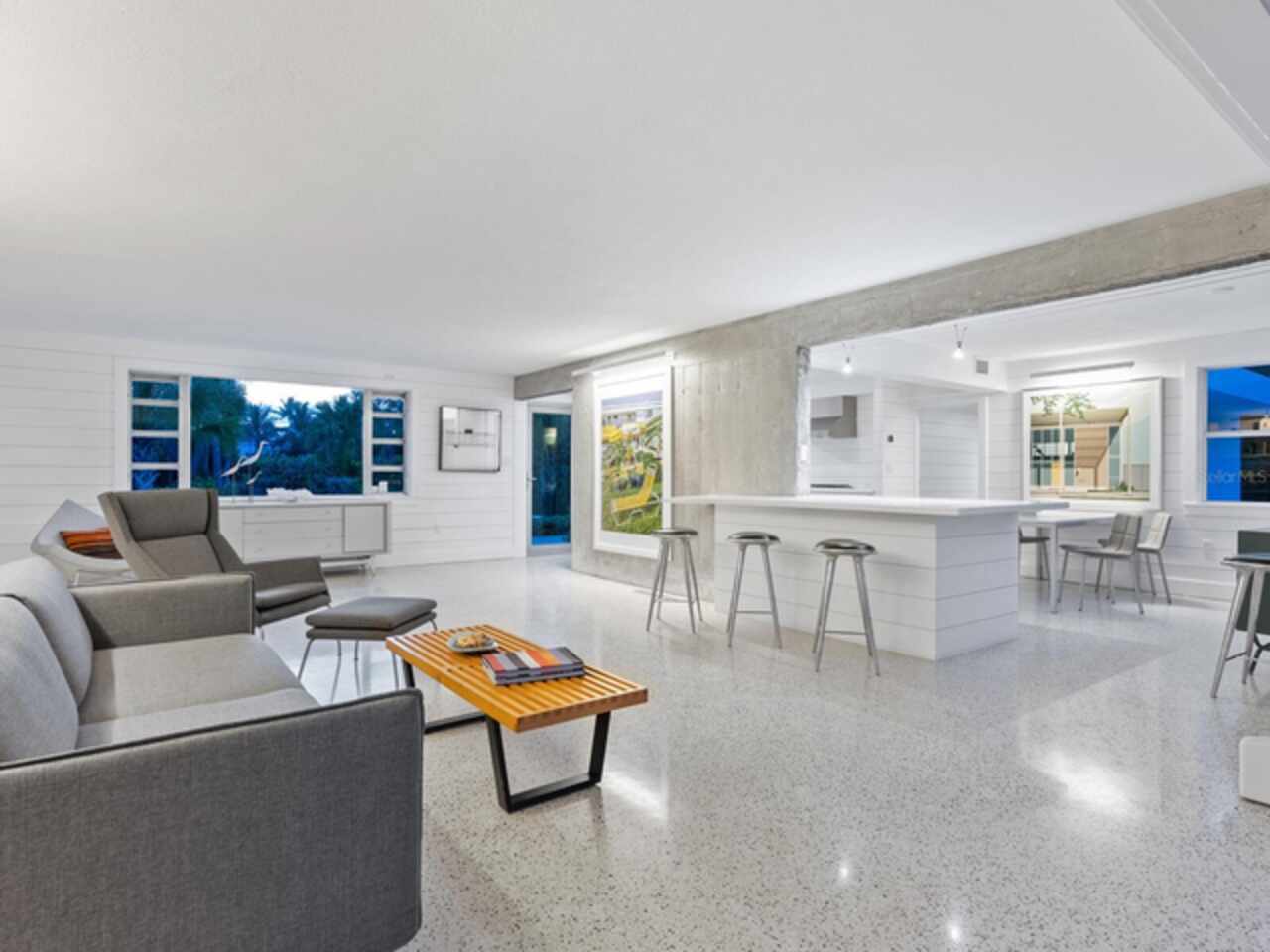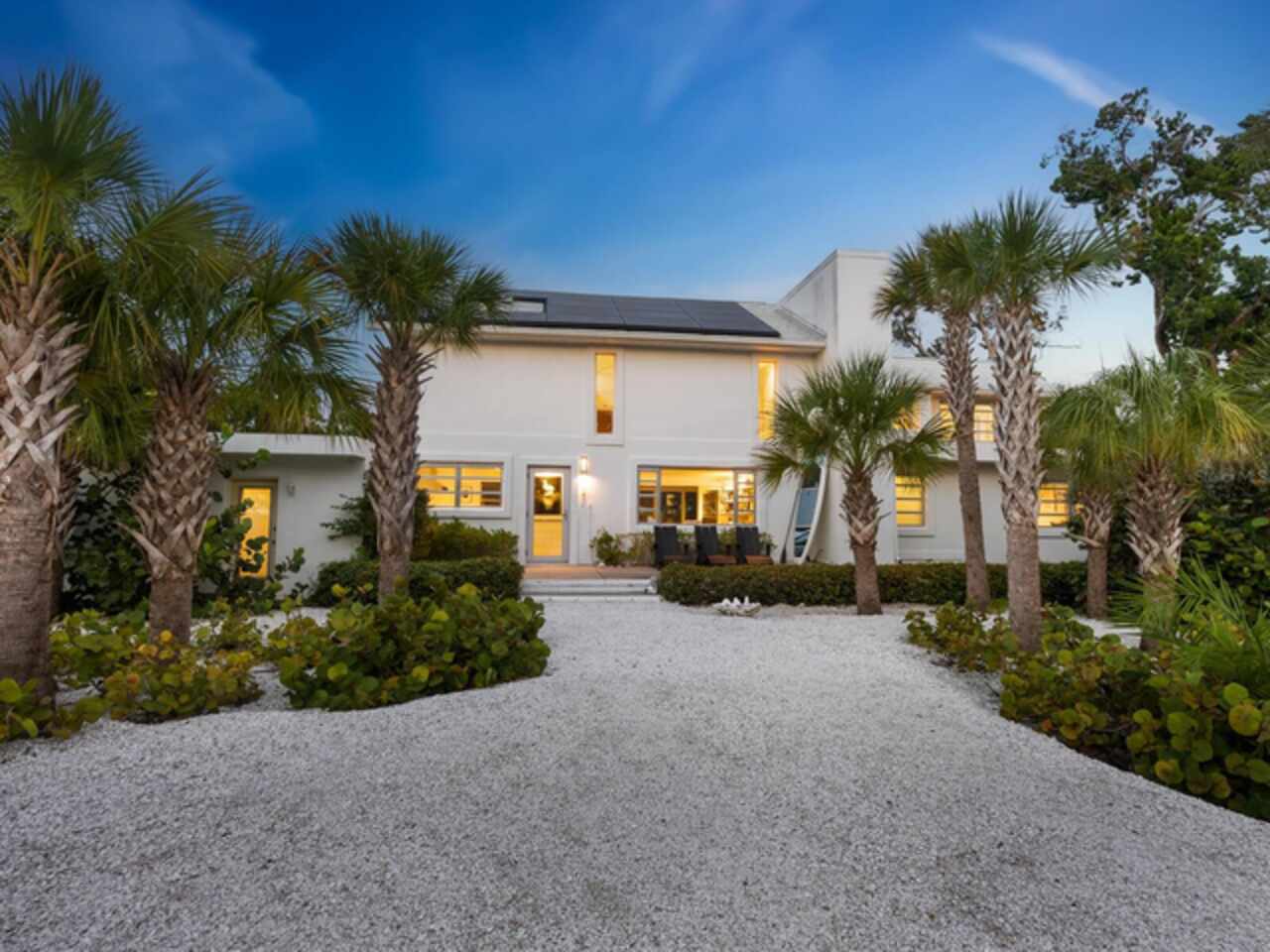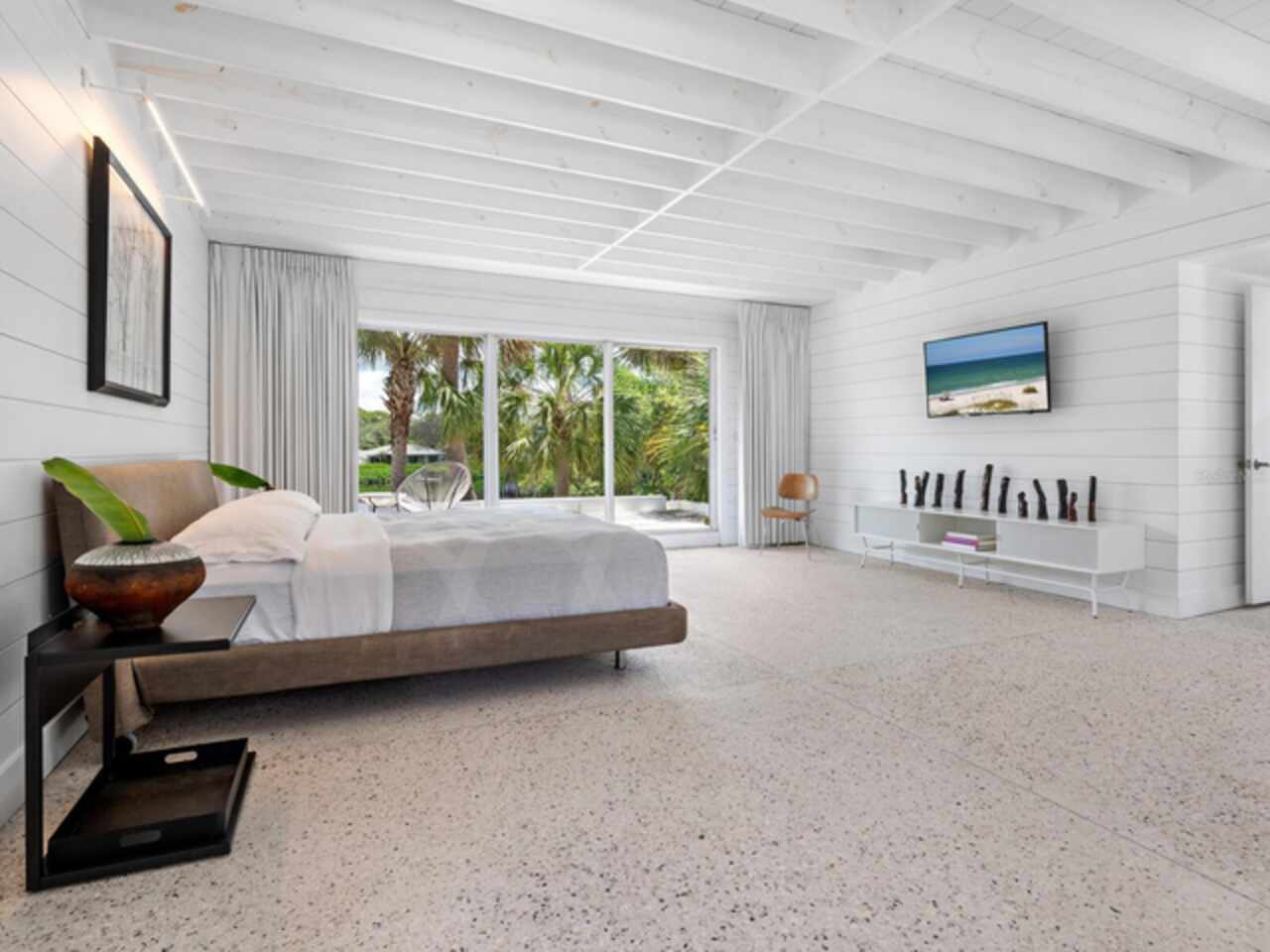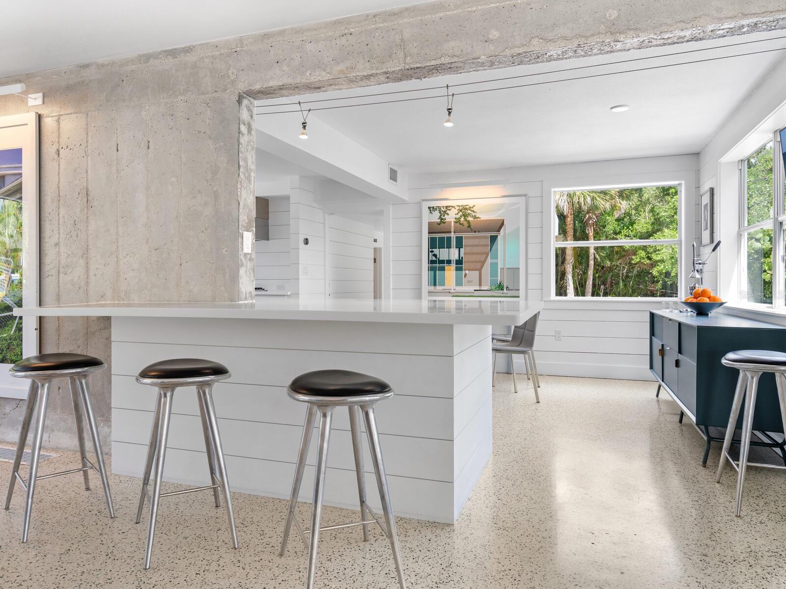 Photos 1–3 showcase preliminary renderings of a proposed architectural concept for this exceptional property. Envisioned as a modern coastal retreat, the design celebrates the relaxed luxury of mid-century architecture while maximizing the natural beauty of its surroundings. This residence is a modern coastal retreat set on over an acre and blends luxury with the charm of mid-century design. Enjoy the property just as it is or explore the endless possibilities for building your dream home or compound to take advantage of endless water and sunsets views. This residence greets you with an expansive circular shell stone driveway, offering a grand approach to the home. Upon arrival, you’re welcomed into an open entryway that flows into the main living areas. The living room offers a relaxed setting with terrazzo floors, built-in shelving, a large picture window, and a cozy fireplace framed by shiplap accent walls. Tri-fold glass doors open to a bright Florida room, also with terrazzo floors, creating seamless indoor-outdoor living. A distinctive concrete wall separates the space from the dining area with built-in bar seating. The kitchen features custom soft-close cabinetry, quartzite countertops, and Bosch appliances—including a gas cooktop, oven, refrigerator, and dishwasher—framed by large windows with peaceful lagoon views. Outside, enjoy a shell-crete pool deck with ample room for lounging and dining. A heated pool, shuffleboard court, and firepit seating area complete the inviting outdoor space. Upstairs, a flexible bonus room includes built-in closets, water-view windows, and a full bath with a tub/shower, vanity, and stylish tile. Step out to the rooftop deck with panoramic views of the pool, grounds, and Heron Lagoon. The primary suite offers high beamed ceilings, shell-crete floors, sliding glass doors to a private lagoon-view deck, and an en-suite bath with a floating dual-sink vanity, glass walk-in shower, private water closet, and linen closet. A custom walk-in closet with built-ins and soft-close drawers completes the suite. Two guest bedrooms, a full guest bath, a butler’s pantry, spacious laundry room, and half bath round out the main level. Despite being impacted by the 2024 hurricanes, the house and property have recovered quickly. The Sanderling Club has released renderings that envision a new era for its historic clubhouse and private waterfront setting. The Miami-based architectural firm STRANG has designed a new residence for the expansive site. The elevated design highlights the opportunity for tremendous Gulf views. The property’s unique setting amidst Heron Lagoon and the Gulf of Mexico allows for stunning vistas of sunrises and sunsets. This property is one of the largest lots on Heron Lagoon in Sanderling – prime for redevelopment as it would offer amazing views and is large enough to accommodate a significant home/compound. The property is located minutes from Siesta Key’s crystal quartz sand beaches and Siesta Village for shopping and restaurants. Culturally rich downtown Sarasota restaurants, theater, ballet, opera, museums, galleries, and shopping are a short drive away.