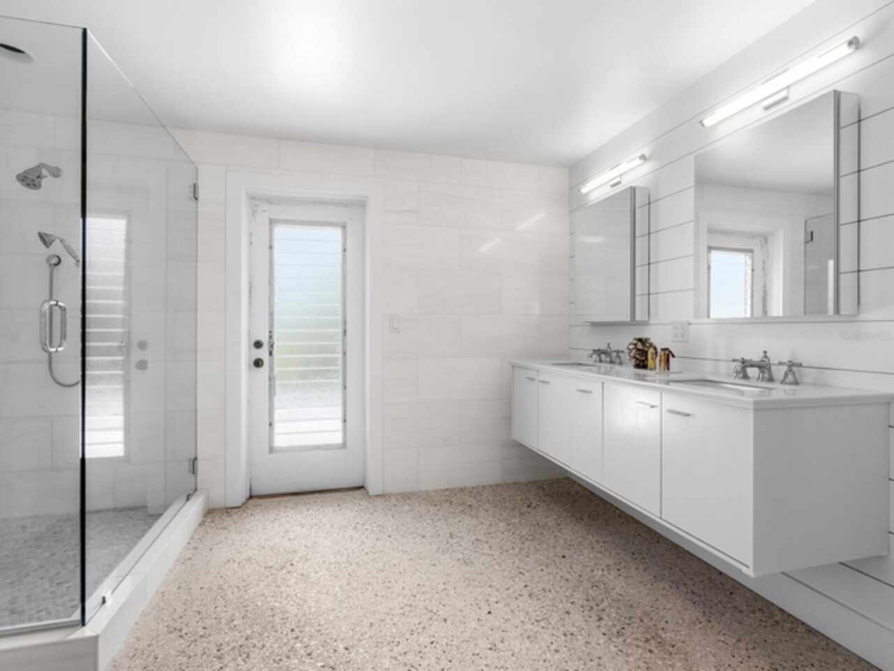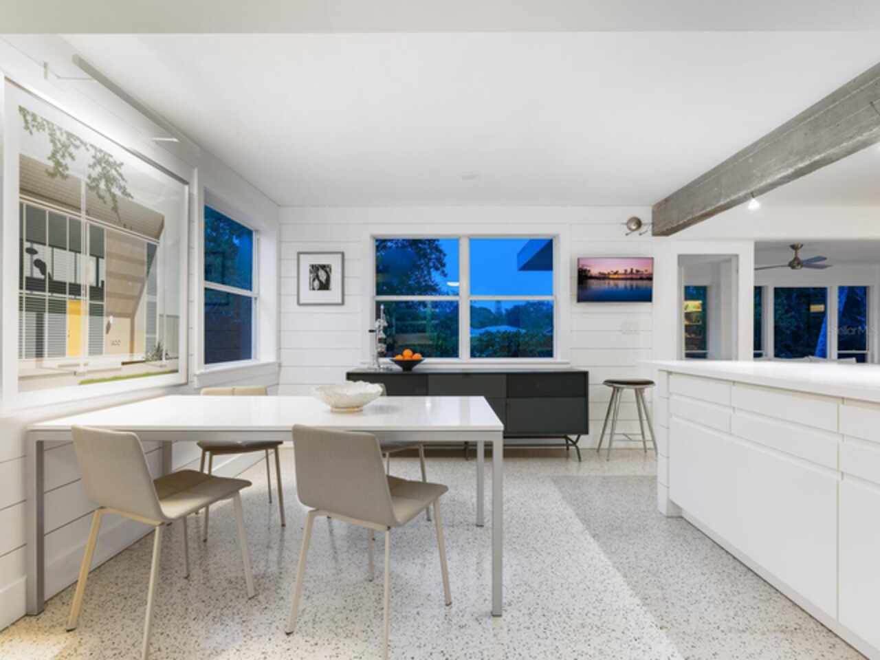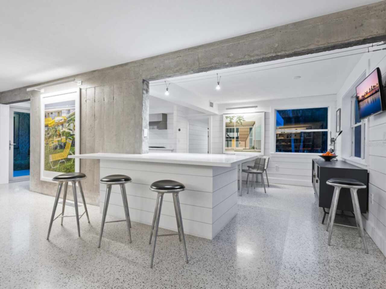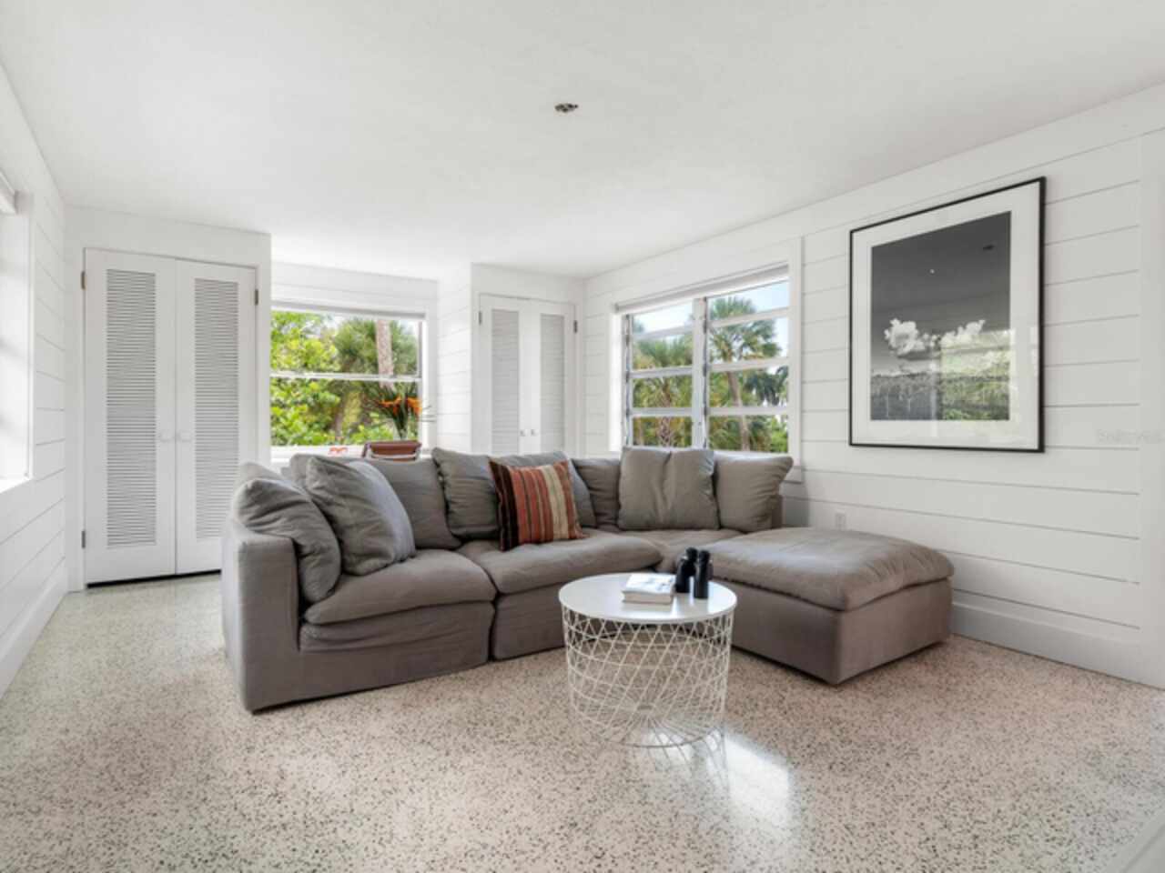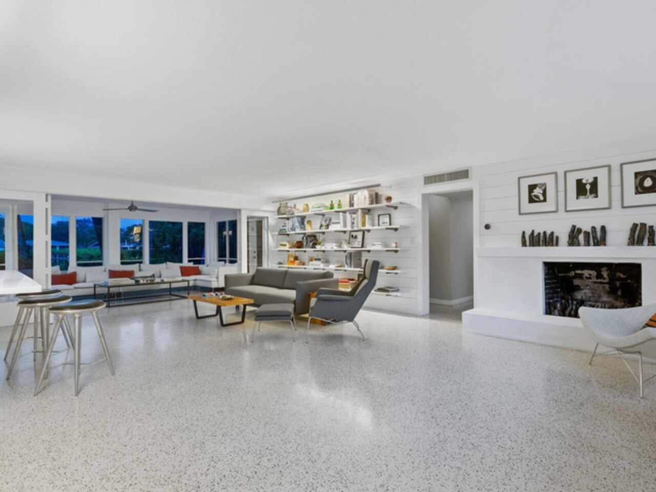 Photos 1–3 showcase preliminary renderings of a proposed architectural concept for this exceptional property. Envisioned as a modern coastal retreat, the design celebrates the relaxed luxury of mid-century architecture while maximizing the natural beauty of its surroundings. This residence is a modern coastal retreat set on over an acre and blends luxury with the charm of mid-century design. Enjoy the property just as it is or explore the endless possibilities for building your dream home or compound to take advantage of endless water and sunsets views. This residence greets you with an expansive circular shell stone driveway, offering a grand approach to the home. Upon arrival, you’re welcomed into an open entryway that flows into the main living areas. The living room offers a relaxed setting with terrazzo floors, built-in shelving, a large picture window, and a cozy fireplace framed by shiplap accent walls. Tri-fold glass doors open to a bright Florida room, also with terrazzo floors, creating seamless indoor-outdoor living. A distinctive concrete wall separates the space from the dining area with built-in bar seating. The kitchen features custom soft-close cabinetry, quartzite countertops, and Bosch appliances—including a gas cooktop, oven, refrigerator, and dishwasher—framed by large windows with peaceful lagoon views. Outside, enjoy a shell-crete pool deck with ample room for lounging and dining. A heated pool, shuffleboard court, and firepit seating area complete the inviting outdoor space. Upstairs, a flexible bonus room includes built-in closets, water-view windows, and a full bath with a tub/shower, vanity, and stylish tile. Step out to the rooftop deck with panoramic views of the pool, grounds, and Heron Lagoon. The primary suite offers high beamed ceilings, shell-crete floors, sliding glass doors to a private lagoon-view deck, and an en-suite bath with a floating dual-sink vanity, glass walk-in shower, private water closet, and linen closet. A custom walk-in closet with built-ins and soft-close drawers completes the suite. Two guest bedrooms, a full guest bath, a butler’s pantry, spacious laundry room, and half bath round out the main level. Despite being impacted by the 2024 hurricanes, the house and property have recovered quickly. The Sanderling Club has released renderings that envision a new era for its historic clubhouse and private waterfront setting. The Miami-based architectural firm STRANG has designed a new residence for the expansive site. The elevated design highlights the opportunity for tremendous Gulf views. The property’s unique setting amidst Heron Lagoon and the Gulf of Mexico allows for stunning vistas of sunrises and sunsets. This property is one of the largest lots on Heron Lagoon in Sanderling – prime for redevelopment as it would offer amazing views and is large enough to accommodate a significant home/compound. The property is located minutes from Siesta Key’s crystal quartz sand beaches and Siesta Village for shopping and restaurants. Culturally rich downtown Sarasota restaurants, theater, ballet, opera, museums, galleries, and shopping are a short drive away.