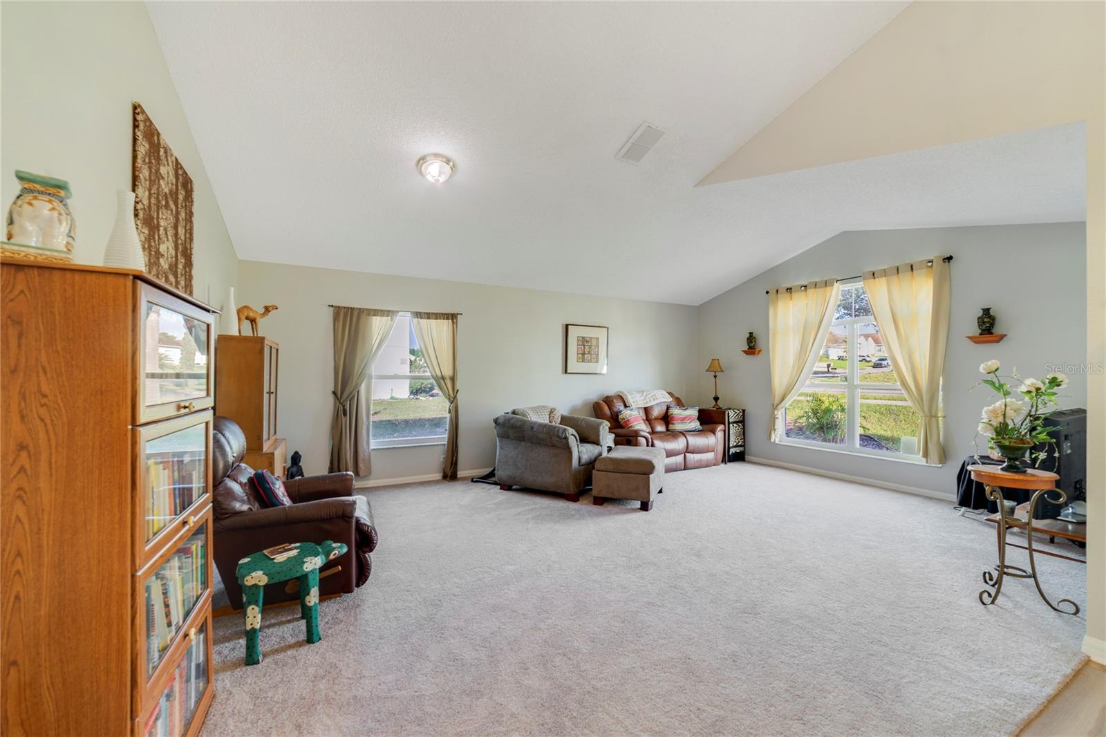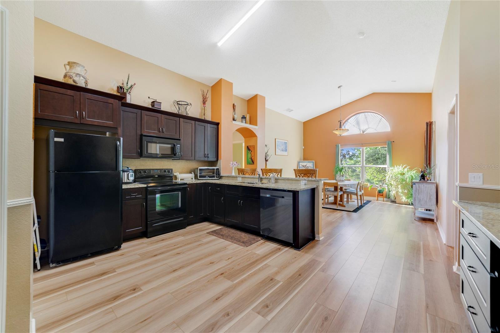 Cathedral Ceiling(s), Ceiling Fans(s), Kitchen/Family Room Combo, Open Floorplan, Primary Bedroom Main Floor, Solid Surface Counters, Solid Wood Cabinets, Stone Counters, Thermostat, Vaulted Ceiling(s), Walk-In Closet(s), Wet Bar
