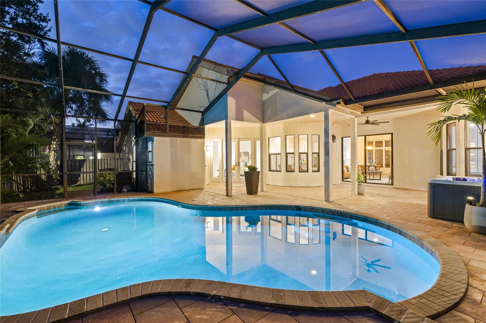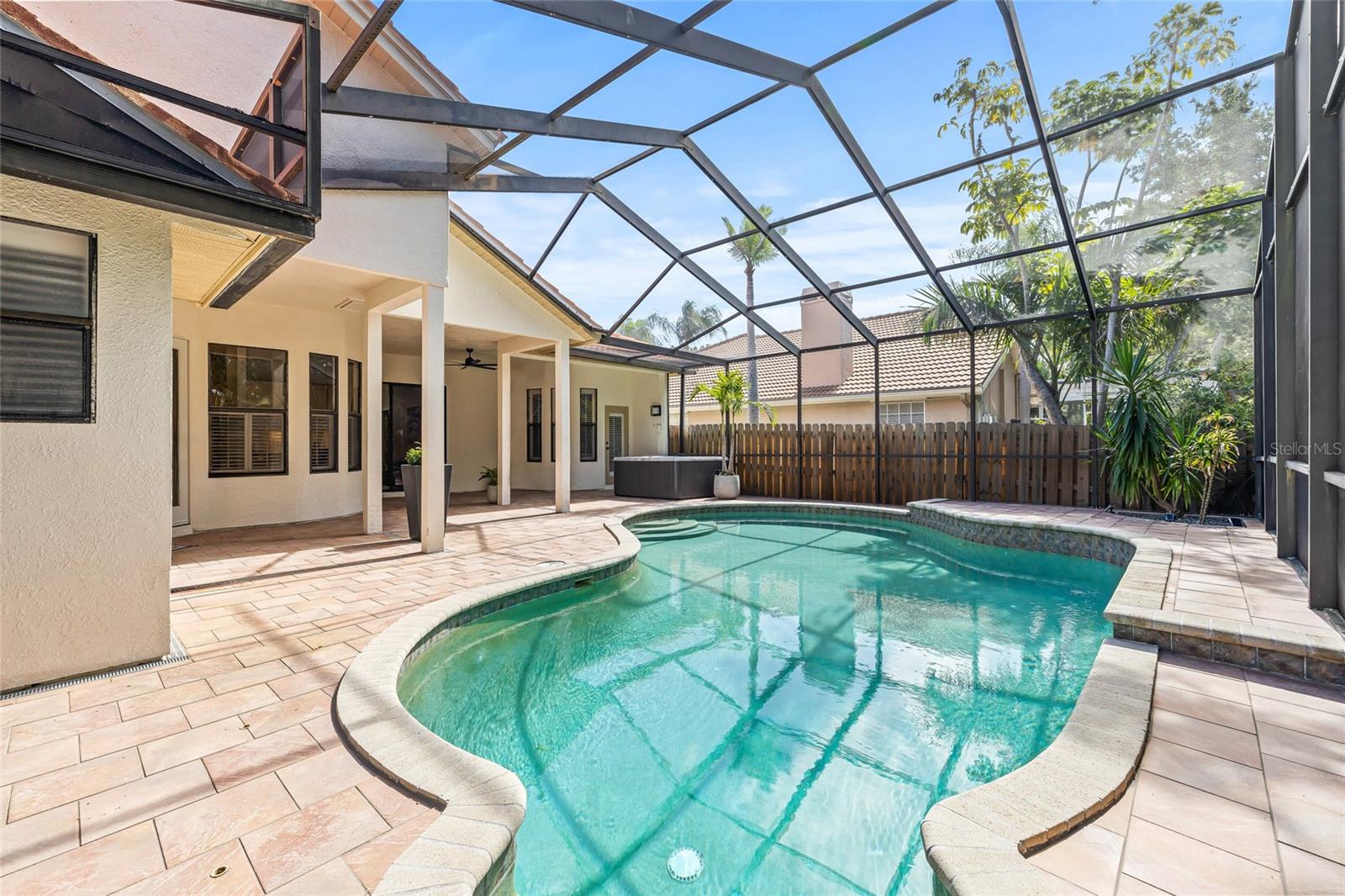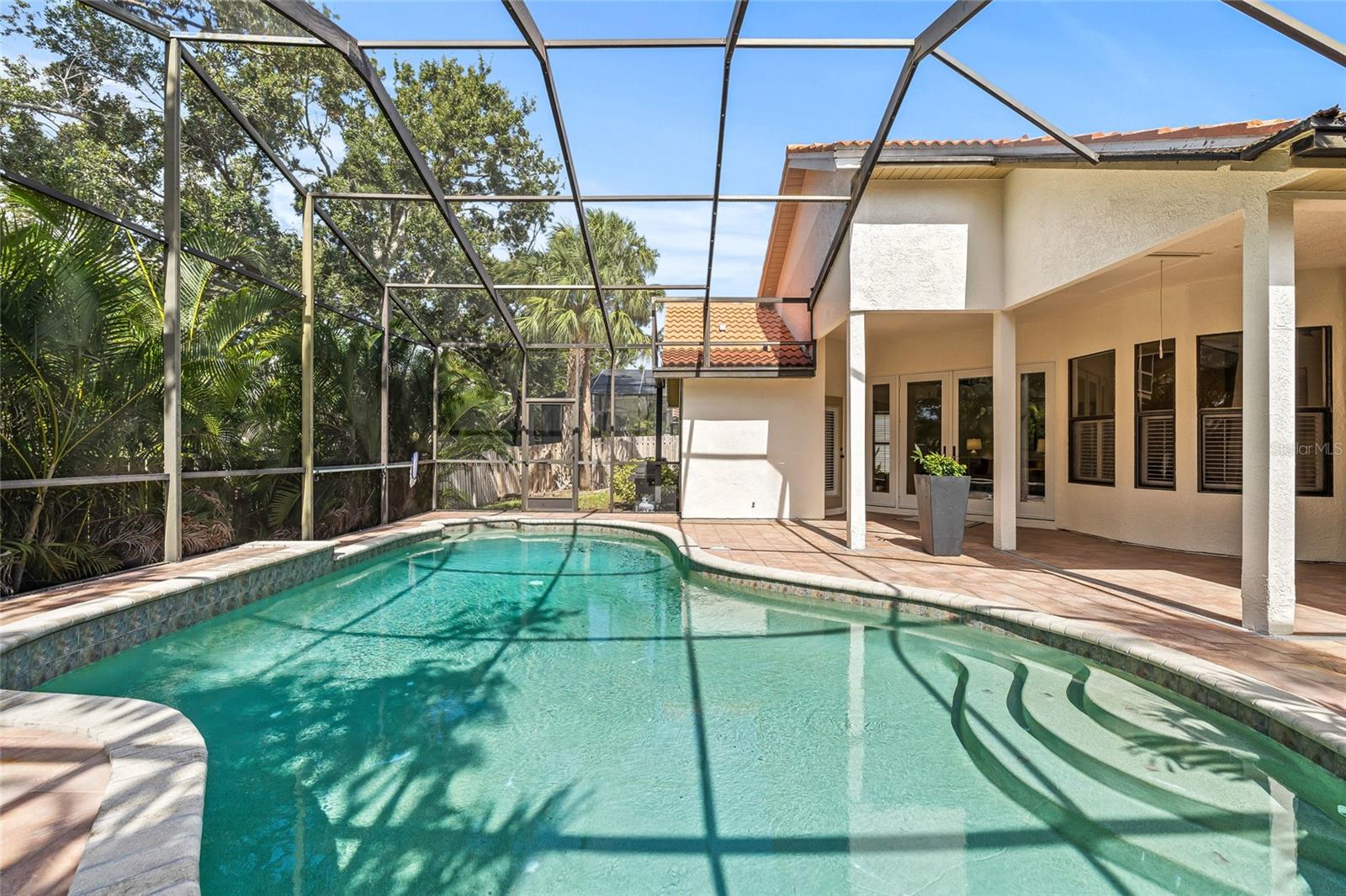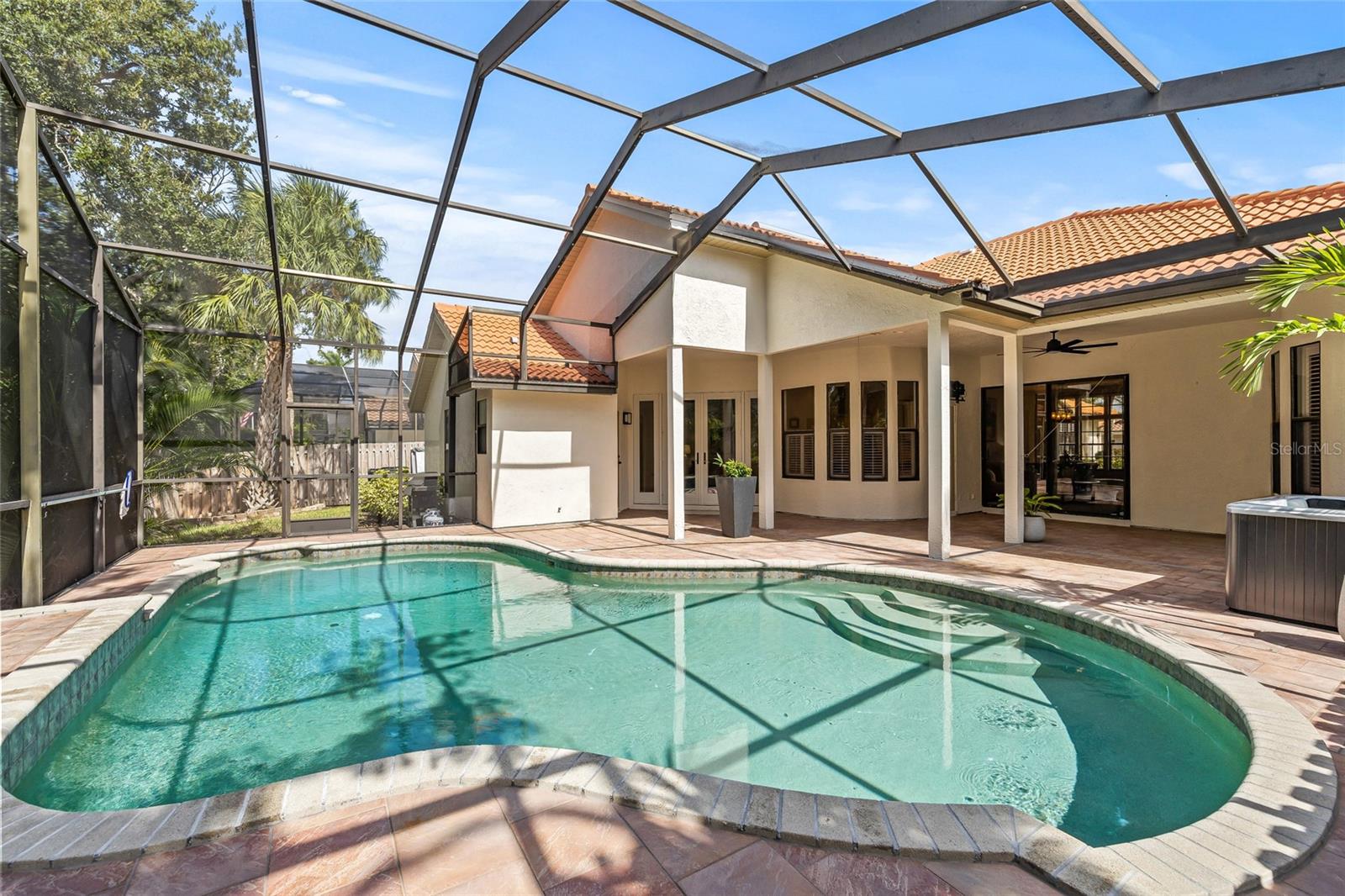 Under contract-accepting backup offers. Welcome to the beauty and ease of Florida living in this stunning single-story, 4-bedroom, 3-bath home tucked inside the guard-gated community of Placido Bayou. Surrounded by mature trees, winding streets, and natural preserves, Placido Bayou offers the rare combination of tranquility and security—just minutes from vibrant downtown St. Petersburg. Step inside to find a bright, open split floorplan designed for both comfort and connection. Every main room looks out to the sparkling, heated saltwater pool and freestanding hot tub, where custom pavers and a screened lanai create an oasis perfect for afternoons in the sun or shaded poolside lounging. At the heart of the home, the gourmet kitchen features granite countertops, stainless steel appliances, a double oven, butcher block island, large pantry and breakfast bar—opening seamlessly to the vaulted hearth room with a cozy wood-burning fireplace and French doors. The spacious primary suite offers a peaceful escape with its spa-like bathroom—complete with granite double vanity, custom cabinetry, soaking tub, walk-in shower, and oversized custom closet. Guests and extended family will appreciate the private quarters behind a pocket door with a bedroom, full bath with step in shower, and outdoor access. With two living areas, a dining room (or home office), and generous storage—including two attics, an interior laundry room, and a 2-car garage—this home is designed for both everyday living and entertaining. Placido Bayou’s walkable streets, and serene fishing lakes make it a favorite for anyone who desires privacy while still being close to all the pleasures of city living. Furthermore, enjoy low HOA fees that include lawn maintenance, painting the exterior of the home every seven years, fence installation and more—just minutes to I-275, Tampa, two international airports, and the shops, dining, and waterfront charm of downtown St. Petersburg.