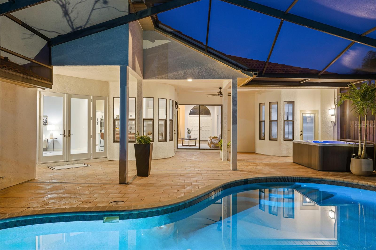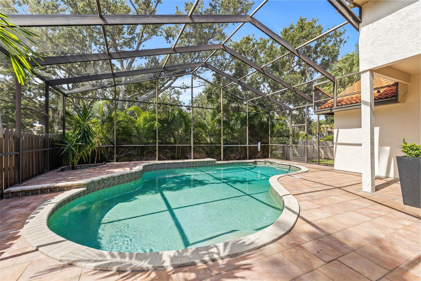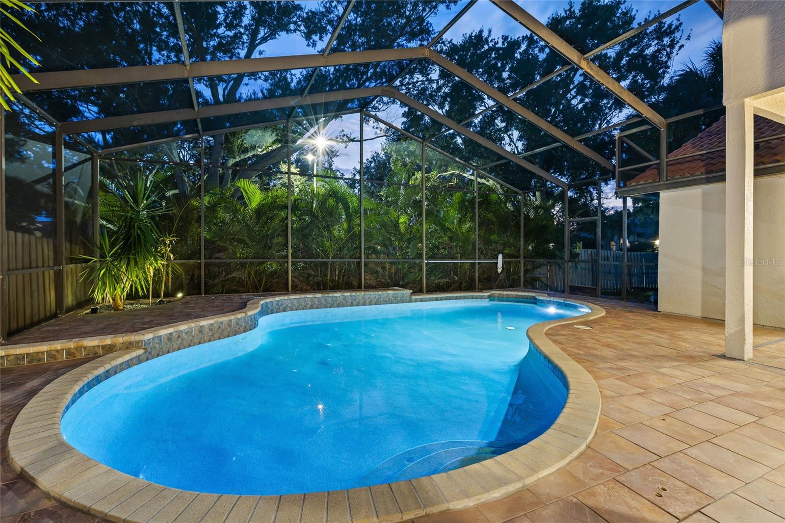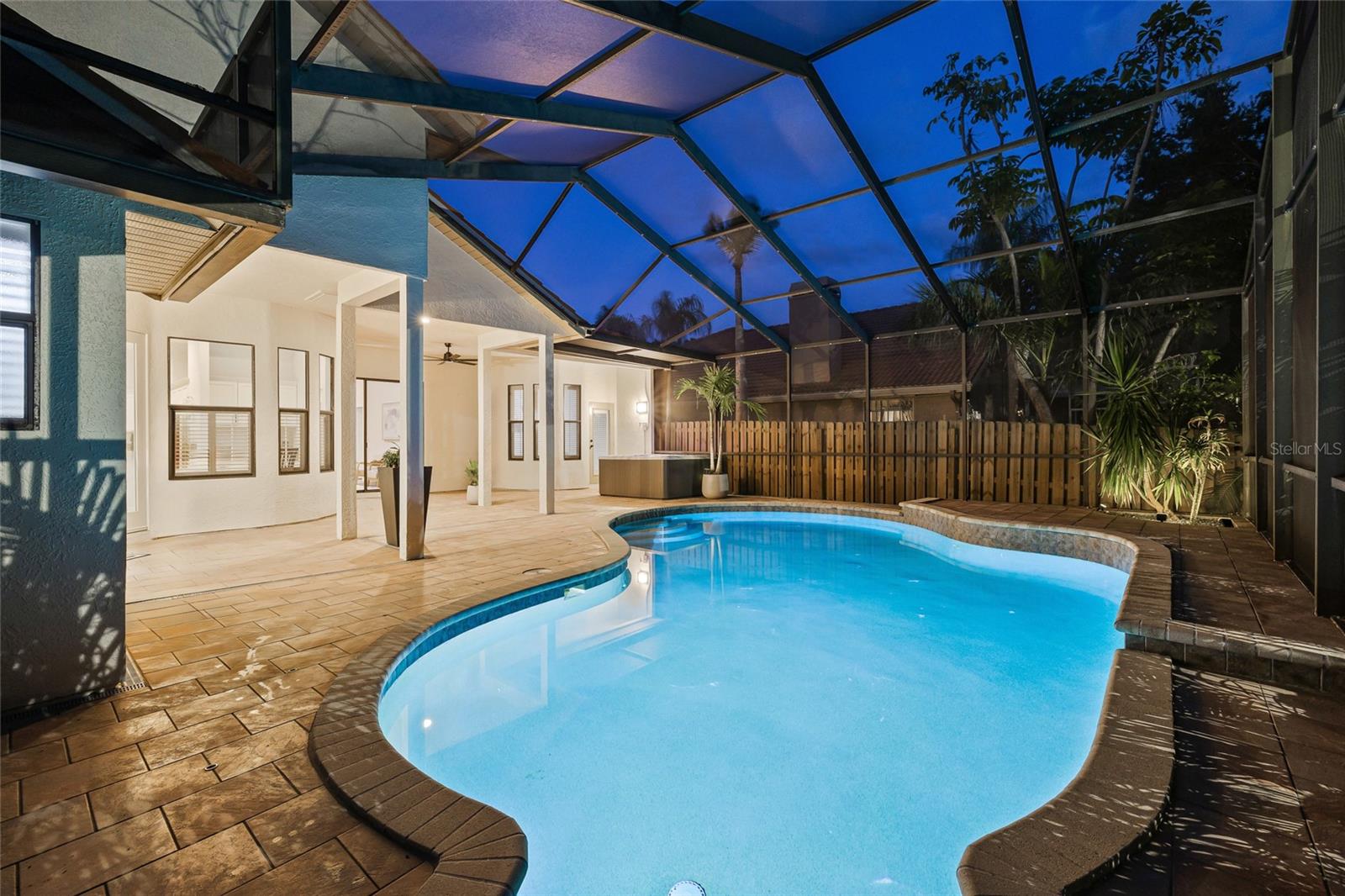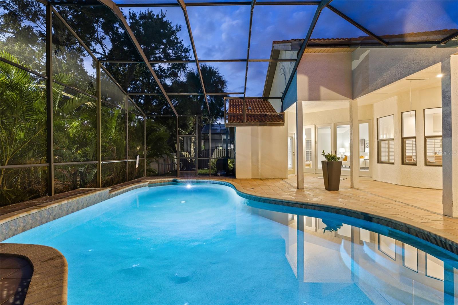 Under contract-accepting backup offers. Welcome to the beauty and ease of Florida living in this stunning single-story, 4-bedroom, 3-bath home tucked inside the guard-gated community of Placido Bayou. Surrounded by mature trees, winding streets, and natural preserves, Placido Bayou offers the rare combination of tranquility and security—just minutes from vibrant downtown St. Petersburg. Step inside to find a bright, open split floorplan designed for both comfort and connection. Every main room looks out to the sparkling, heated saltwater pool and freestanding hot tub, where custom pavers and a screened lanai create an oasis perfect for afternoons in the sun or shaded poolside lounging. At the heart of the home, the gourmet kitchen features granite countertops, stainless steel appliances, a double oven, butcher block island, large pantry and breakfast bar—opening seamlessly to the vaulted hearth room with a cozy wood-burning fireplace and French doors. The spacious primary suite offers a peaceful escape with its spa-like bathroom—complete with granite double vanity, custom cabinetry, soaking tub, walk-in shower, and oversized custom closet. Guests and extended family will appreciate the private quarters behind a pocket door with a bedroom, full bath with step in shower, and outdoor access. With two living areas, a dining room (or home office), and generous storage—including two attics, an interior laundry room, and a 2-car garage—this home is designed for both everyday living and entertaining. Placido Bayou’s walkable streets, and serene fishing lakes make it a favorite for anyone who desires privacy while still being close to all the pleasures of city living. Furthermore, enjoy low HOA fees that include lawn maintenance, painting the exterior of the home every seven years, fence installation and more—just minutes to I-275, Tampa, two international airports, and the shops, dining, and waterfront charm of downtown St. Petersburg.