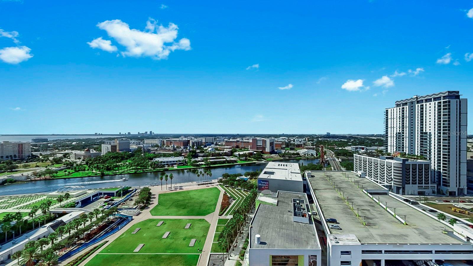Experience elevated urban living in this corner 2-bedroom, 2-bath residence on the 17th floor of SkyPoint, showcasing a PRIVATE WEST FACING balcony offers daily sunset unobstructed panoramic views through the 14' floor to ceiling IMPACT GLASS to Tampa Bay, the Downtown skyline, Hillsborough River, Curtis Hixon waterfront Park, University of Tampa; one of the most distinctive and upscale condos in the heart of Downtown Tampa! The sophisticated design interior spans at 1110 sf, thoughtfully upgraded with renovated wood plank tile flooring throughout, refined industrial-style concrete ceilings, remote operated Sunshades, fresh interior paint, and a true split-bedroom layout offering privacy and flexible living. Enter through a generous 10'.5" foyer leading to the chef inspired kitchen features GE Profile stainless steel appliances, a waterfall-edge island with extended breakfast bar seating, custom cabinetry with spice pull-out, expanded drawer storage, tile backsplash, pendant and recessed lighting, custom hardware, and a touchless Moen faucet overlooking the perfect entertainment/living room space with optional dining open to the spacious balcony with unobstructed views. This split floorplan offers an oversized Primary suite with a 3-foot architectural kick-out/ledge, expansive tall vanity DUAL sterling Sinks, Private Garden soaking tub, separate walk-in glass encased shower with WALK-IN CLOSET! Both bedrooms feature private en-suite bathrooms/Guest Suite or Ensuite OPTION with Linen Closet! Entire unit offers floor-to-ceiling breathtaking backdrops! Additional features include Hampton Bay ceiling fans, floor outlets for flexible furniture placement, Walk-in Pantry, Laundry Closet including new Maytag Washer/Dryer plus amble storage. SkyPoint provides unmatched amenities including 24-hour concierge, controlled building access, billiards room, theater room, club lounge, grilling stations, fire pits, and multiple indoor and outdoor social spaces. Saltwater hot tub, Pool, Outdoor grilling stations, Outdoor kitchen, and a beautifully landscaped park in the sky. State-of-the-art dual fitness center, a residents' clubhouse with a catering kitchen & bar, lounges, and a private theater room. Embrace the city's best attractions, with easy access to the trolley, water taxi, and Tampa International Airport. This meticulously renovated residence is your gateway to the very best of Tampa, offering a turnkey experience in a world-class location. Two assigned parking spaces in the secured garage are included. Located in the heart of Downtown Tampa, steps from public transit, the Tampa Riverwalk, Curtis Hixon Park, Straz Center, Amalie Arena, Armature Works, Water Street, Channelside, restaurants, and cultural venues. Pet friendly building. Condo fee includes; maintenance, roof, trash, water/sewer and cable! The ground floor is home to a variety of dining options, and the vibrant culture of Downtown Tampa—with its festivals Move-in ready and available for immediate occupancy. Book your exclusive SUNSET showing because this view deserves to be experienced in person.