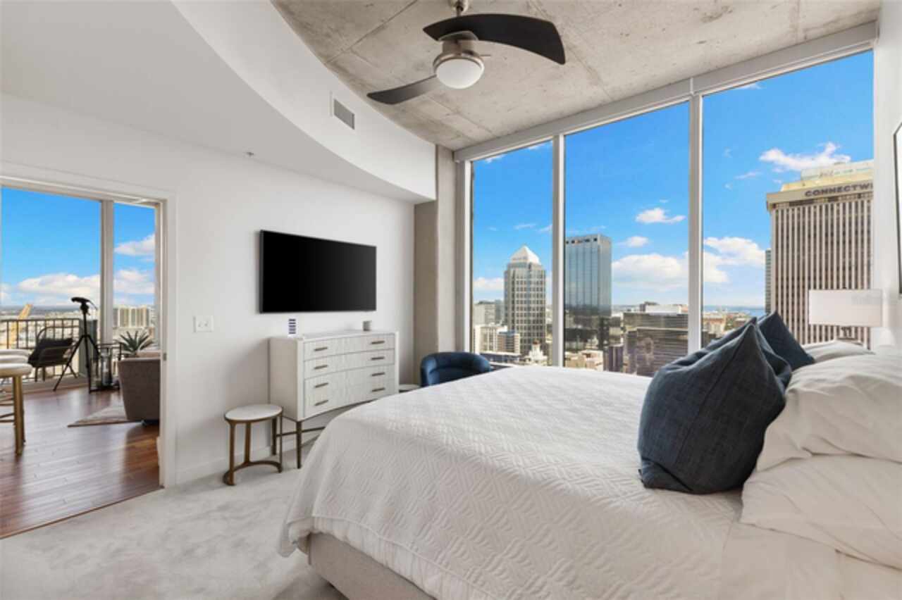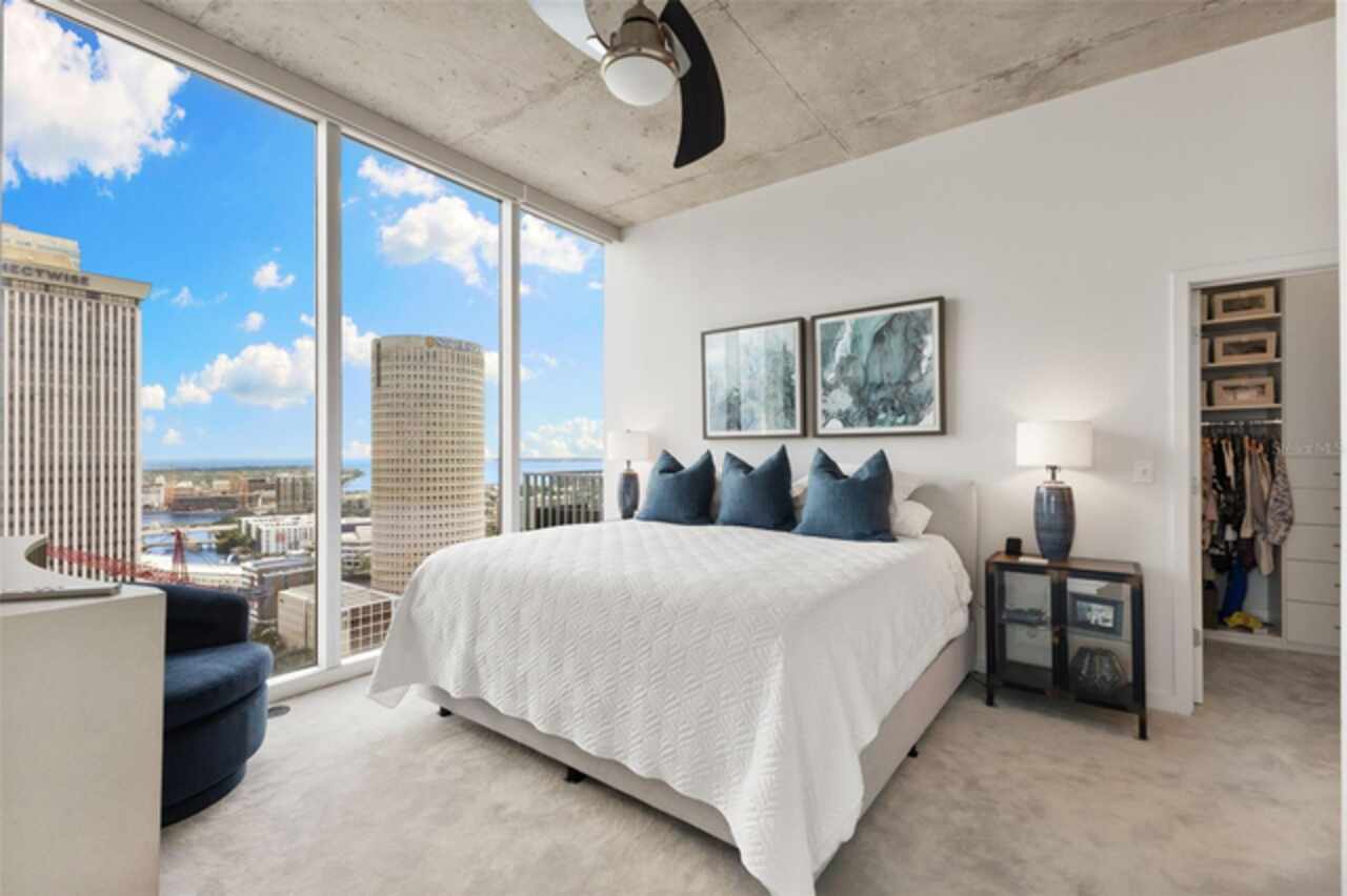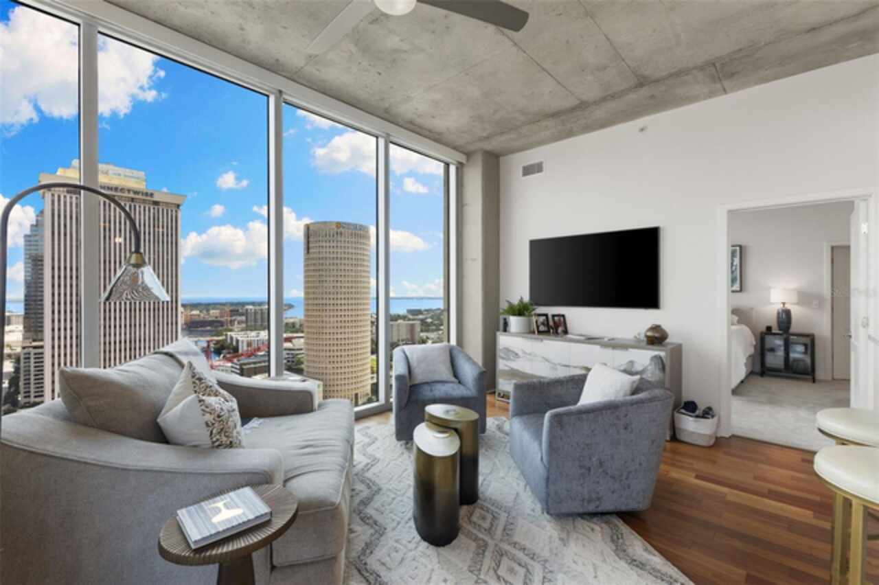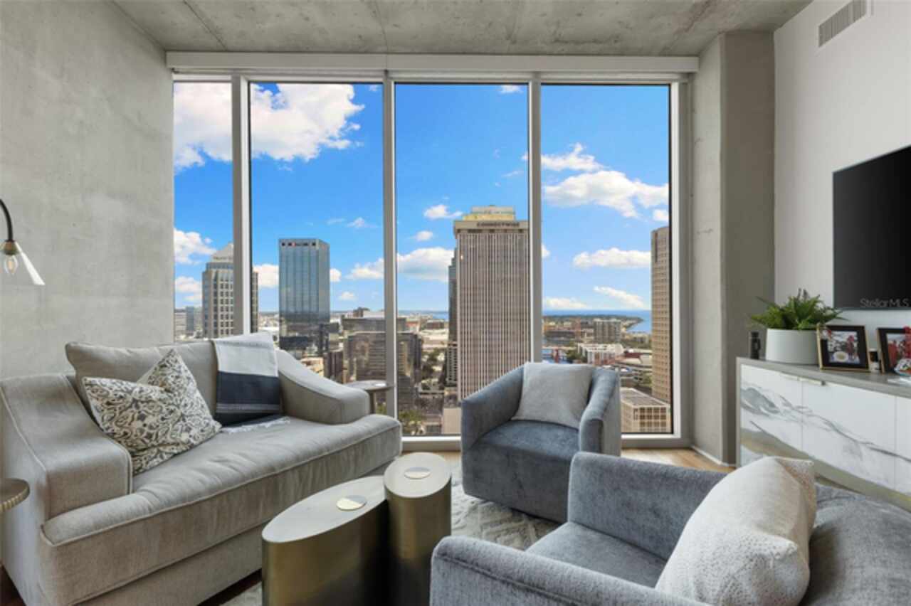 Welcome to a life of elevated urban luxury at SkyPoint, where the city’s most breathtaking views become your everyday backdrop. This rare 25th-floor corner residence has been completely reimagined by one of Tampa’s premier interior designers, offering a sophisticated two-bedroom, two-bathroom sanctuary. Ten-foot floor-to-ceiling windows frame unforgettable southern exposures of the downtown skyline, Tampa Bay, the Hillsborough River, and the Garrison Channel, inviting you to greet the day with majestic sunrises from your private balcony. The transformation is immediate, with wide-plank flooring flowing throughout the main living areas and plush carpeting in the bedrooms, all selected for modern elegance. The thoughtful redesign includes integrated remote-controlled sunshades and a spacious layout perfect for both grand entertaining and daily living, featuring a dedicated dining area and an oversized laundry room with ample storage. The renovated kitchen is a highlight, appointed with fresh quartz countertops, a sleek tile backsplash, new stainless-steel appliances, and a central island. Your residence includes two conveniently assigned parking spaces on the third floor of the secured garage. SkyPoint itself redefines resort-style living, with a 24-hour concierge and controlled access ensuring privacy and security. The eighth-floor amenity deck features a heated pool, a saltwater hot tub, multiple outdoor grilling stations, an outdoor kitchen, and a beautifully landscaped park in the sky. Inside, find a state-of-the-art dual fitness center, a residents' clubhouse with a catering kitchen and bar, lounges, and a private theater room. Embrace the vibrant energy of downtown Tampa from your front door, with the cultural arts district, Curtis Hixon Park, and the Tampa Riverwalk directly outside. You are moments from the city's best attractions, with easy access to the trolley, water taxi, and Tampa International Airport. This meticulously renovated residence is your gateway to the very best of Tampa, offering a turnkey experience in a world-class location.