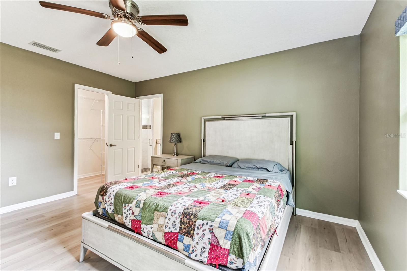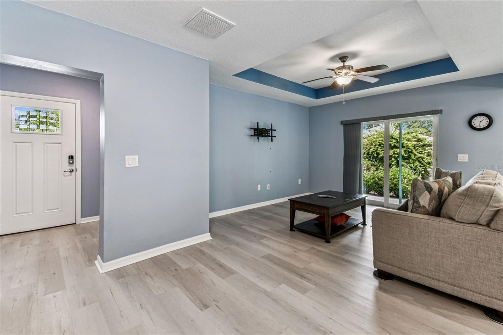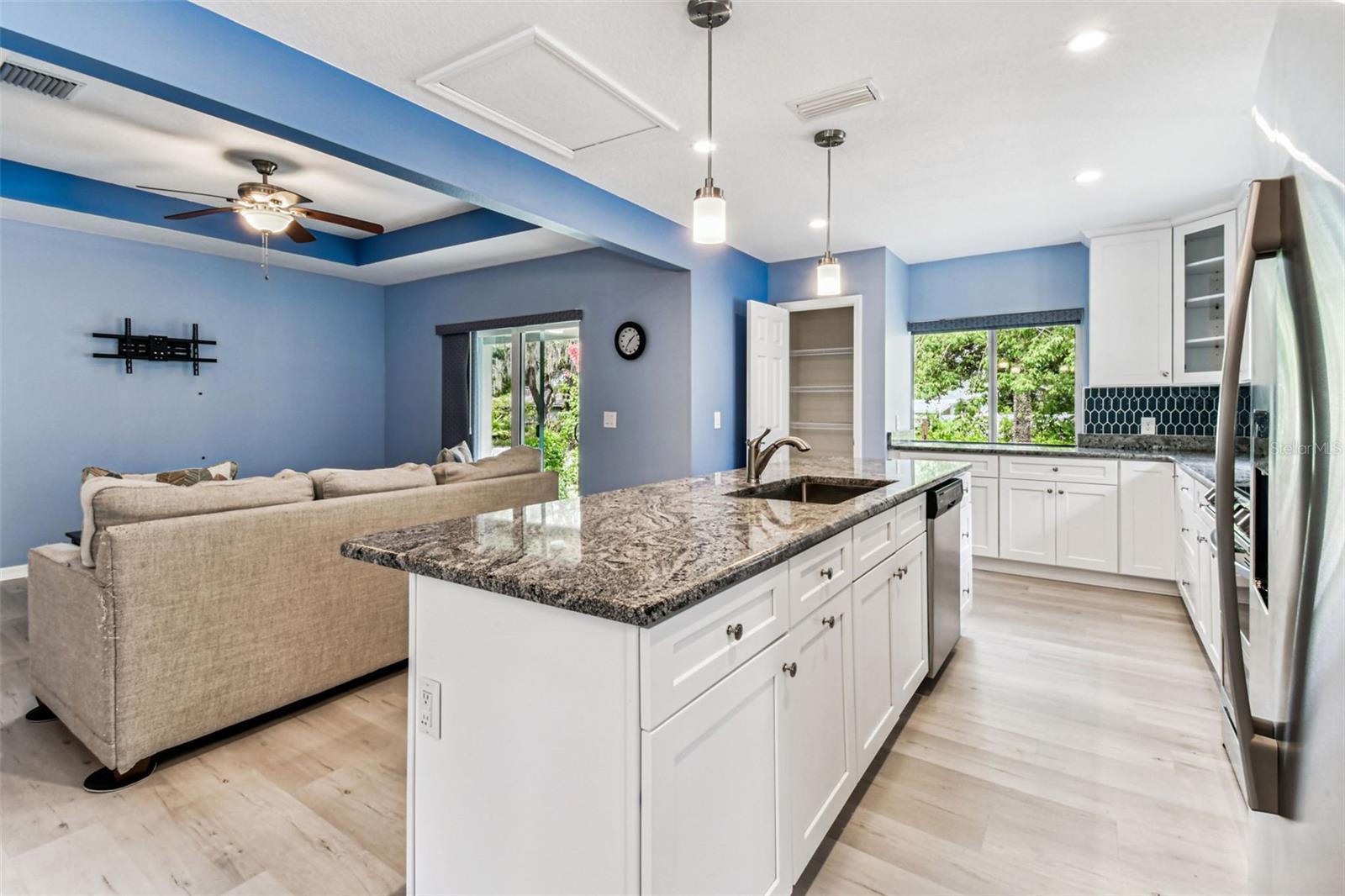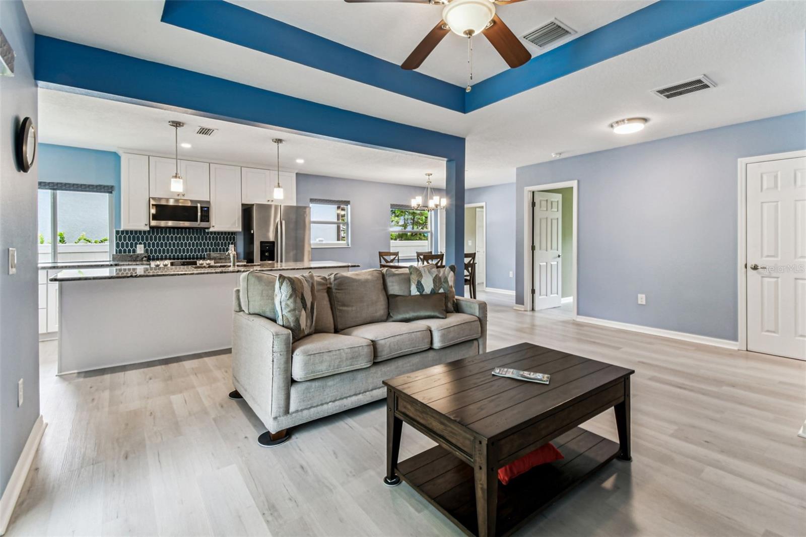 Ceiling Fans(s), High Ceilings, Kitchen/Family Room Combo, Living Room/Dining Room Combo, Open Floorplan, Solid Surface Counters, Split Bedroom, Stone Counters, Thermostat, Tray Ceiling(s), Walk-In Closet(s), Window Treatments