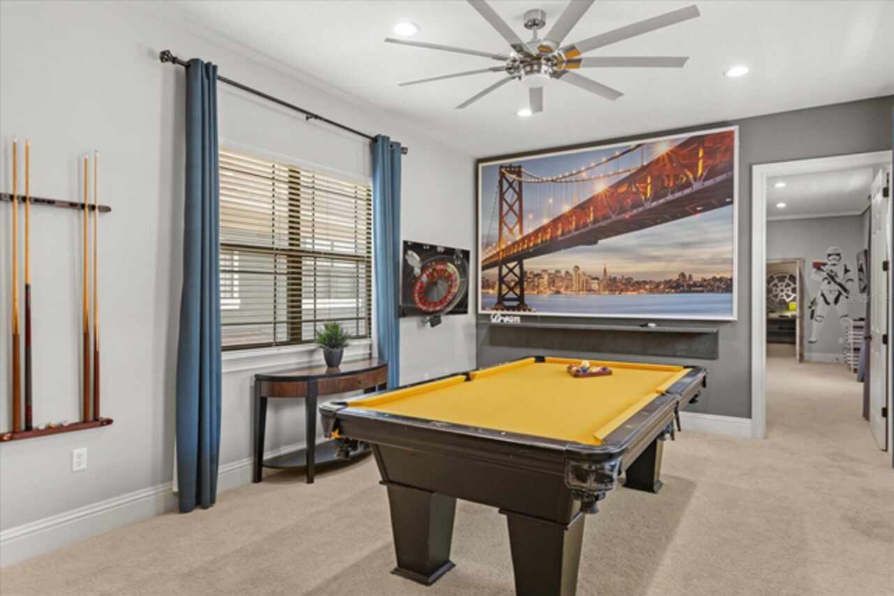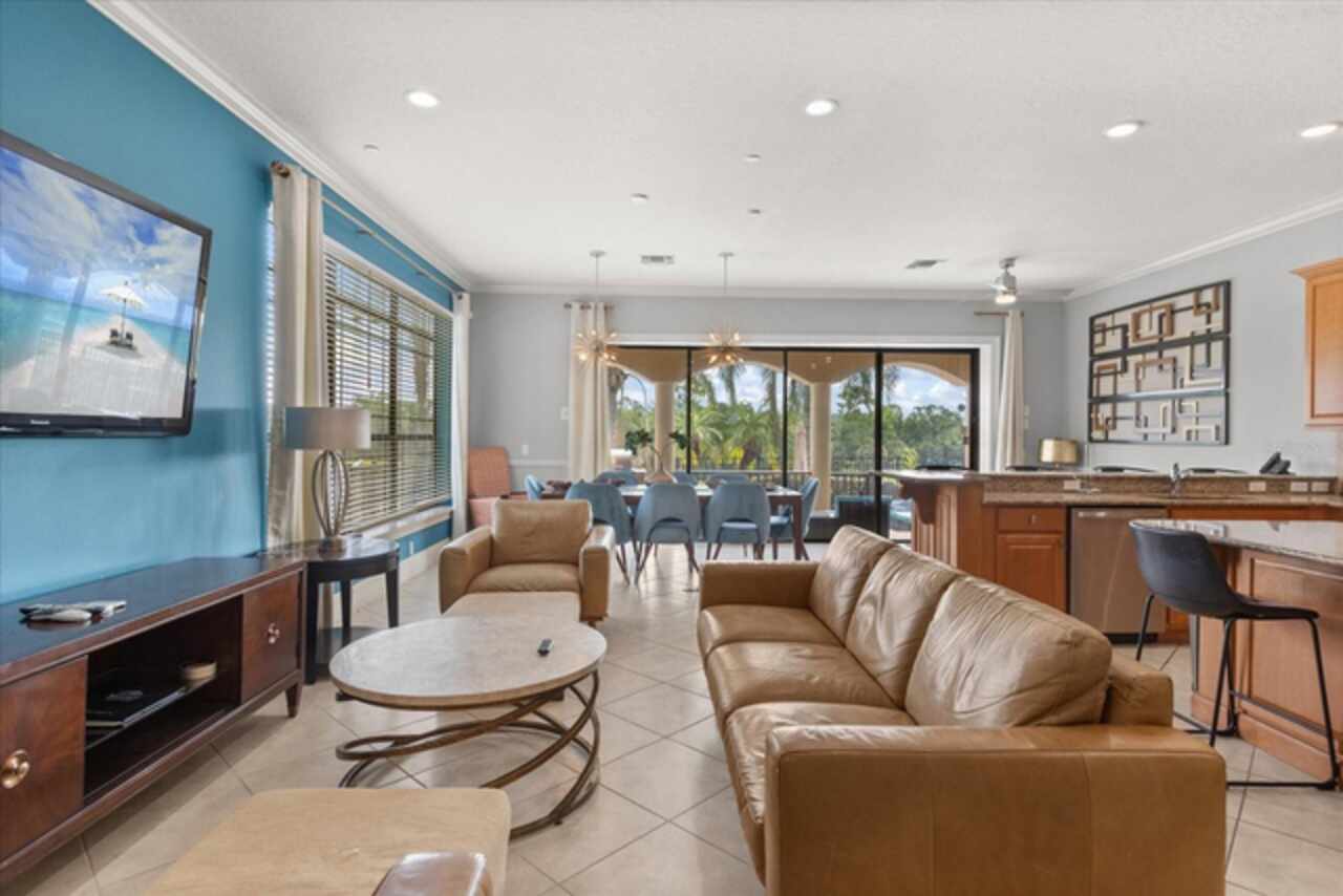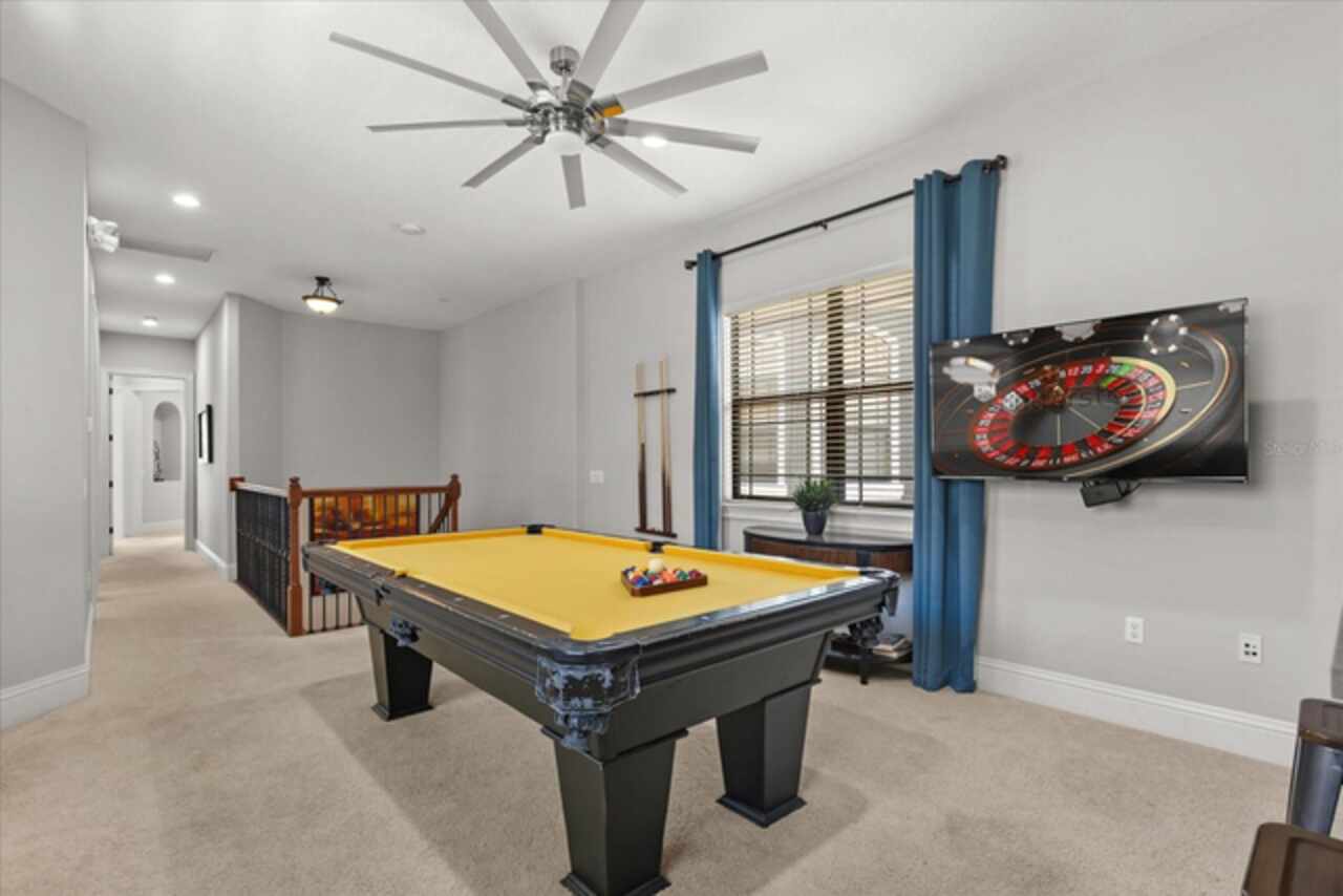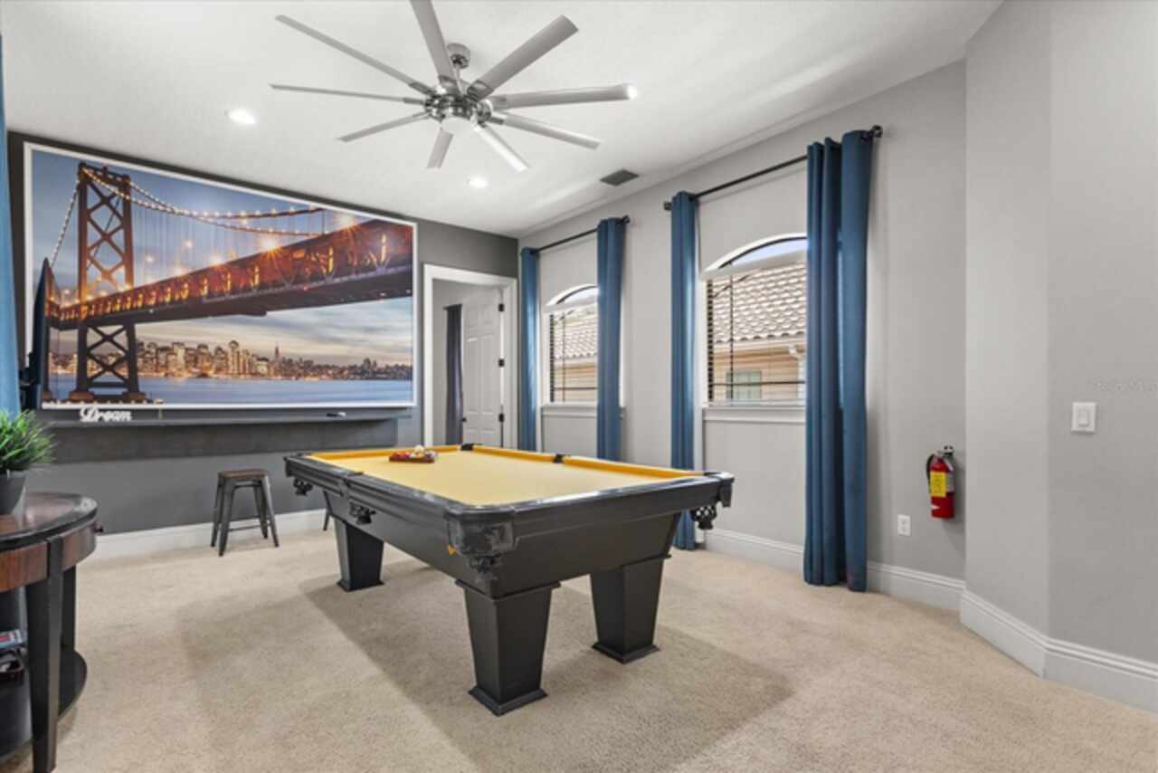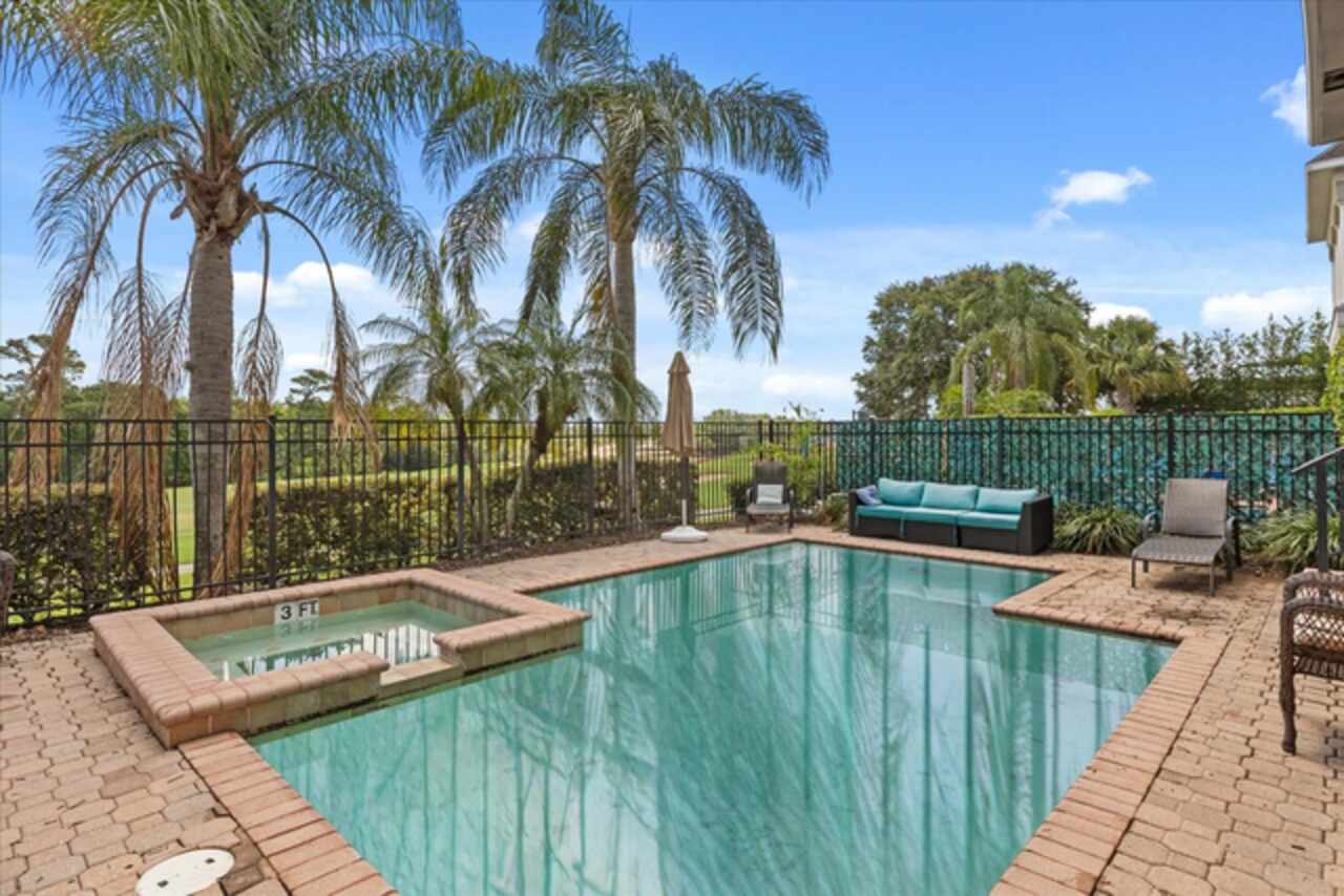 **Active Reunion Club Membership**new roof 2023** Welcome to the renowned guard-gated community of Reunion Resort, where luxury living meets breathtaking scenery. Positioned with golf course frontage of the 15th fairway of the signature Jack Nicklaus golf course, this 6 bed 4.5 bath home is the ultimate golfers retreat. As you approach the home you will be greeted by a spacious courtyard, already set up to be one of many private, relaxing areas in this home. From the courtyard there are private entrances to the mother in law suite, garage, and also a private entrance to another one of the 6 bedrooms in this home. Entering the home you will immediately notice the upgraded finishes that were included in this home to including crown molding throughout, large tile diamond laid, covering the entire common areas of the first floor of the home, custom built ins which surround a fireplace, and the open concept kitchen/living area. The kitchen features abundant cabinet space, granite countertops, and a large island featuring a prep sink. The kitchen opens up to the family room/dining room area, making entertaining a breeze. Large sliding glass doors open up to your backyard pool oasis with golf course views, complete with an outdoor grill area and large pool/Hottub, you are sure to make many happy memories here. Heading upstairs, as you enter into the large loft area, you will find it complete with a pool table, bar top area and tv, the loft area provides a comfortable area for friends & family to gather and enjoy time together. To the far front of the home you will find the bunk room for the little ones, recently renovated to include built in bunk beds, complete with led lighting, and a secret gaming room, complete with two gaming console stations, this room is sure to keep the little ones busy. To the rear of the upstairs you will find two other guest rooms, and the primary bedroom to the rear of the home. The primary bedroom is massive, featuring a large en-suite bathroom, complete with a shower, garden tub, and dual vanities. The primary bedroom also features a private balcony, giving you a birds eye view of the pool area and golf course. Reunion Resort is a top choice for visitors of all ages, Featuring 12 Pools In The Community, Including a multimillion dollar water park, 3 championship golf courses, 5 restaurants, tennis/pickleball courts, putt putt golf, and many more amenities, making Reunion truly a city within gates. This home is being sold fully furnished, and is turnkey, with so much more to love, that you will have to see in person to appreciate. This exceptional home combines luxury, comfort, and breathtaking views in one of Orlando’s most sought-after communities, it’s truly a private retreat in the heart of Reunion Resort. It is now your turn to call Reunion Resort your new home, or home away from home, welcome home.