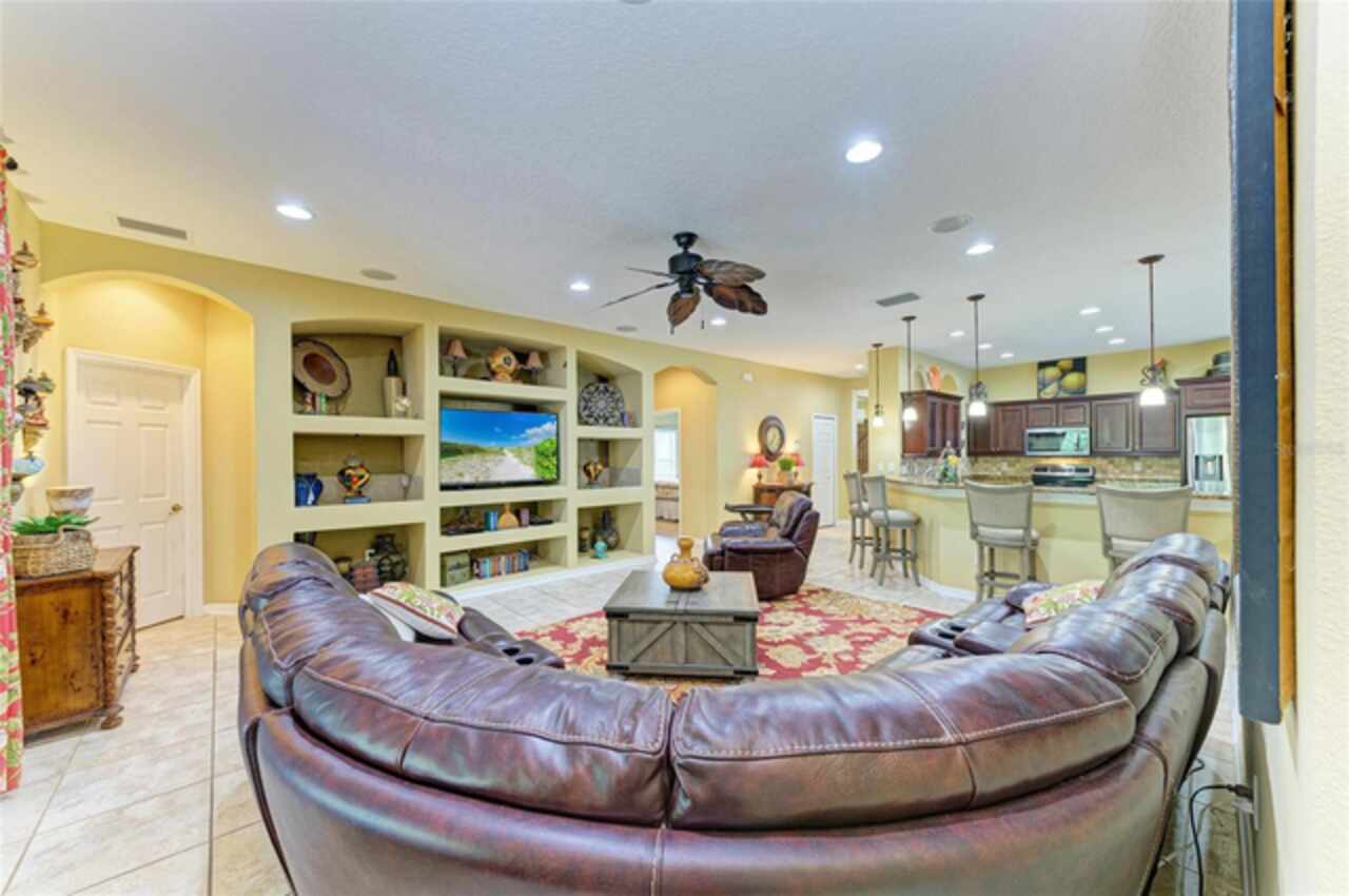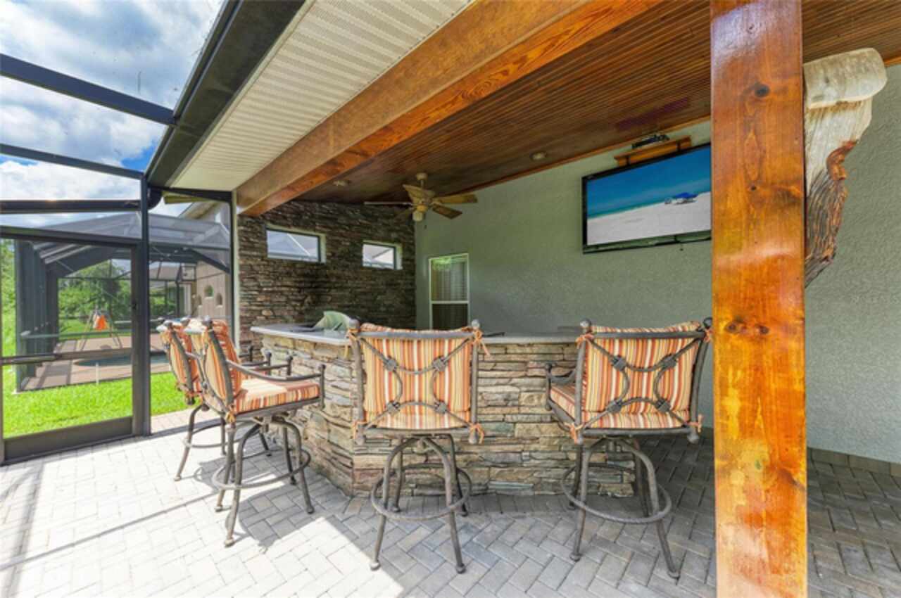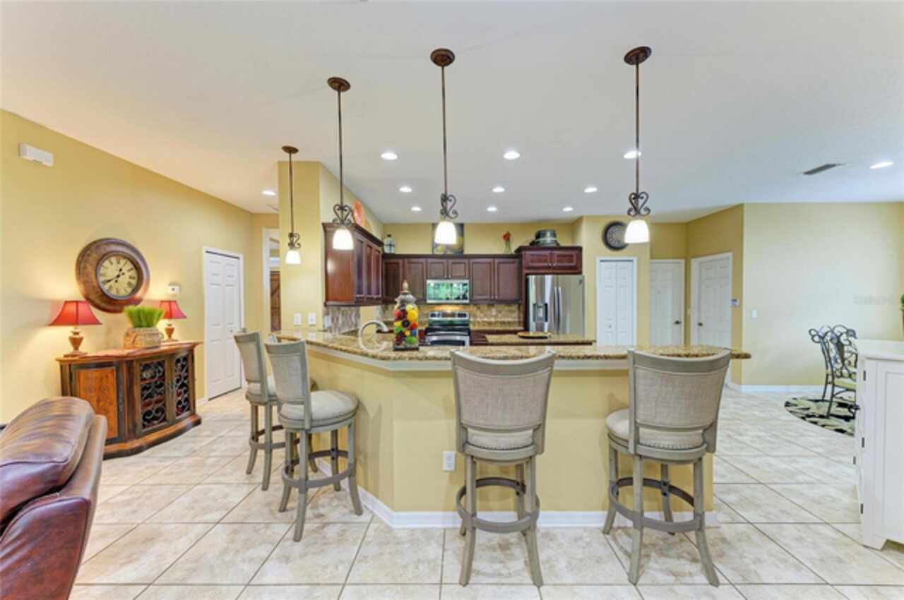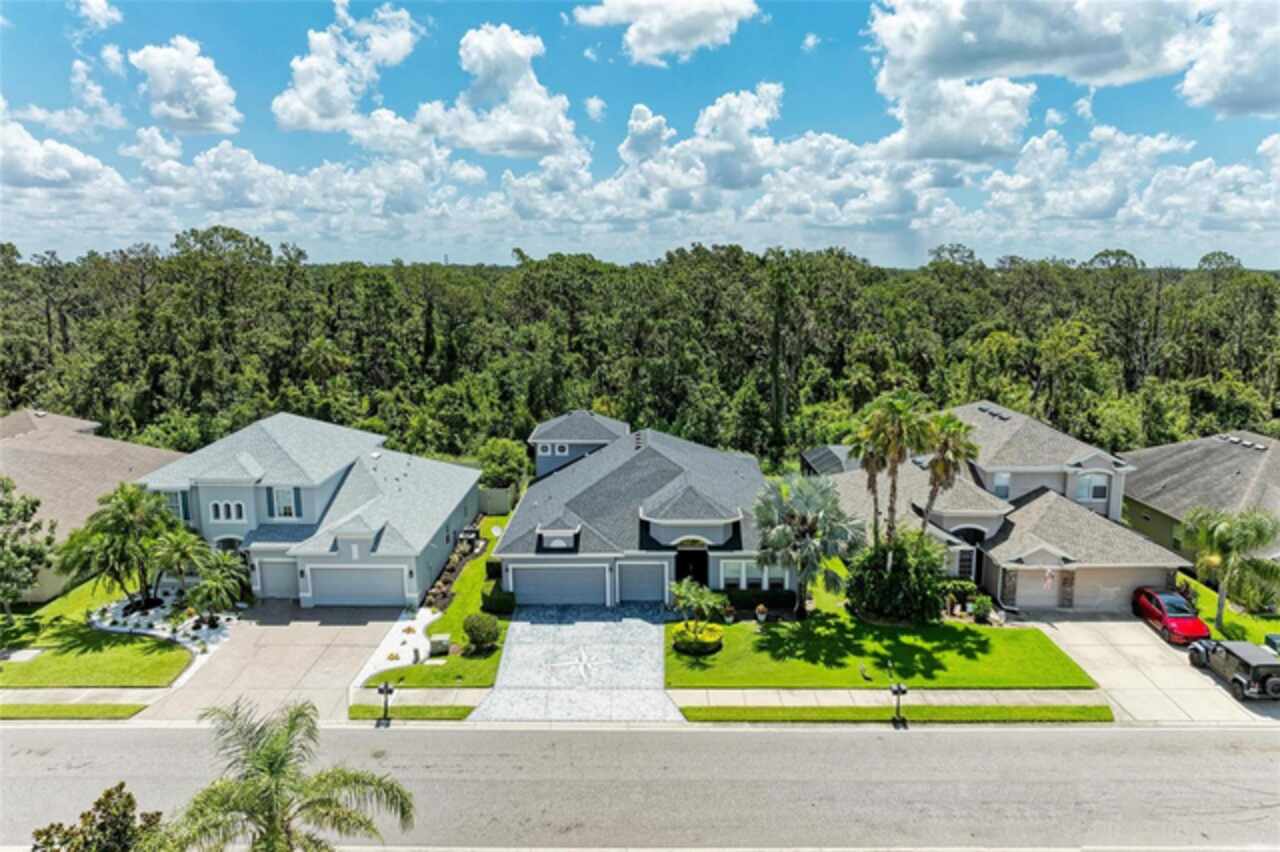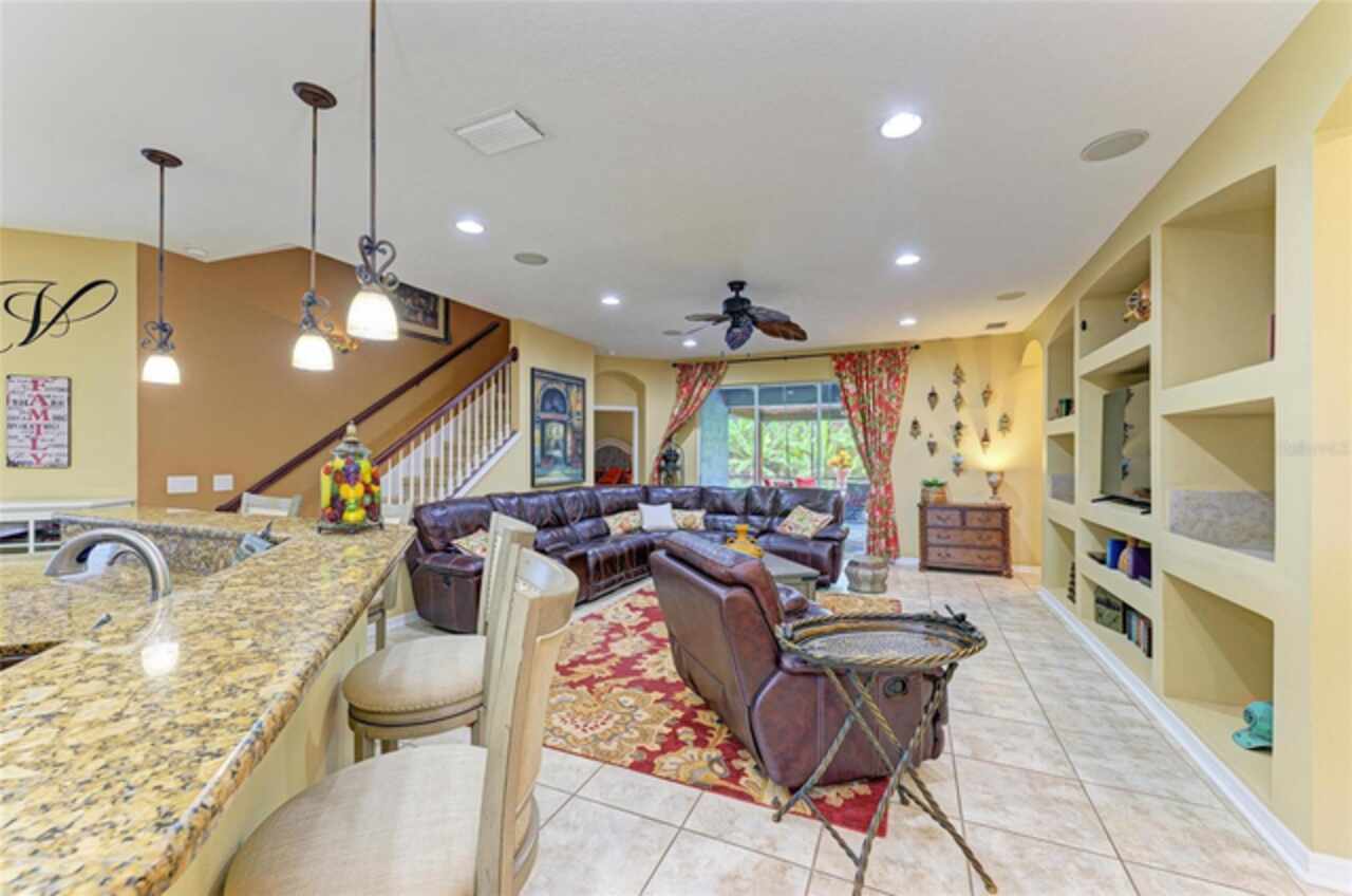 Welcome to this stunning 4-bedroom, 3-bathroom home, featuring a den with sliding barn doors and a spacious bonus room, all nestled on a private preserve lot. Enjoy outdoor living at its finest with an extended lanai that includes a portable hot tub, gas firepit table, and a fully equipped outdoor kitchen with grill, refrigerator, sink, and a large bar—perfect for entertaining. Inside, the gourmet kitchen boasts dark cabinetry with crown molding and valance, undercabinet lighting, granite countertops, center island, stainless steel appliances, and a reverse osmosis system. A large breakfast bar opens to the spacious great room, which features custom built-in shelving and TV unit and overlooks the lanai. The primary suite, located on the main floor, offers two closets and a luxurious bath with granite dual vanities, walk-in shower, and a jetted soaking tub. Bedrooms feature cozy carpeting, while tile flooring runs throughout the main living areas. Updates include new roof 2023, HVAC 2019, a buried 120-gallon propane tank connected to firepit 2019, water heater 2020, water purification system, exterior painting to include etched driveway. Community amenities include a clubhouse, pool, fitness center, playground, and sports court. HOA includes basic cable and internet. Situated in a highly desirable location with easy access to St. Pete, Tampa, Downtown Sarasota, and just minutes from Parrish Community Park, Ellenton Outlet Mall, UTC shopping, and the new Publix Plaza featuring Foxtail Coffee, restaurants, and services. Future developments in the area include a 200-bed trauma hospital, Home Depot, Chick-fil-A, Slim Chickens, and access to an exciting Lagoon community.