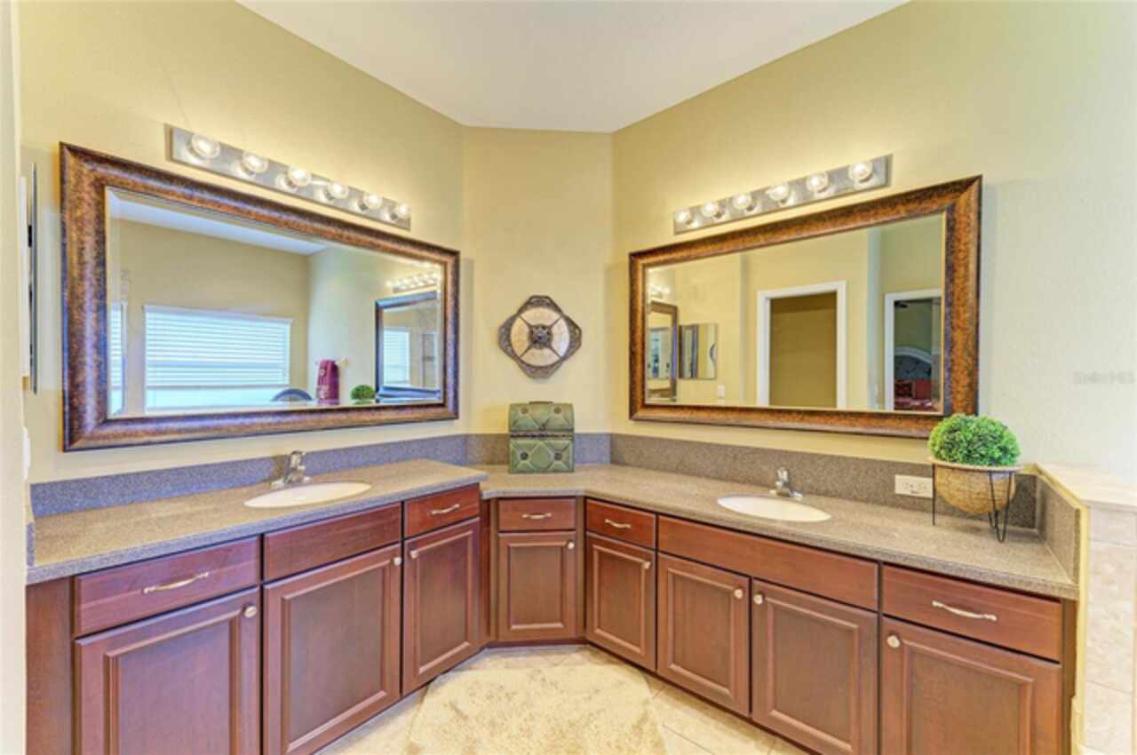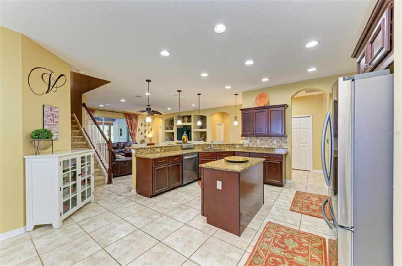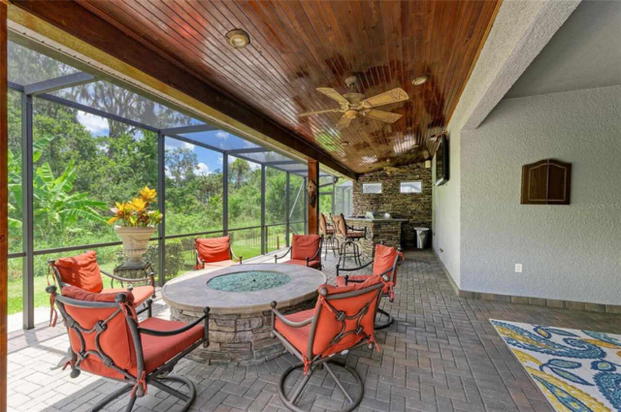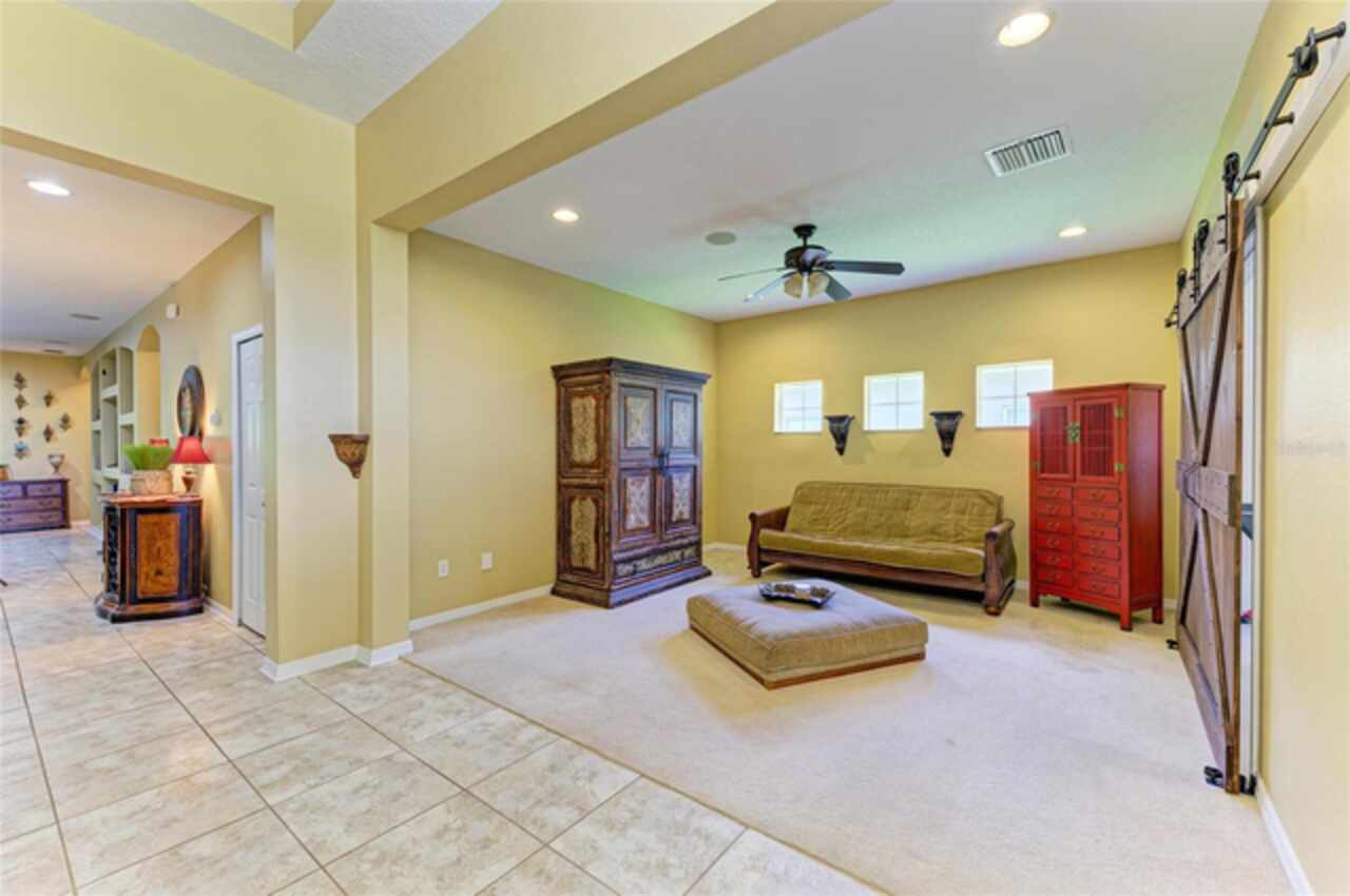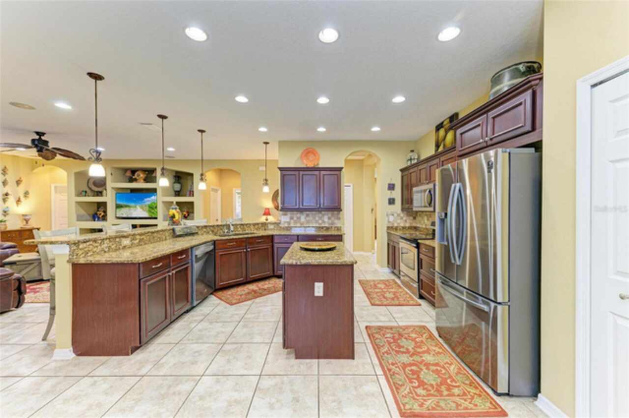 Welcome to this stunning 4-bedroom, 3-bathroom home, featuring a den with sliding barn doors and a spacious bonus room, all nestled on a private preserve lot. Enjoy outdoor living at its finest with an extended lanai that includes a portable hot tub, gas firepit table, and a fully equipped outdoor kitchen with grill, refrigerator, sink, and a large bar—perfect for entertaining. Inside, the gourmet kitchen boasts dark cabinetry with crown molding and valance, undercabinet lighting, granite countertops, center island, stainless steel appliances, and a reverse osmosis system. A large breakfast bar opens to the spacious great room, which features custom built-in shelving and TV unit and overlooks the lanai. The primary suite, located on the main floor, offers two closets and a luxurious bath with granite dual vanities, walk-in shower, and a jetted soaking tub. Bedrooms feature cozy carpeting, while tile flooring runs throughout the main living areas. Updates include new roof 2023, HVAC 2019, a buried 120-gallon propane tank connected to firepit 2019, water heater 2020, water purification system, exterior painting to include etched driveway. Community amenities include a clubhouse, pool, fitness center, playground, and sports court. HOA includes basic cable and internet. Situated in a highly desirable location with easy access to St. Pete, Tampa, Downtown Sarasota, and just minutes from Parrish Community Park, Ellenton Outlet Mall, UTC shopping, and the new Publix Plaza featuring Foxtail Coffee, restaurants, and services. Future developments in the area include a 200-bed trauma hospital, Home Depot, Chick-fil-A, Slim Chickens, and access to an exciting Lagoon community.